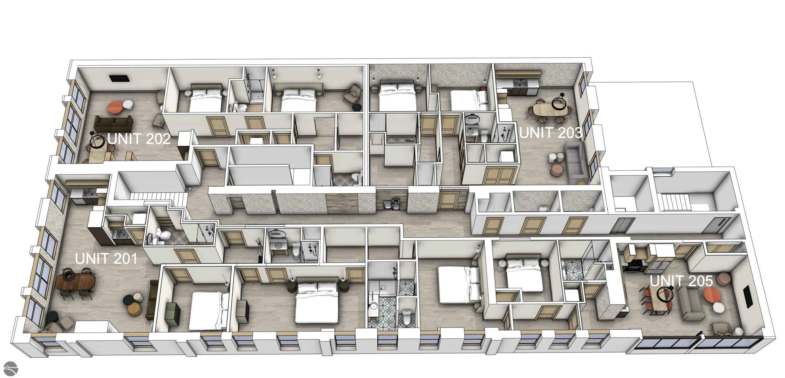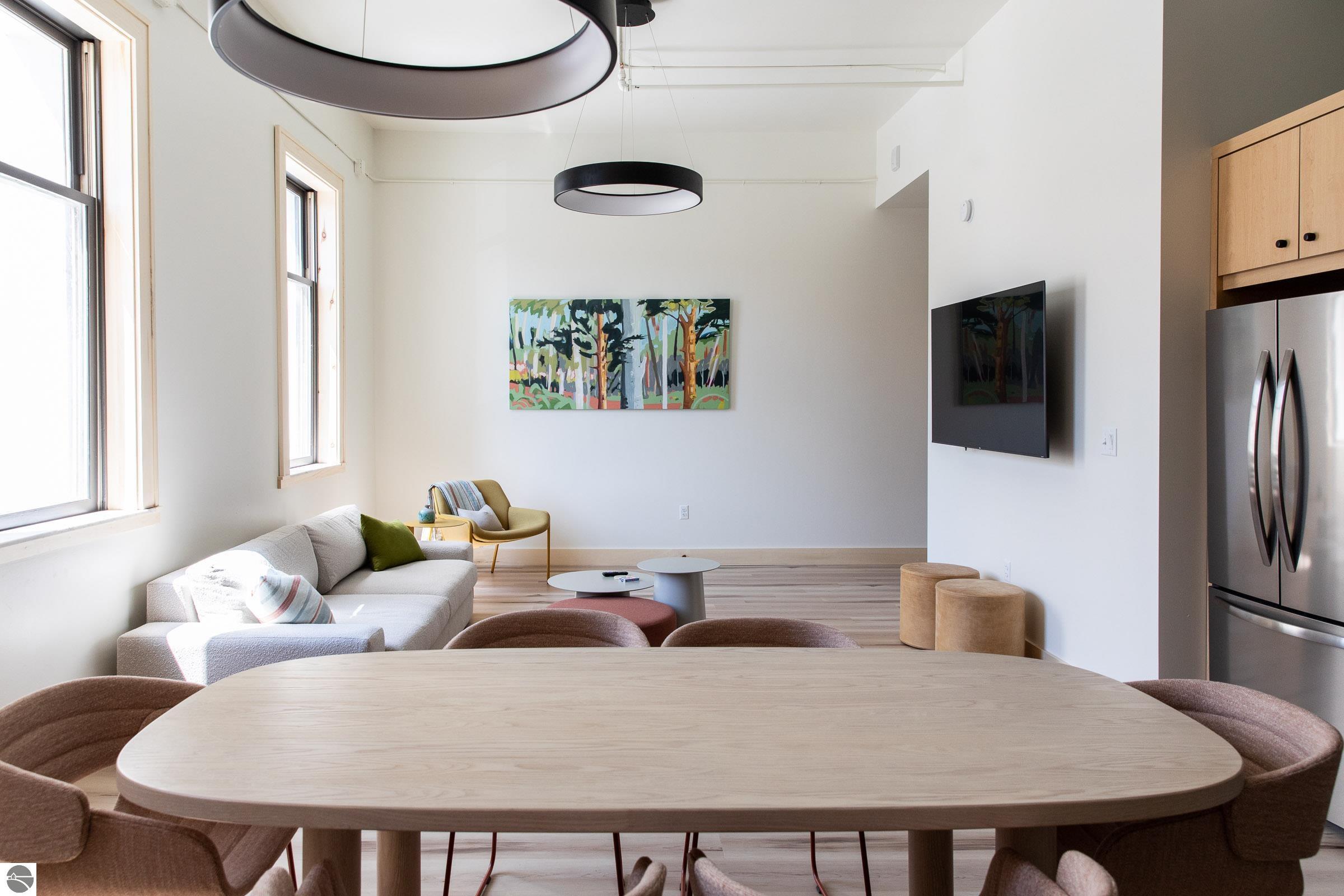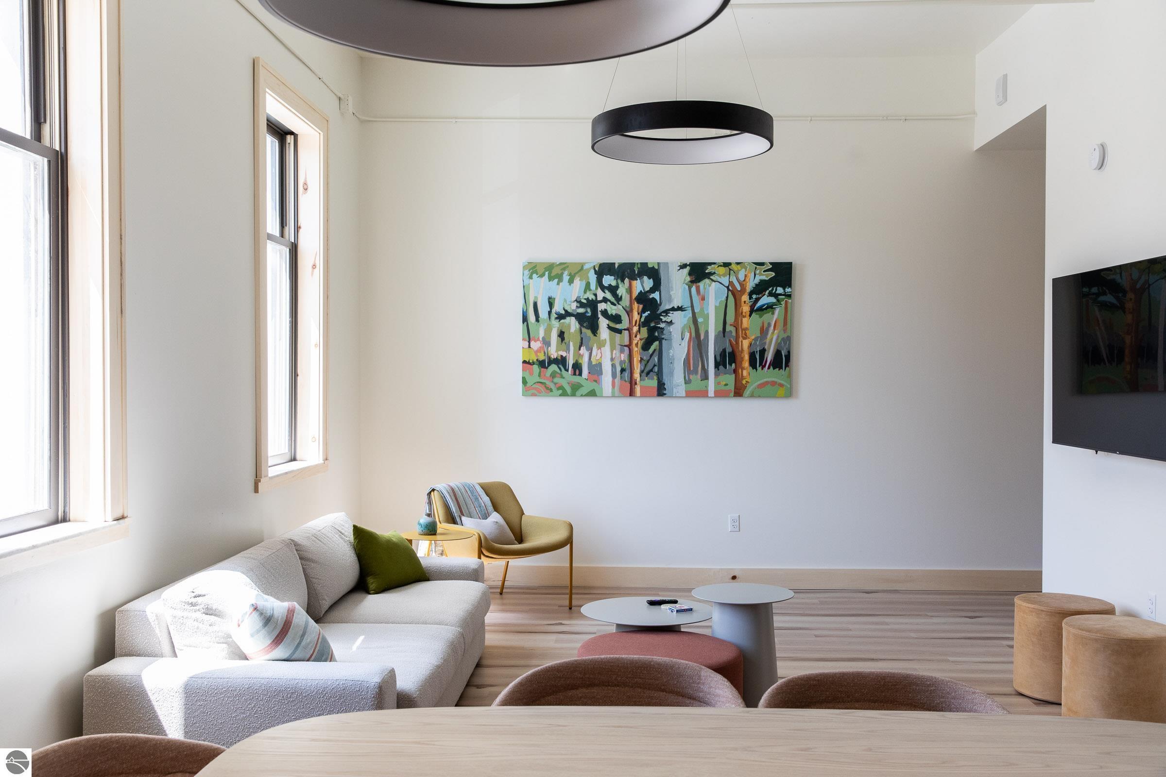 Introducing The Flats at Front + Union, a rare collection of seven residences nestled within the historic building at 100 East Front St, one of Traverse City's most iconic corners. Each flat has been thoughtfully designed to honor the history and character of the building while blending in the comfort of modern luxury and an unmistakable urban feel. These beautiful flats range from spacious 2-bedroom, 2-bath to 3-bedroom, 3-bath layouts, including two stunning corner signature flats. These special corner flats boast dramatic floor-to-ceiling windows, capturing light and views of west bay and the perfect vantage point to take in the heartbeat of downtown living. This collection is a rare opportunity in Traverse City offering elevator access to your floor, a leased private parking space right outside the building and a "coming soon" rooftop oasis. The over 3,000 square foot rooftop, designed by Environment Architects lead Ray Kendra will have private lounge spaces, an indoor/outdoor entertaining and cocktail kitchen and grilling stations -- all designed with unforgettable views. The Flats are modern simplicity at its best, six of the seven appointed spaces are being sold fully furnished -- right down to the furniture and bedding -- making them an effortless turnkey opportunity. The limited number inside this historic building will keep your investment strong while giving you peace of mind to lock and leave knowing the building is well cared for. Three thoughtfully designed entry points -- from the private parking area, Front Street, and Union Street -- provide convenient access for owners. Situated in the heart of downtown, The Flats at Front + Union are just steps from everything Traverse City has to offer. This 2023 complete renovation in one of Traverse City's most historic buildings was curated by a local family, designed by renowned local architect firm, Environment Architects and built to perfection by local contractors.