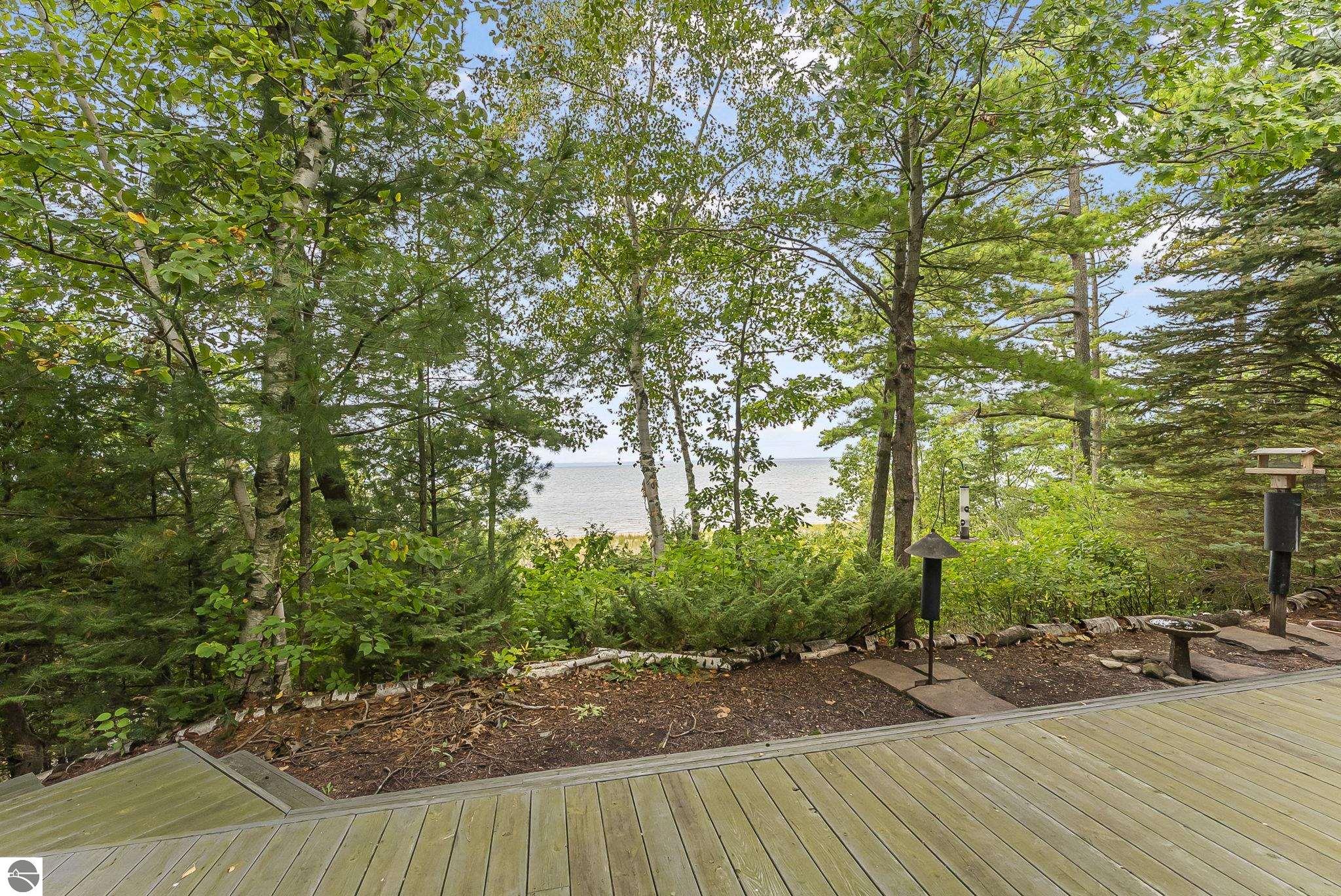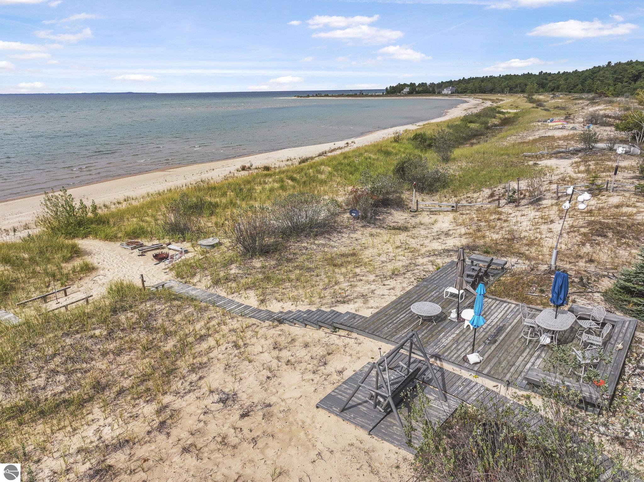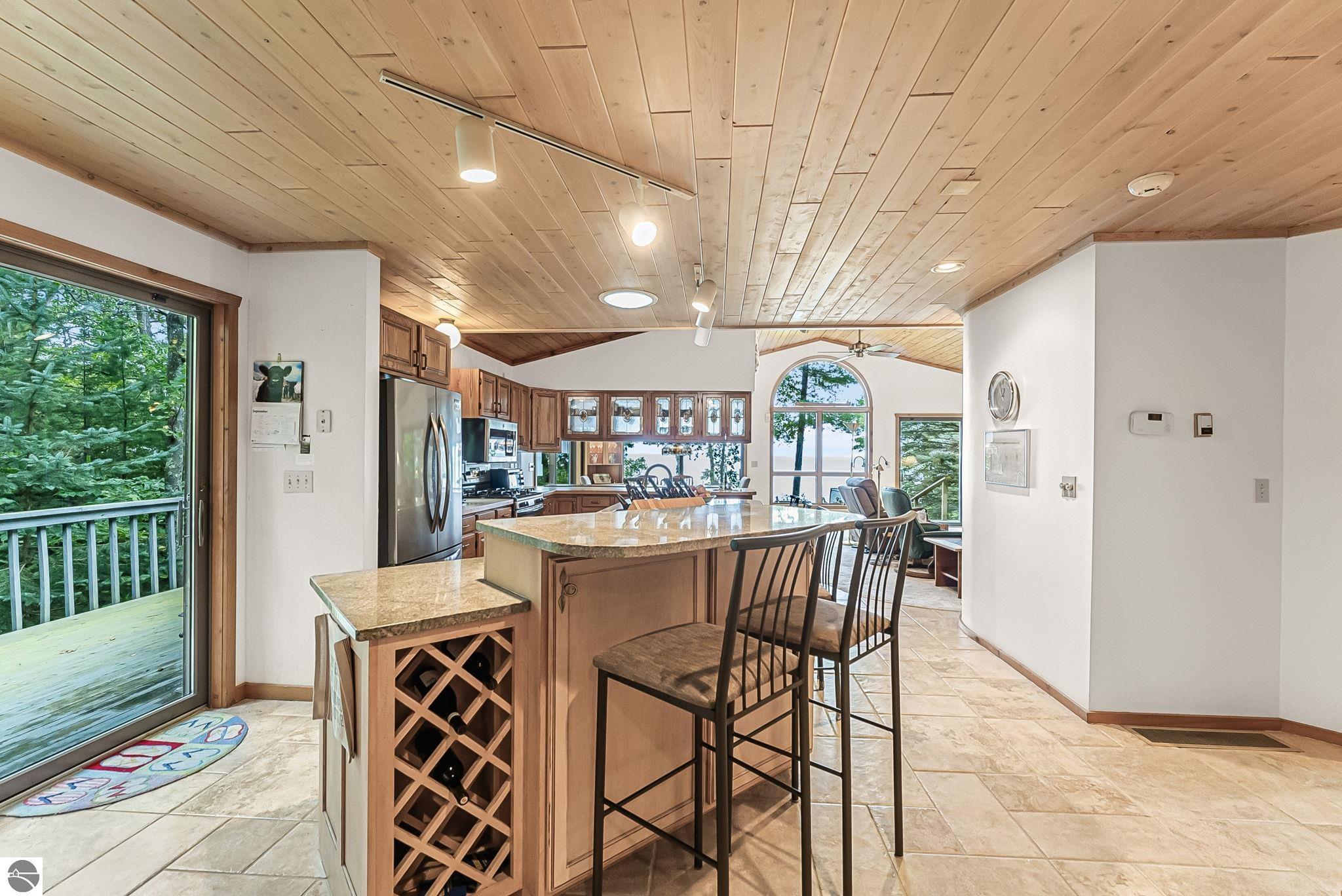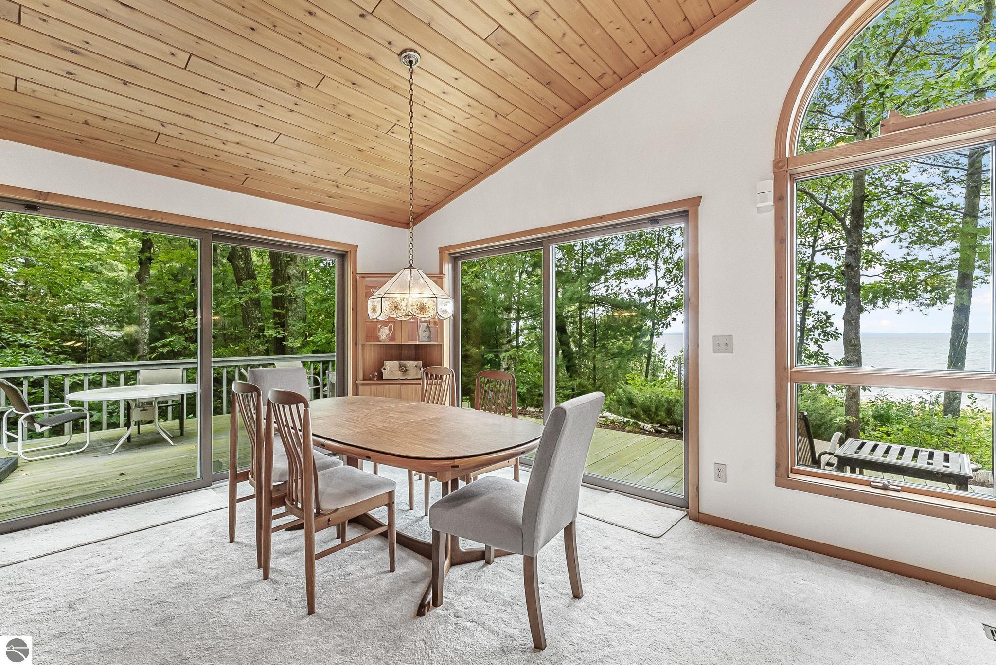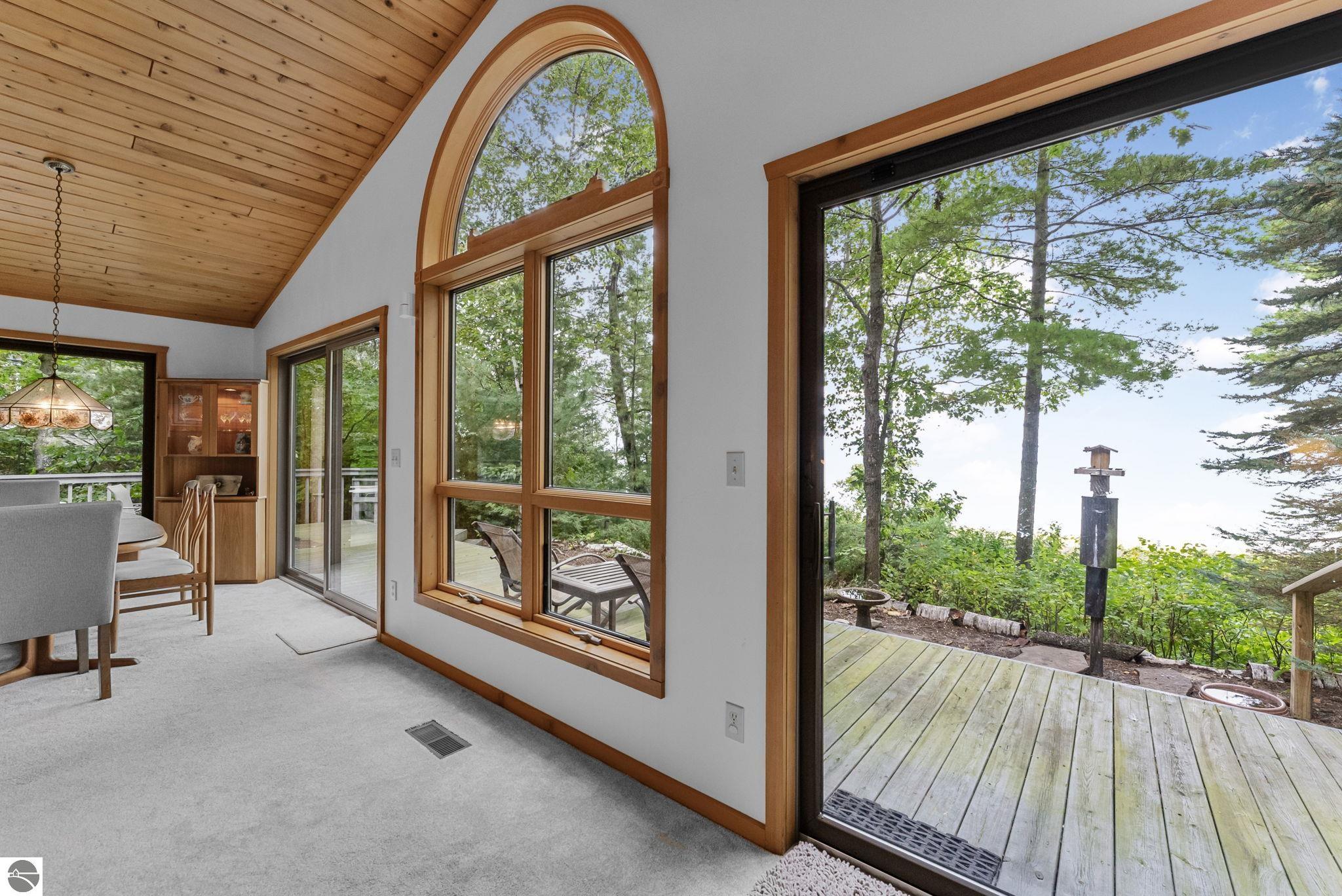 This stunning home along the coveted San Marino Trail in Kewadin--ideally located between Elk Rapids and Charlevoix--offers the perfect Up North retreat. Whether used as a primary residence or a vacation getaway, it blends privacy, comfort, and spectacular views of Grand Traverse Bay. Set on gorgeous, pristine frontage and surrounded by hardwoods, the property features expansive decks and outdoor living areas, combining seclusion with breathtaking scenery. Inside, the open design with soaring ceilings and walls of windows brings the outdoors in. The large kitchen flows seamlessly to a spacious living area and dining room, while multiple gathering spaces provide plenty of room for entertaining or relaxing. The thoughtful layout includes 2 main-floor bedrooms, four baths, and office space or potential for five bedrooms if needed. The lower level has a large living area with laundry and 2 additional bedrooms. A designated space for a future elevator supports aging in place, and a whole-house generator ensures peace of mind during inclement weather. This home truly has it all: stunning views, flexible living spaces, and an unbeatable location. Don't miss this rare opportunity.