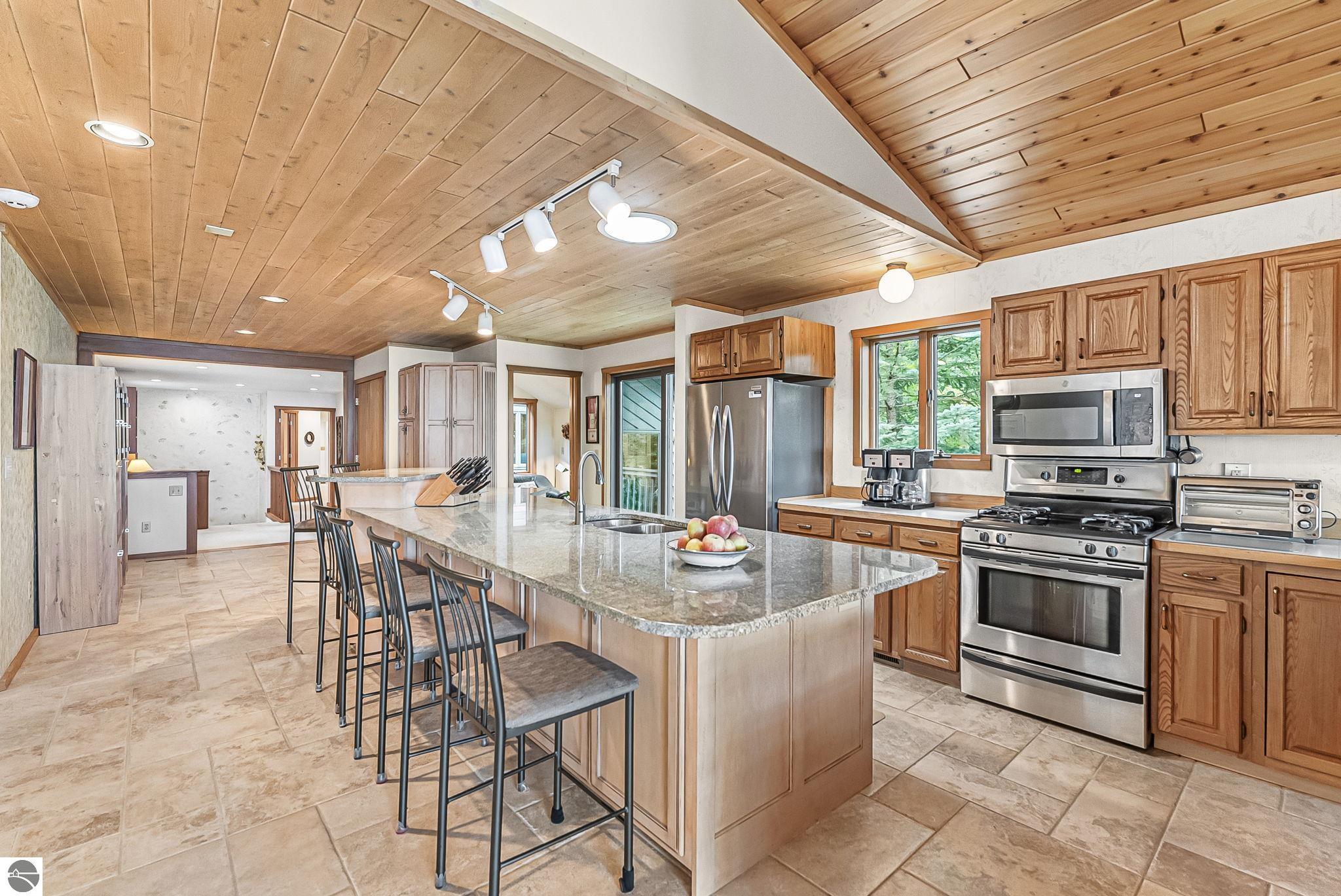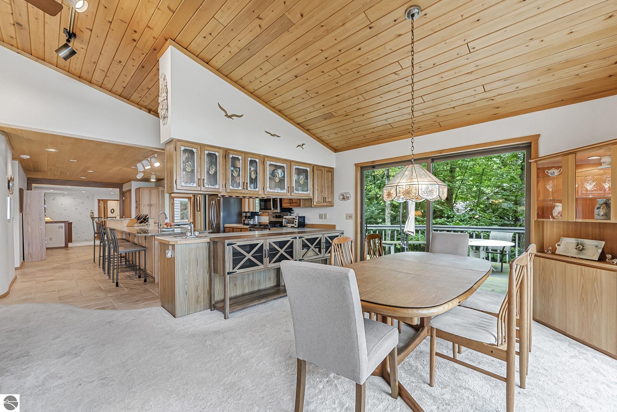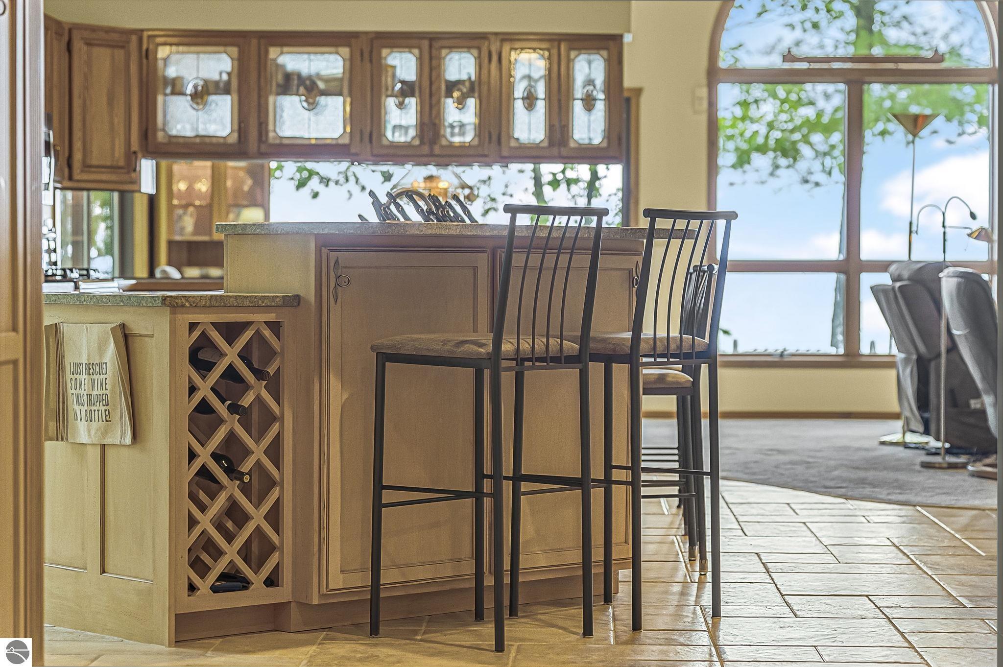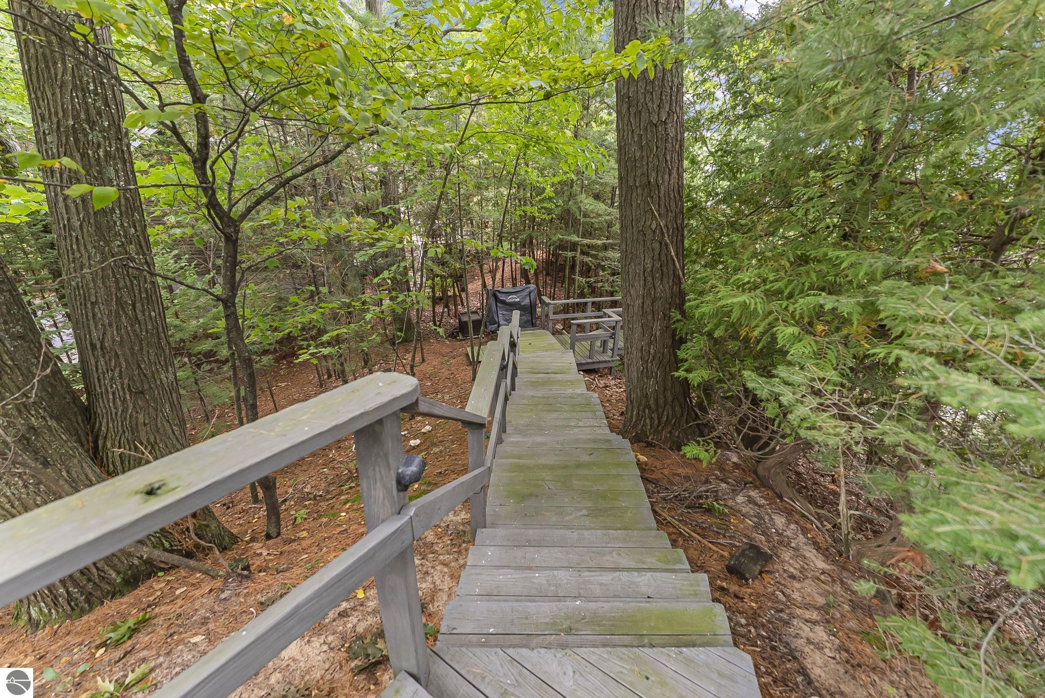 This stunning home along the coveted San Marino Trail in Kewadin--ideally located between Elk Rapids and Charlevoix--offers the perfect Up North retreat. Whether used as a primary residence or a vacation getaway, it blends privacy, comfort, and spectacular views of Grand Traverse Bay. Set on gorgeous, pristine frontage and surrounded by hardwoods, the property features expansive decks and outdoor living areas, combining seclusion with breathtaking scenery. Inside, the open design with soaring ceilings and walls of windows brings the outdoors in. The large kitchen flows seamlessly to a spacious living area and dining room, while multiple gathering spaces provide plenty of room for entertaining or relaxing. The thoughtful layout includes 2 main-floor bedrooms, four baths, and office space or potential for five bedrooms if needed. The lower level has a large living area with laundry and 2 additional bedrooms. A designated space for a future elevator supports aging in place, and a whole-house generator ensures peace of mind during inclement weather. This home truly has it all: stunning views, flexible living spaces, and an unbeatable location. Don't miss this rare opportunity.