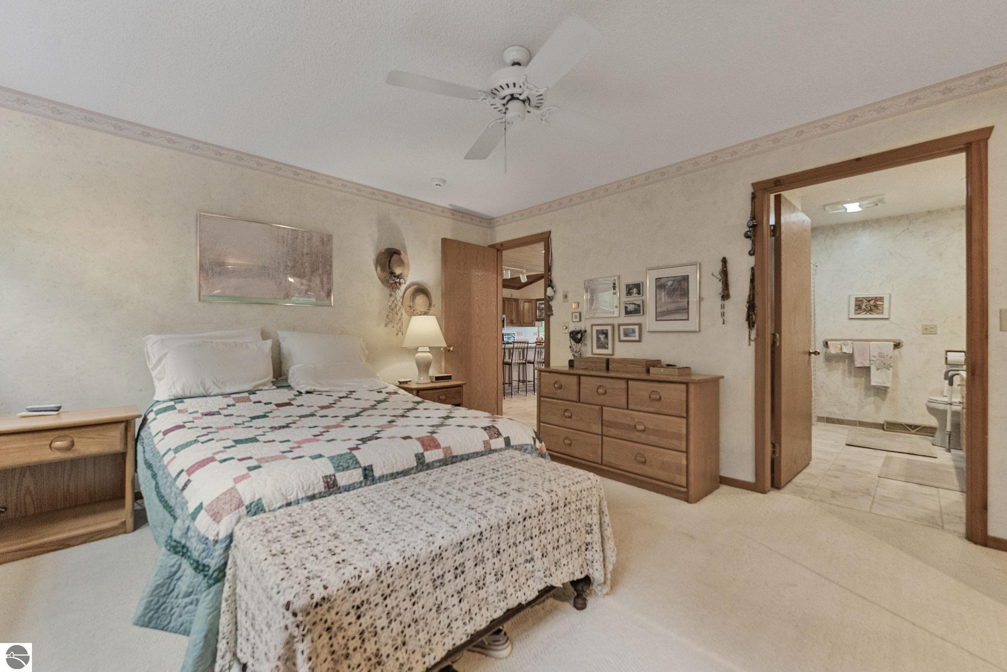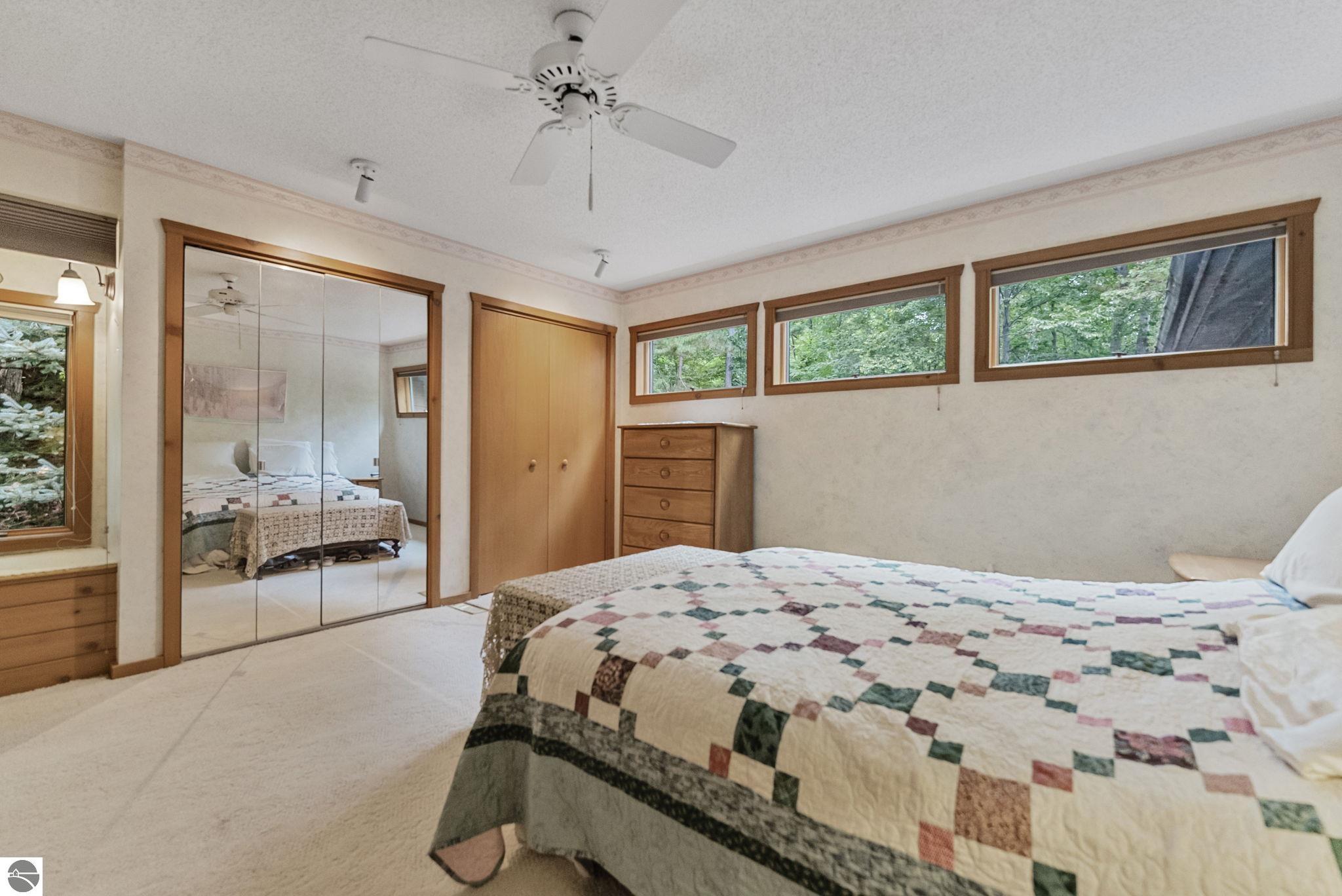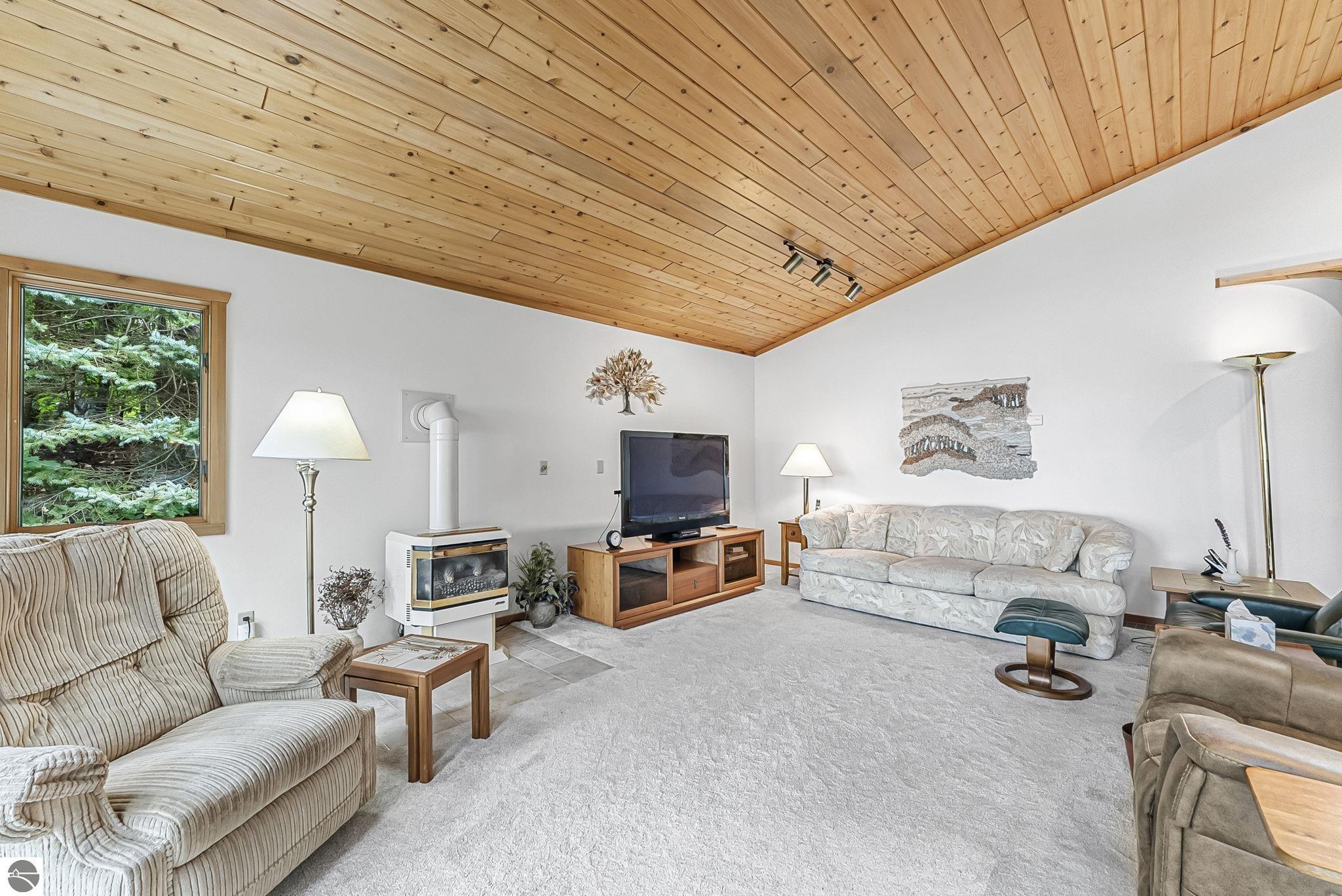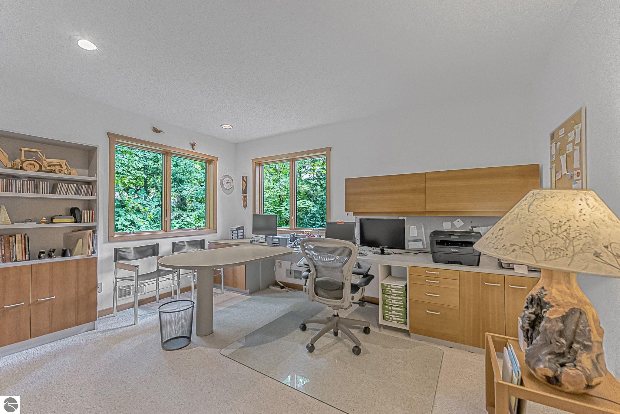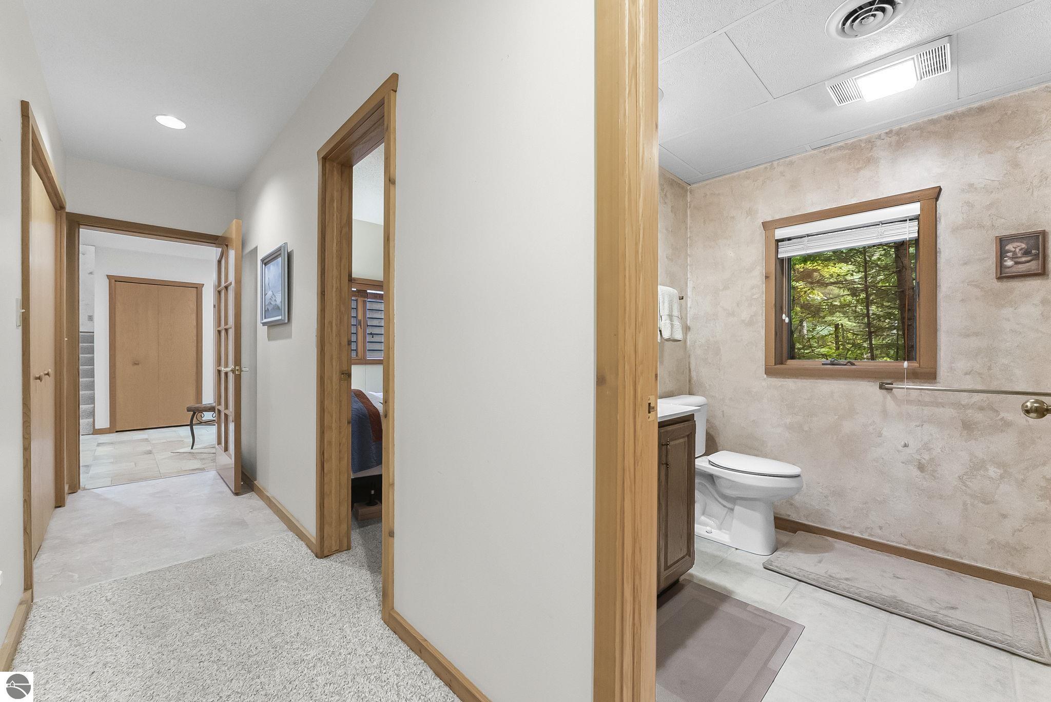 This stunning home along the coveted San Marino Trail in Kewadin--ideally located between Elk Rapids and Charlevoix--offers the perfect Up North retreat. Whether used as a primary residence or a vacation getaway, it blends privacy, comfort, and spectacular views of Grand Traverse Bay. Set on gorgeous, pristine frontage and surrounded by hardwoods, the property features expansive decks and outdoor living areas, combining seclusion with breathtaking scenery. Inside, the open design with soaring ceilings and walls of windows brings the outdoors in. The large kitchen flows seamlessly to a spacious living area and dining room, while multiple gathering spaces provide plenty of room for entertaining or relaxing. The thoughtful layout includes 2 main-floor bedrooms, four baths, and office space or potential for five bedrooms if needed. The lower level has a large living area with laundry and 2 additional bedrooms. A designated space for a future elevator supports aging in place, and a whole-house generator ensures peace of mind during inclement weather. This home truly has it all: stunning views, flexible living spaces, and an unbeatable location. Don't miss this rare opportunity.
