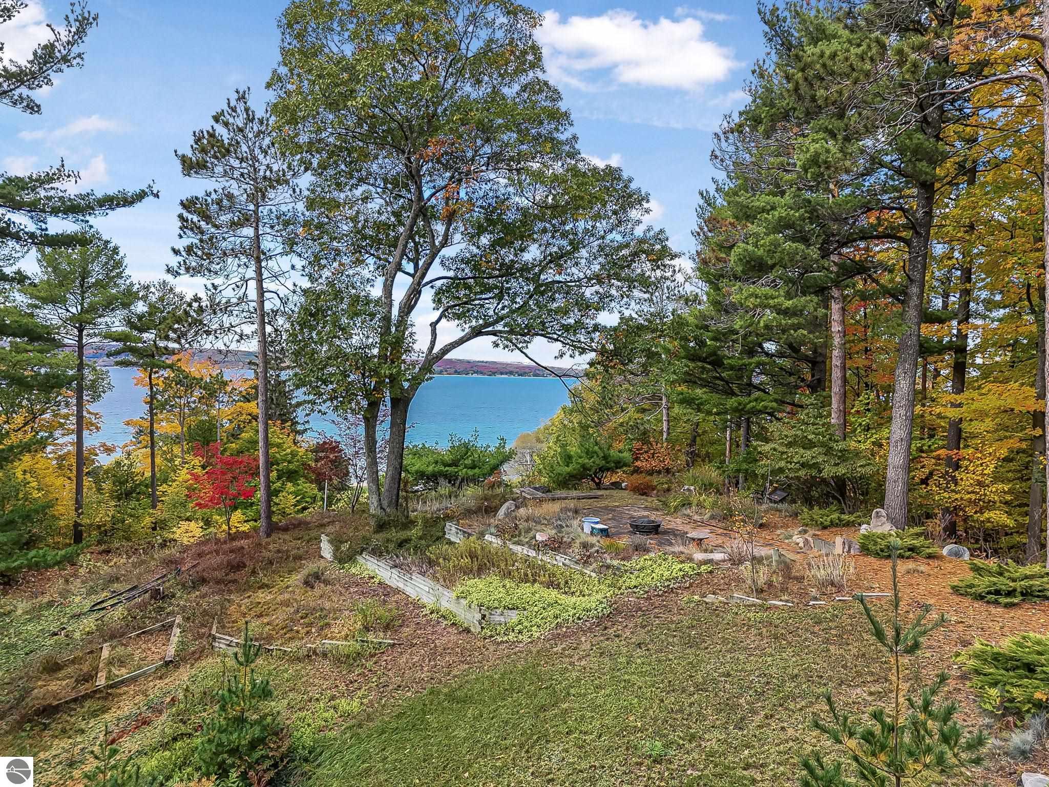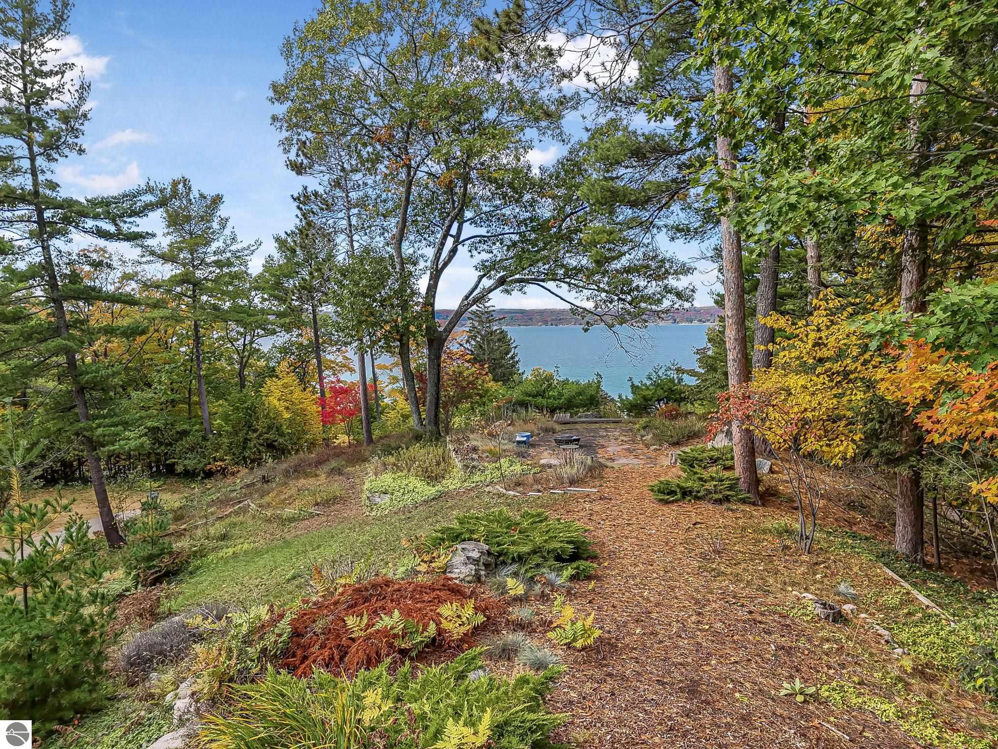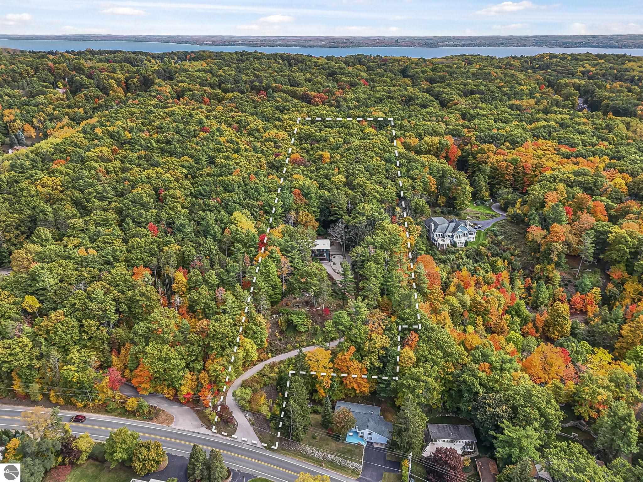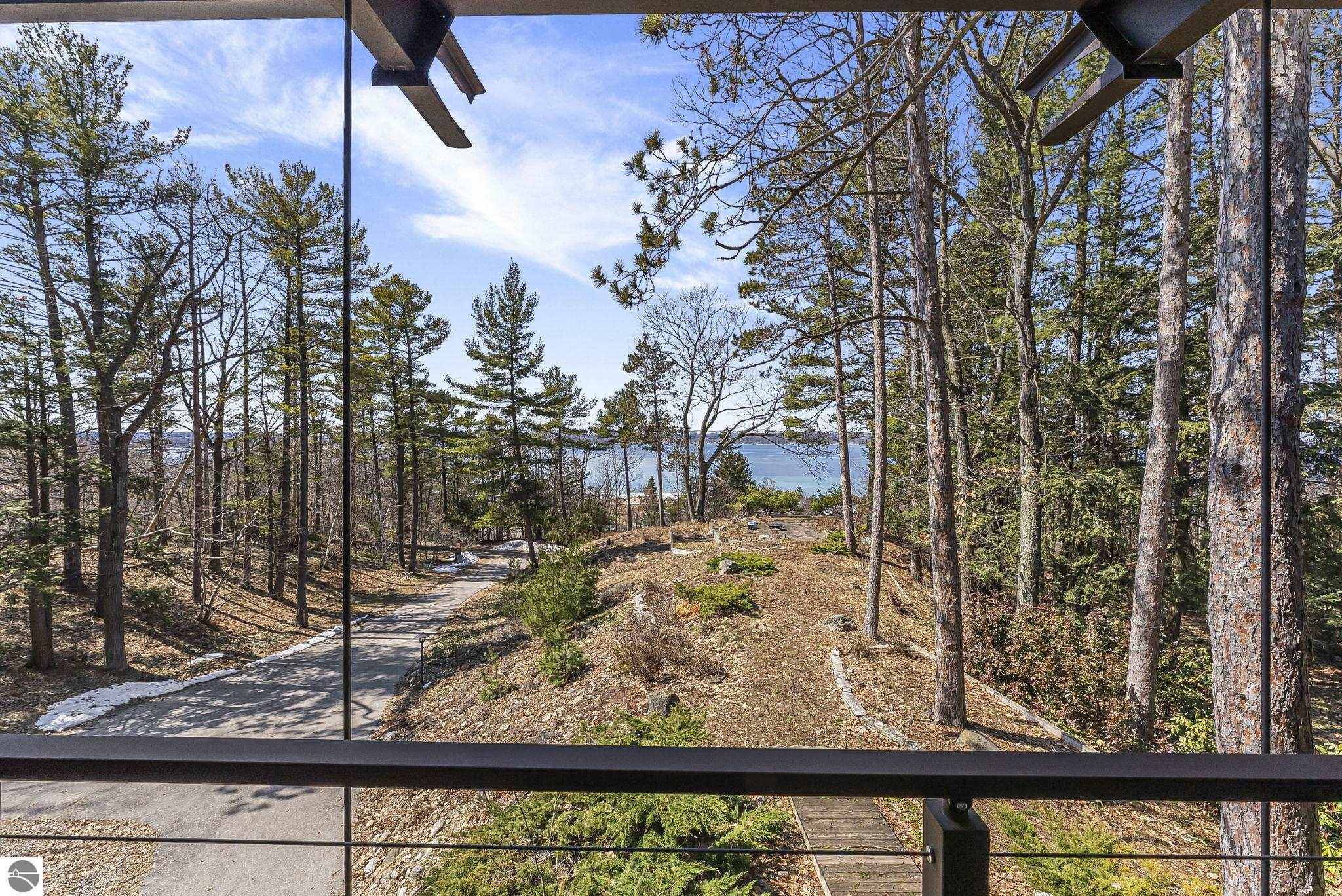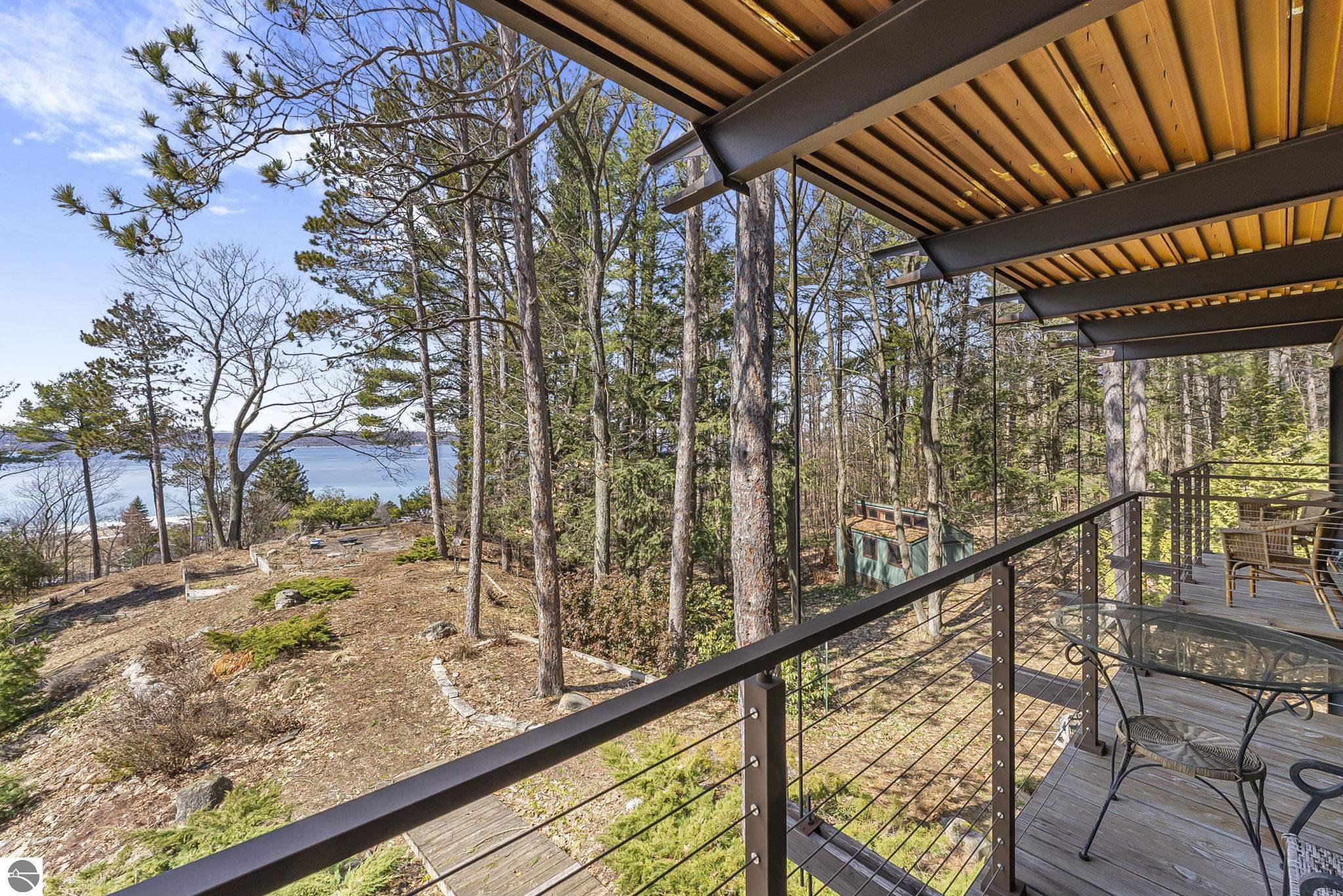 Set near the coveted base of Old Mission Peninsula, this exceptional property offers a rare combination of scale, privacy, and proximity--features seldom found in a single offering. The beautiful and unique architecture of this home is like no other on Old Mission. With just over six acres, the estate presents an extraordinary opportunity in one of Traverse City's most sought-after locations, where acreage of this magnitude is virtually unheard of. The 3,500-square-foot residence is thoughtfully positioned to capture sweeping sunset views over West Bay, with a front-row seat to summer airshows, holiday fireworks, and the ever-changing rhythm of boat traffic along the shoreline. The home offers several separate family areas for entertaining, celebrating family or simply downtime in the cozy and warm interior. Expansive windows and well-proportioned living spaces bring the outdoors in, creating a seamless connection to the surrounding landscape. With three bedrooms and three baths, the home is both substantial and comfortable, offering flexibility for year-round living or a refined seasonal retreat. Just minutes from downtown Traverse City, yet removed enough to feel private and serene, this is a truly rare holding on Old Mission Peninsula--where location, land, and view converge in a way that is increasingly difficult to find. A lower level workshop with tons of storage and a really nice sized garden shed are another bonus with this property. The Views are incredible and the wooded and rolling acreage offers so many opportunities you wont find with other homes.