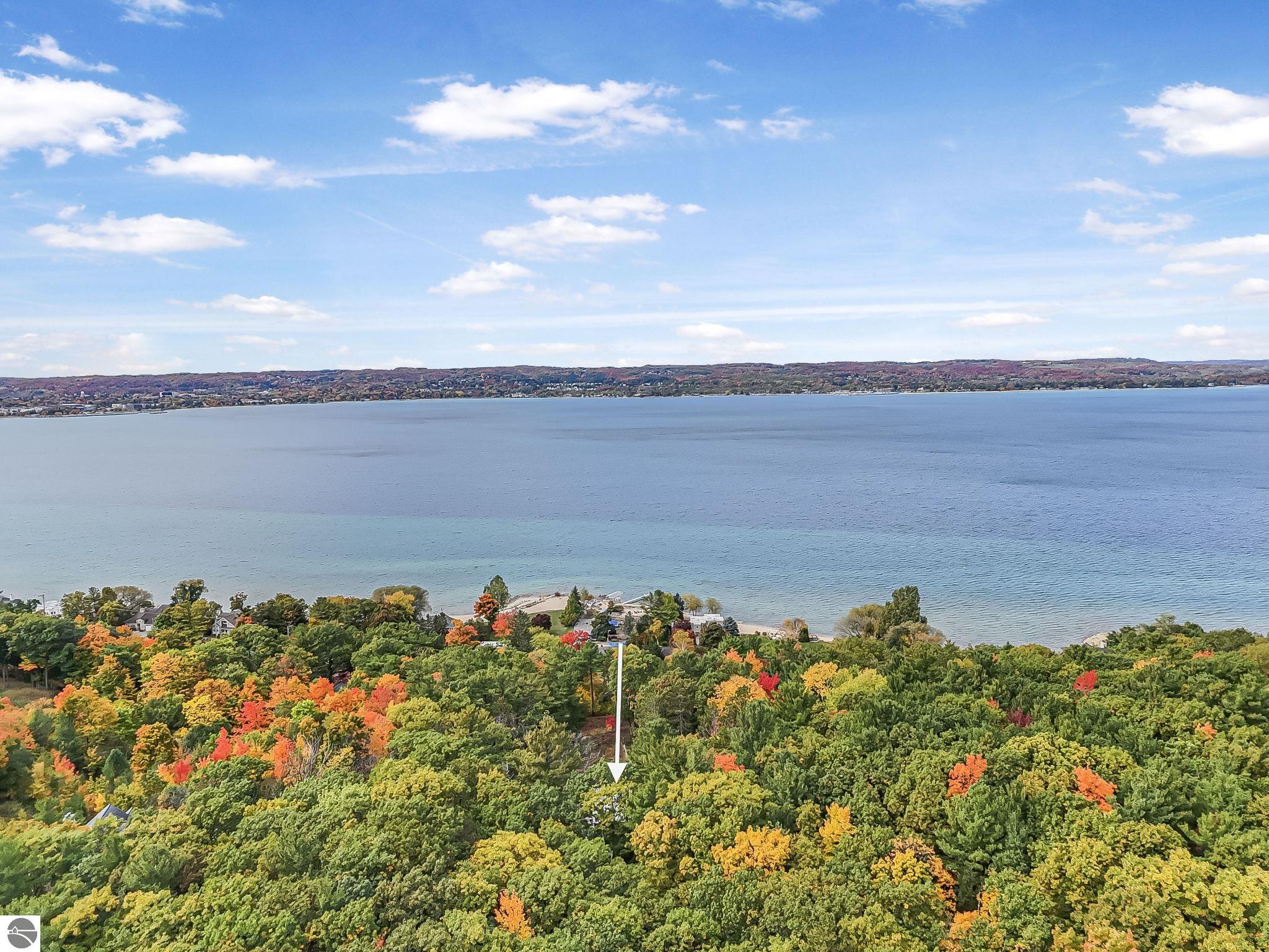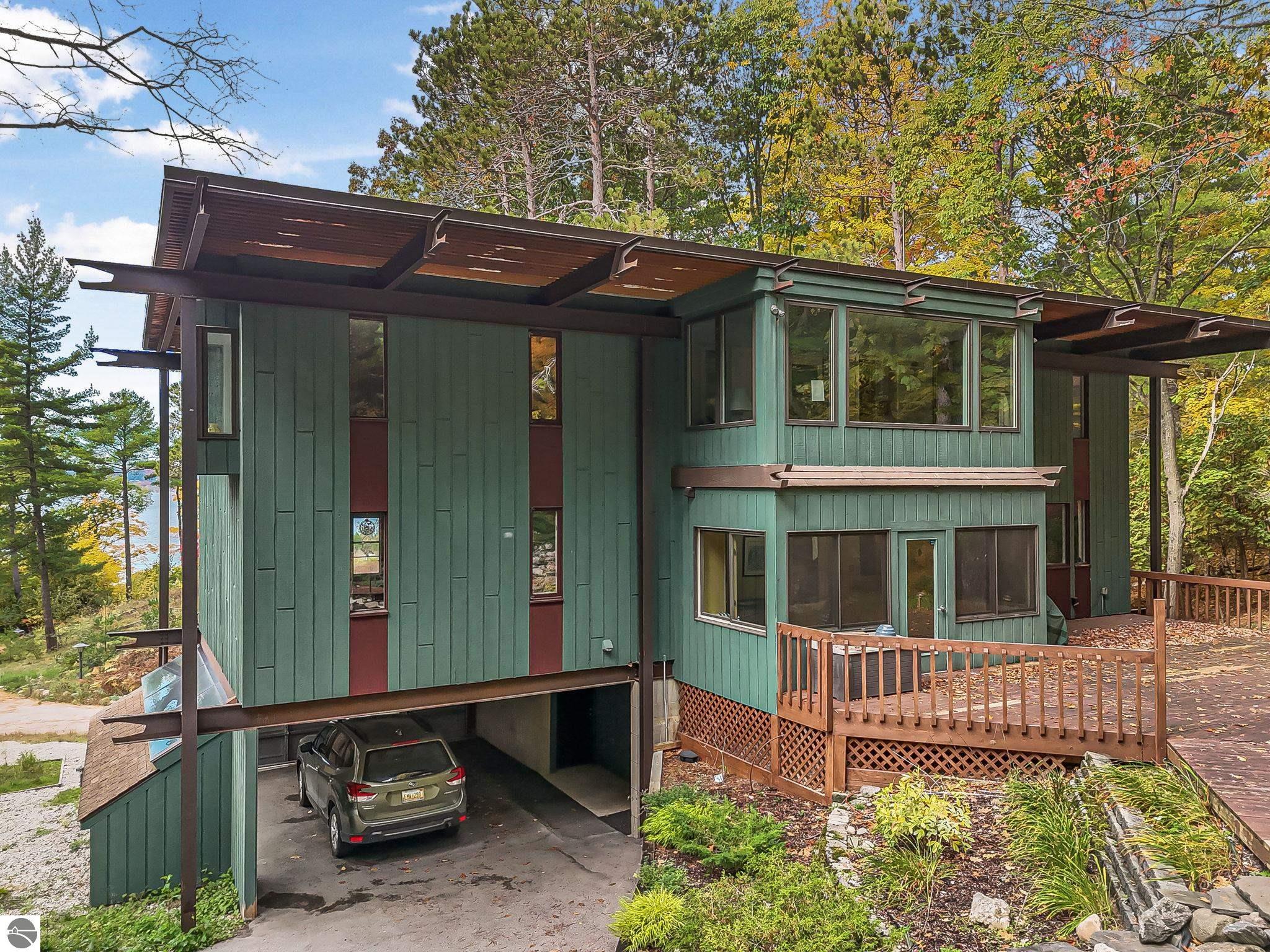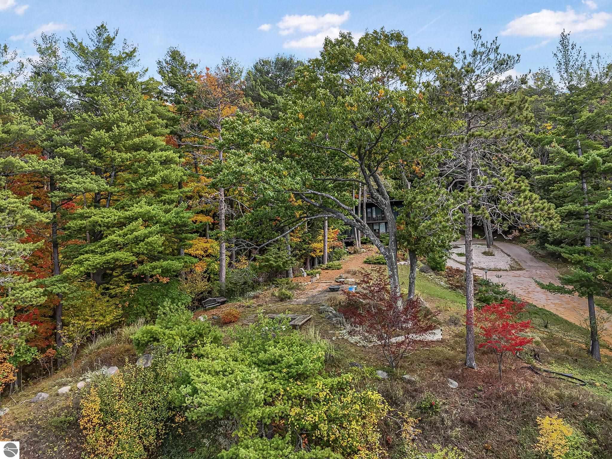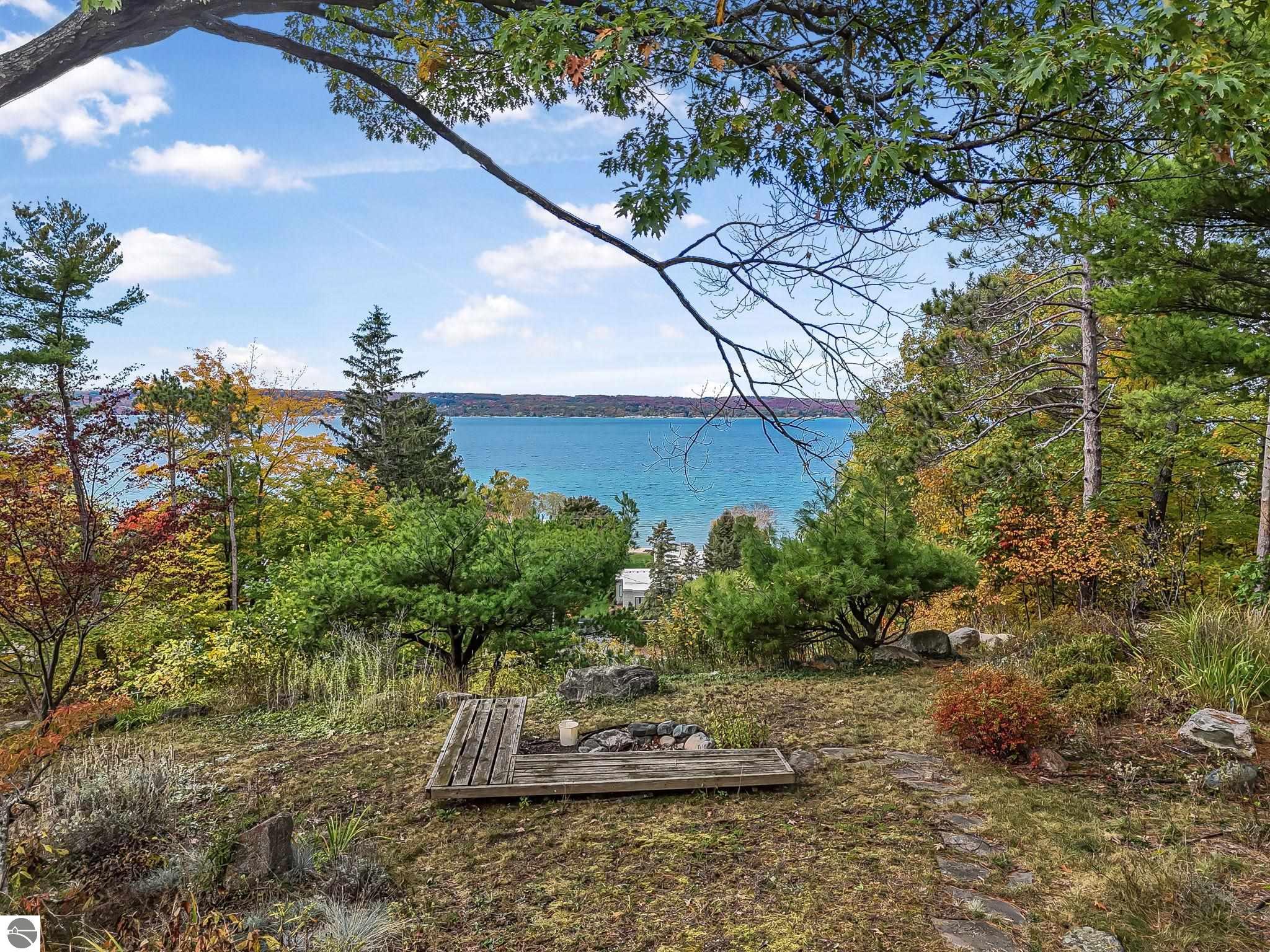 Set near the coveted base of Old Mission Peninsula, this exceptional property offers a rare combination of scale, privacy, and proximity--features seldom found in a single offering. The beautiful and unique architecture of this home is like no other on Old Mission. With just over six acres, the estate presents an extraordinary opportunity in one of Traverse City's most sought-after locations, where acreage of this magnitude is virtually unheard of. The 3,500-square-foot residence is thoughtfully positioned to capture sweeping sunset views over West Bay, with a front-row seat to summer airshows, holiday fireworks, and the ever-changing rhythm of boat traffic along the shoreline. The home offers several separate family areas for entertaining, celebrating family or simply downtime in the cozy and warm interior. Expansive windows and well-proportioned living spaces bring the outdoors in, creating a seamless connection to the surrounding landscape. With three bedrooms and three baths, the home is both substantial and comfortable, offering flexibility for year-round living or a refined seasonal retreat. Just minutes from downtown Traverse City, yet removed enough to feel private and serene, this is a truly rare holding on Old Mission Peninsula--where location, land, and view converge in a way that is increasingly difficult to find. A lower level workshop with tons of storage and a really nice sized garden shed are another bonus with this property. The Views are incredible and the wooded and rolling acreage offers so many opportunities you wont find with other homes.