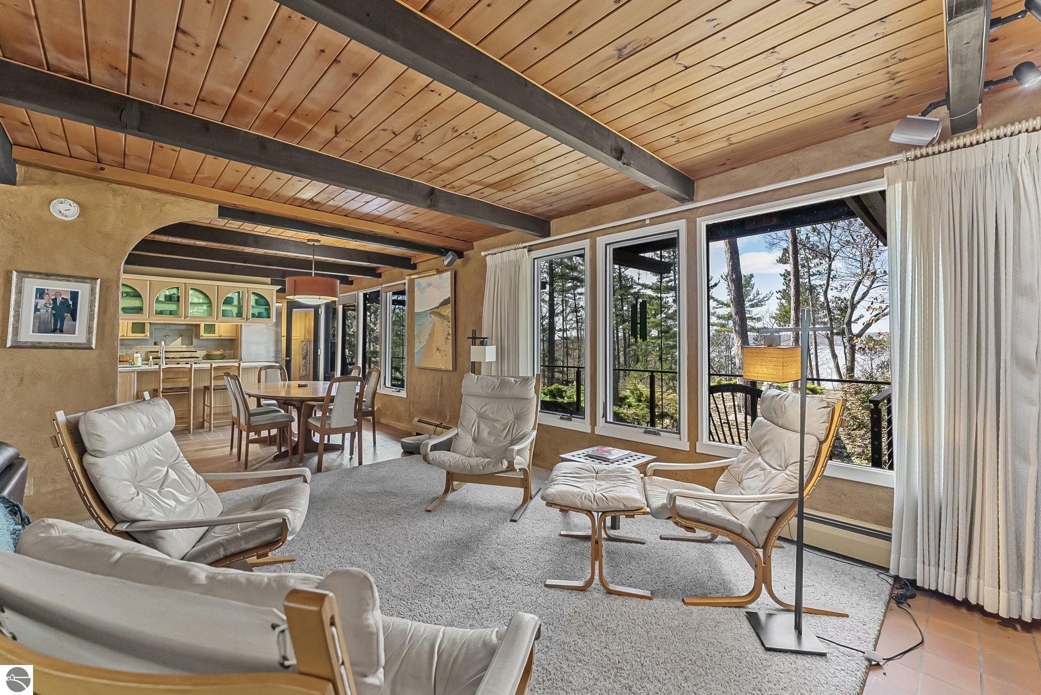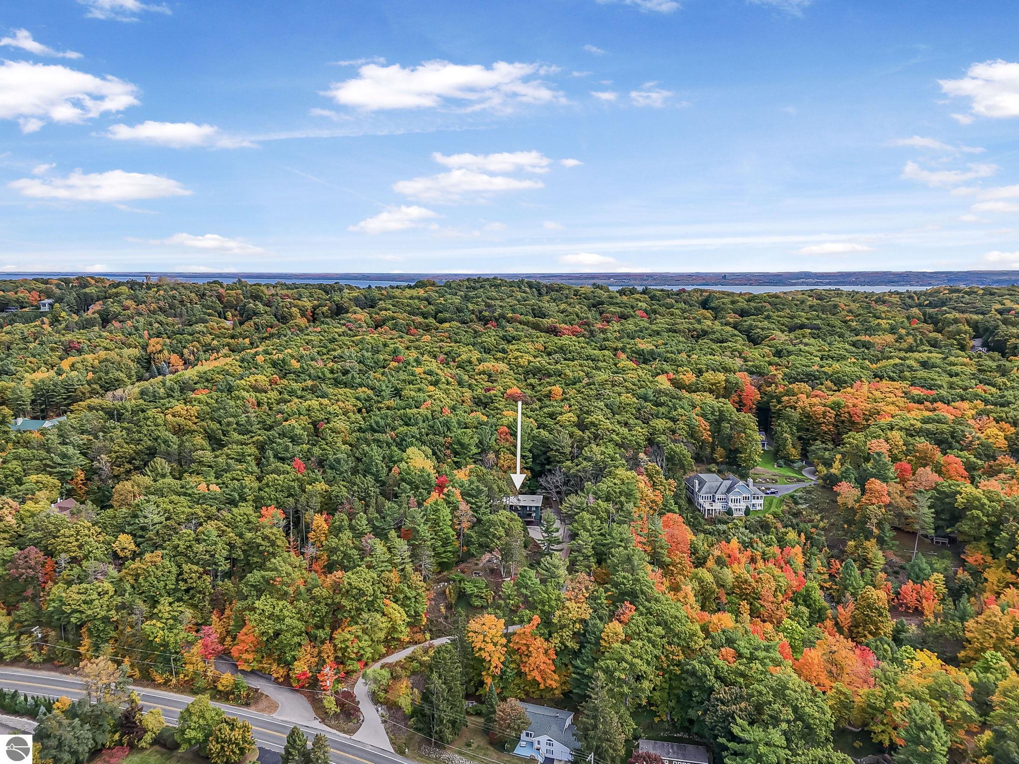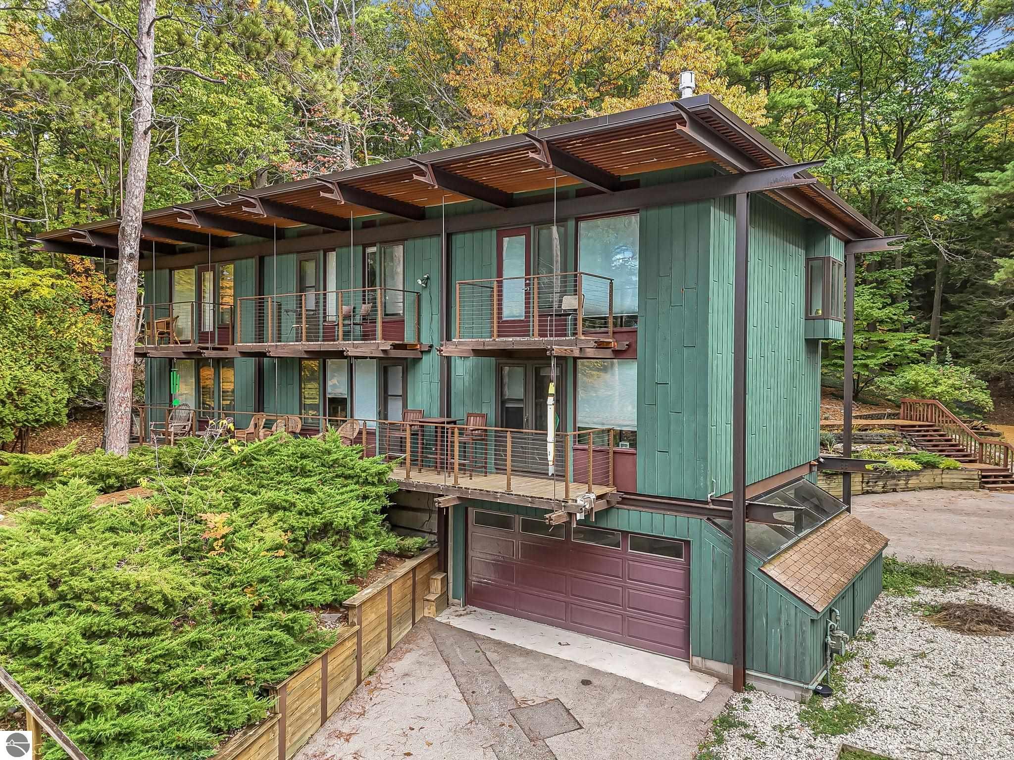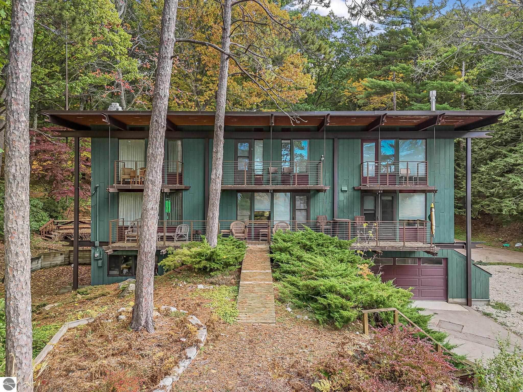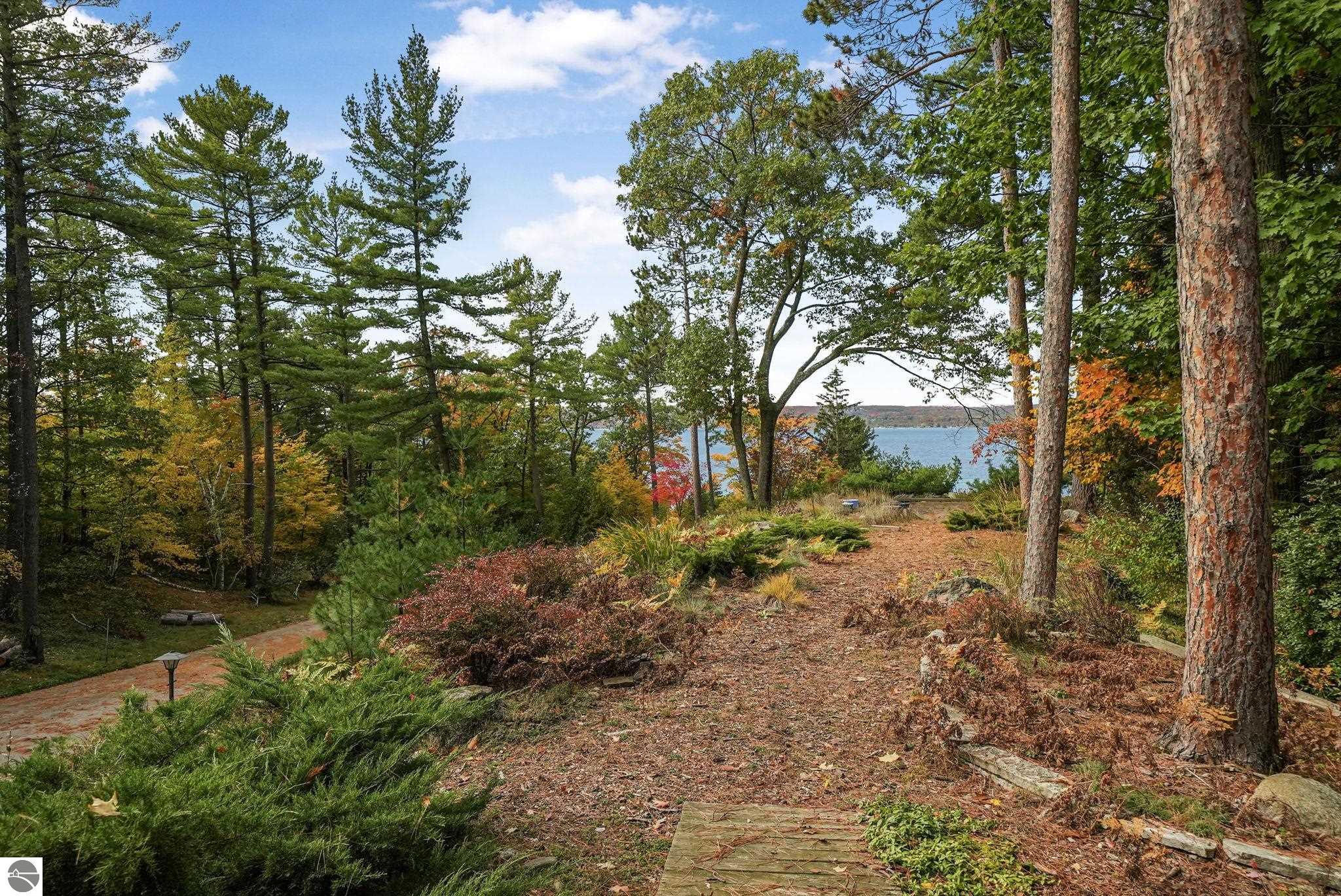 Set near the coveted base of Old Mission Peninsula, this exceptional property offers a rare combination of scale, privacy, and proximity--features seldom found in a single offering. The beautiful and unique architecture of this home is like no other on Old Mission. With just over six acres, the estate presents an extraordinary opportunity in one of Traverse City's most sought-after locations, where acreage of this magnitude is virtually unheard of. The 3,500-square-foot residence is thoughtfully positioned to capture sweeping sunset views over West Bay, with a front-row seat to summer airshows, holiday fireworks, and the ever-changing rhythm of boat traffic along the shoreline. The home offers several separate family areas for entertaining, celebrating family or simply downtime in the cozy and warm interior. Expansive windows and well-proportioned living spaces bring the outdoors in, creating a seamless connection to the surrounding landscape. With three bedrooms and three baths, the home is both substantial and comfortable, offering flexibility for year-round living or a refined seasonal retreat. Just minutes from downtown Traverse City, yet removed enough to feel private and serene, this is a truly rare holding on Old Mission Peninsula--where location, land, and view converge in a way that is increasingly difficult to find. A lower level workshop with tons of storage and a really nice sized garden shed are another bonus with this property. The Views are incredible and the wooded and rolling acreage offers so many opportunities you wont find with other homes.