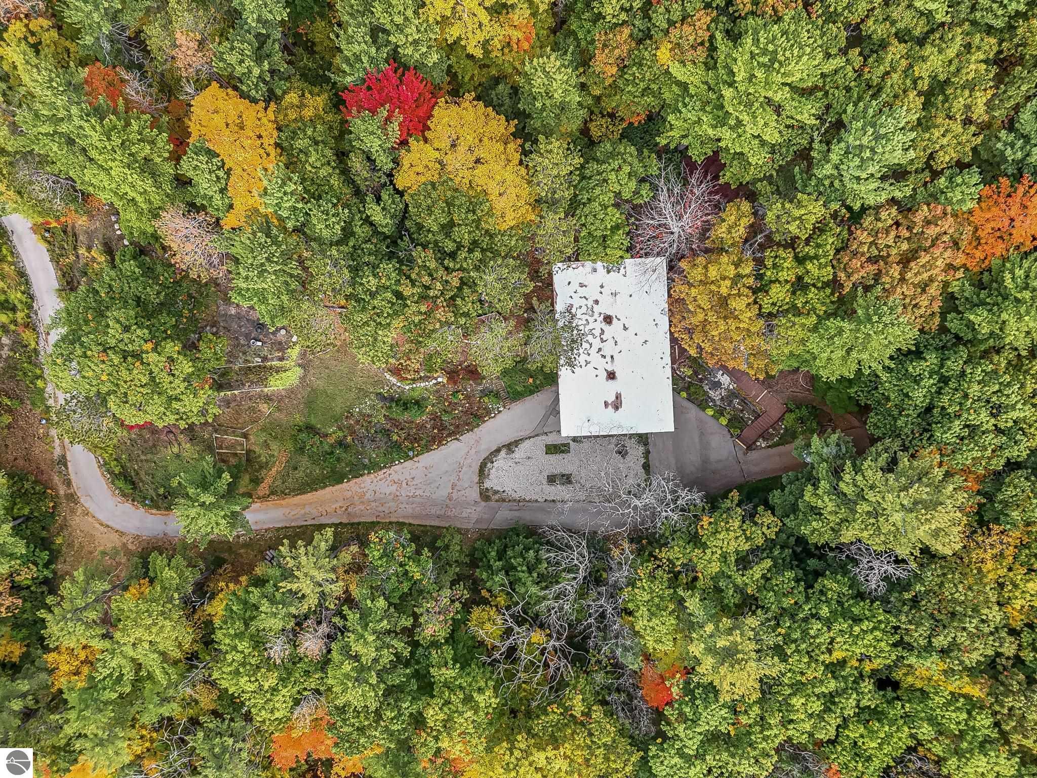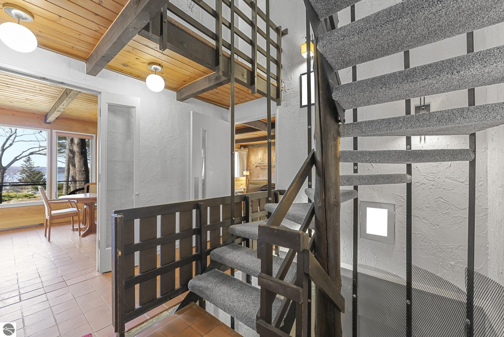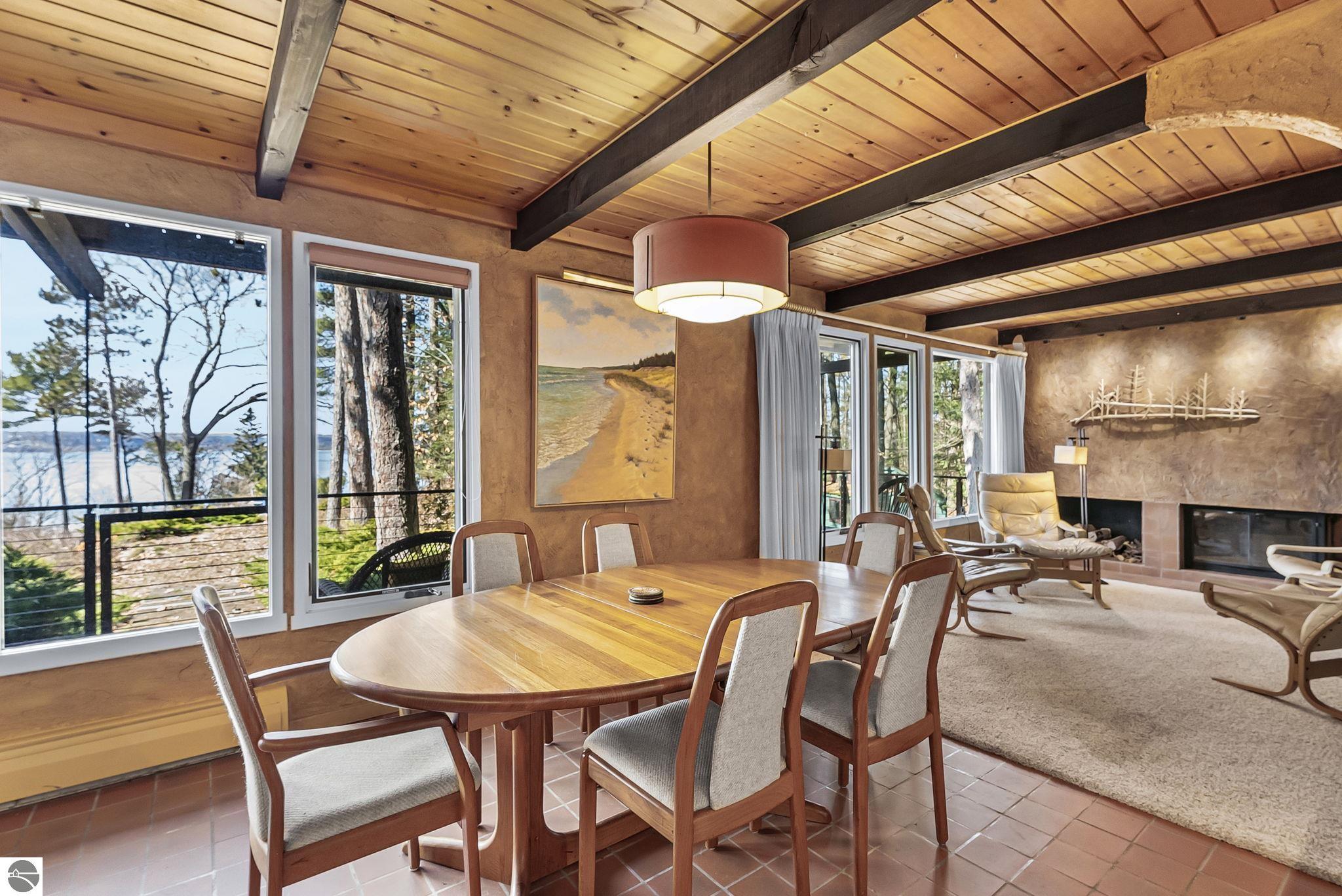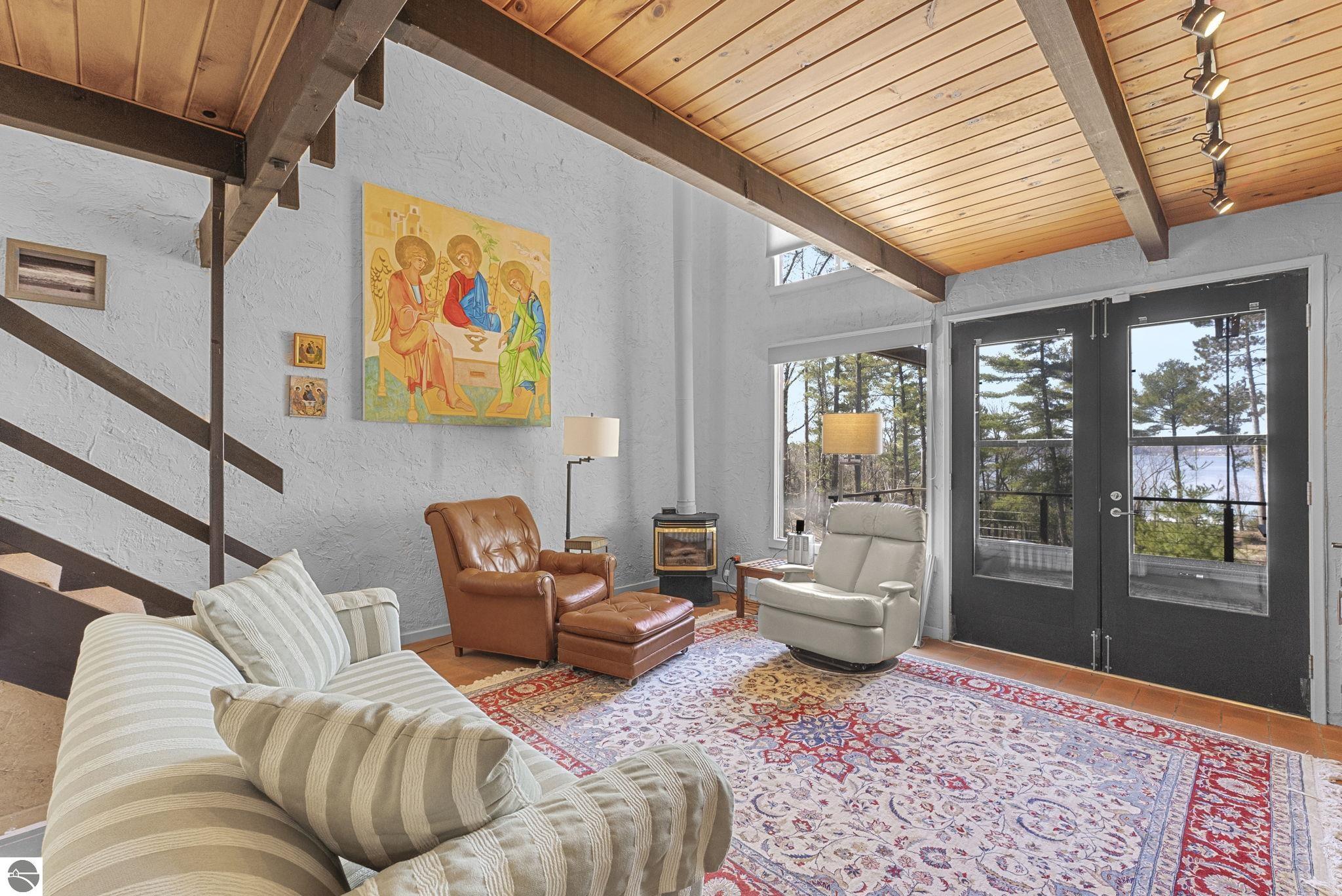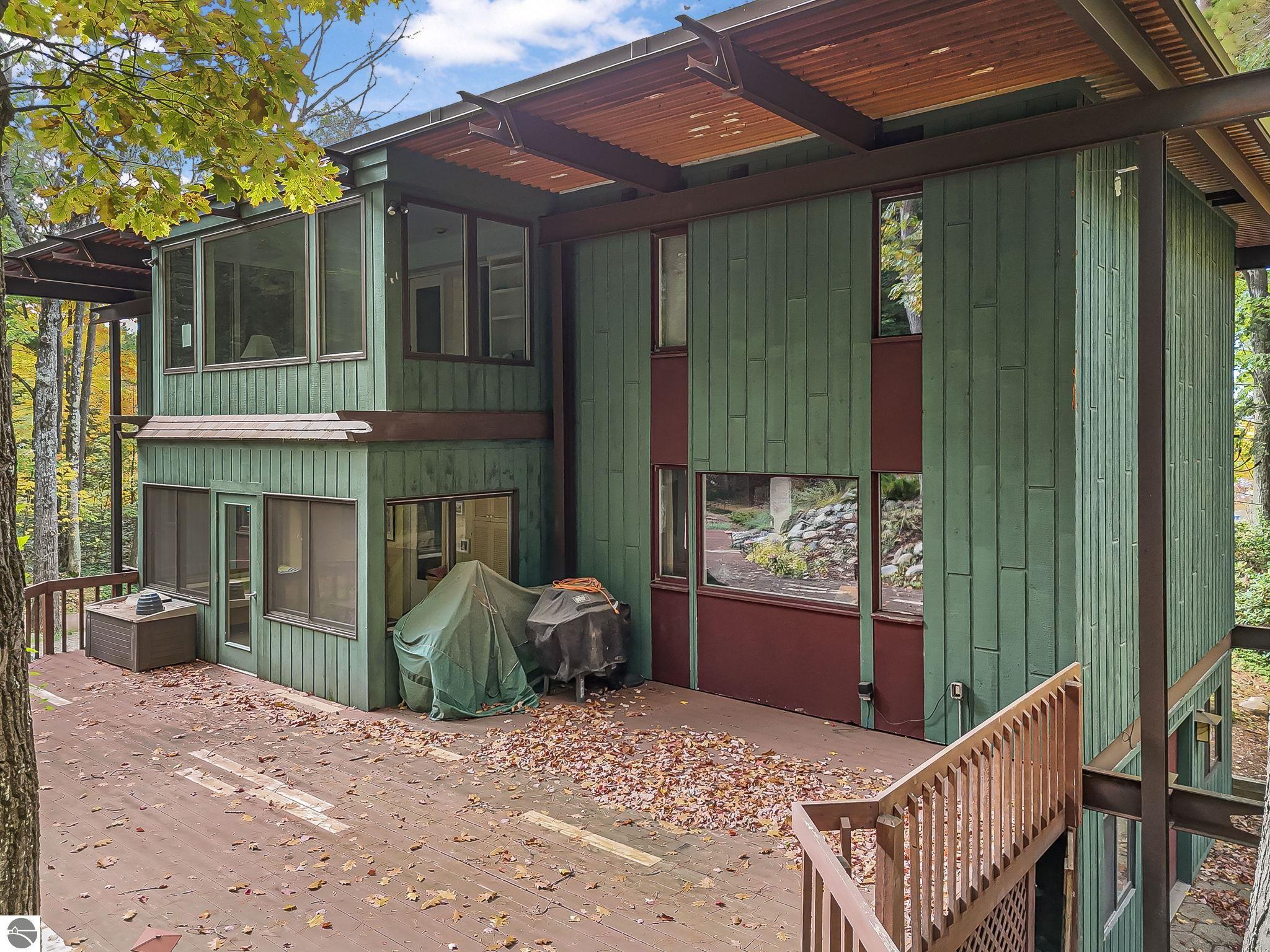 Set near the coveted base of Old Mission Peninsula, this exceptional property offers a rare combination of scale, privacy, and proximity--features seldom found in a single offering. The beautiful and unique architecture of this home is like no other on Old Mission. With just over six acres, the estate presents an extraordinary opportunity in one of Traverse City's most sought-after locations, where acreage of this magnitude is virtually unheard of. The 3,500-square-foot residence is thoughtfully positioned to capture sweeping sunset views over West Bay, with a front-row seat to summer airshows, holiday fireworks, and the ever-changing rhythm of boat traffic along the shoreline. The home offers several separate family areas for entertaining, celebrating family or simply downtime in the cozy and warm interior. Expansive windows and well-proportioned living spaces bring the outdoors in, creating a seamless connection to the surrounding landscape. With three bedrooms and three baths, the home is both substantial and comfortable, offering flexibility for year-round living or a refined seasonal retreat. Just minutes from downtown Traverse City, yet removed enough to feel private and serene, this is a truly rare holding on Old Mission Peninsula--where location, land, and view converge in a way that is increasingly difficult to find. A lower level workshop with tons of storage and a really nice sized garden shed are another bonus with this property. The Views are incredible and the wooded and rolling acreage offers so many opportunities you wont find with other homes.