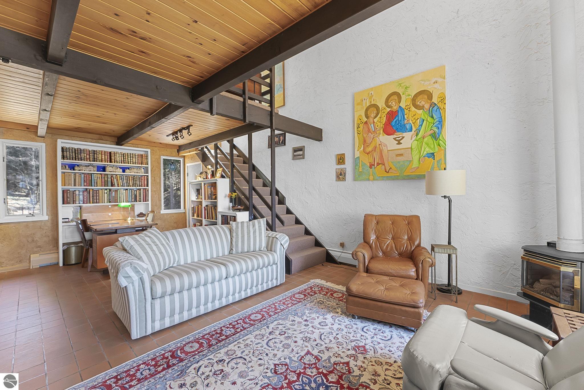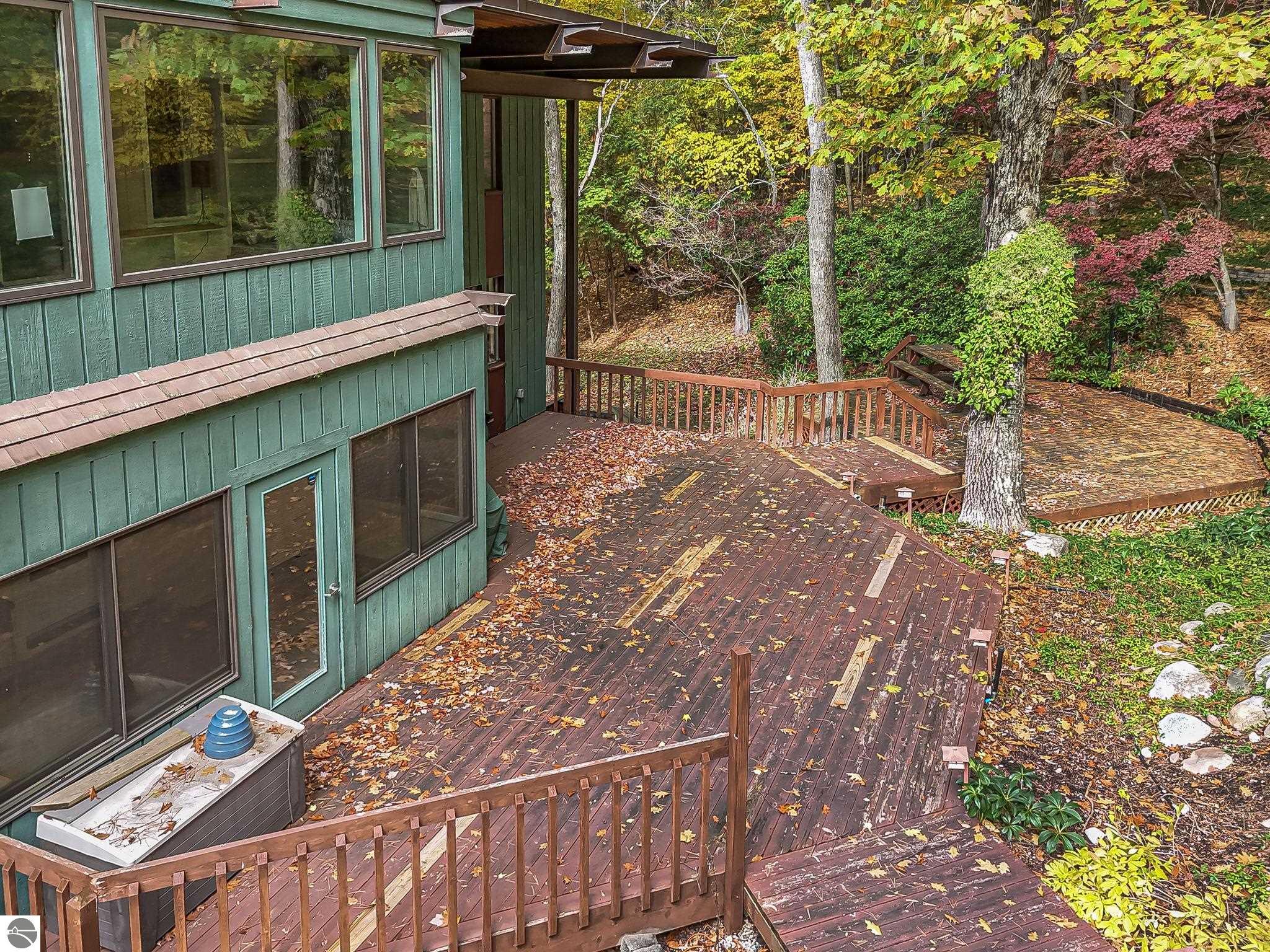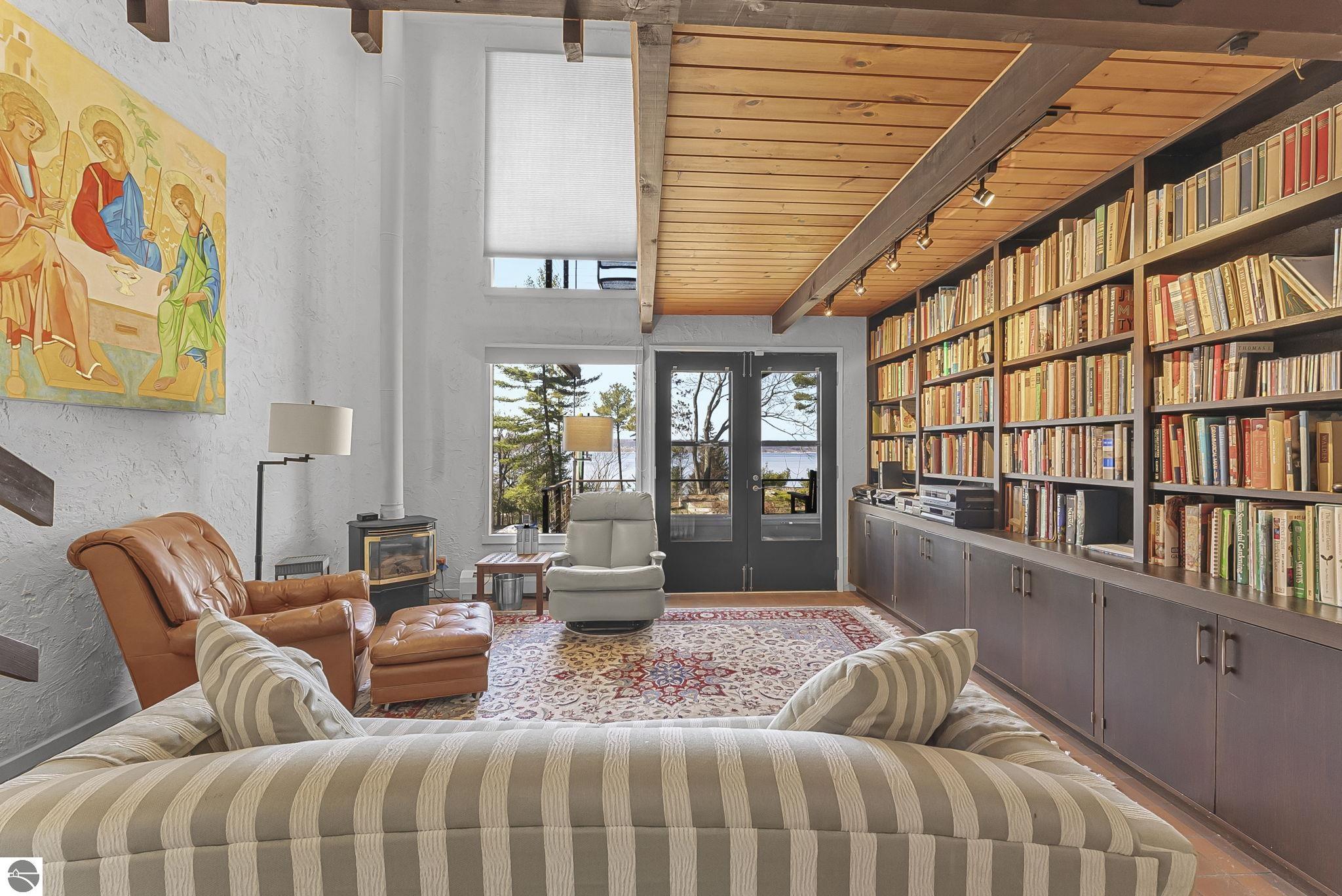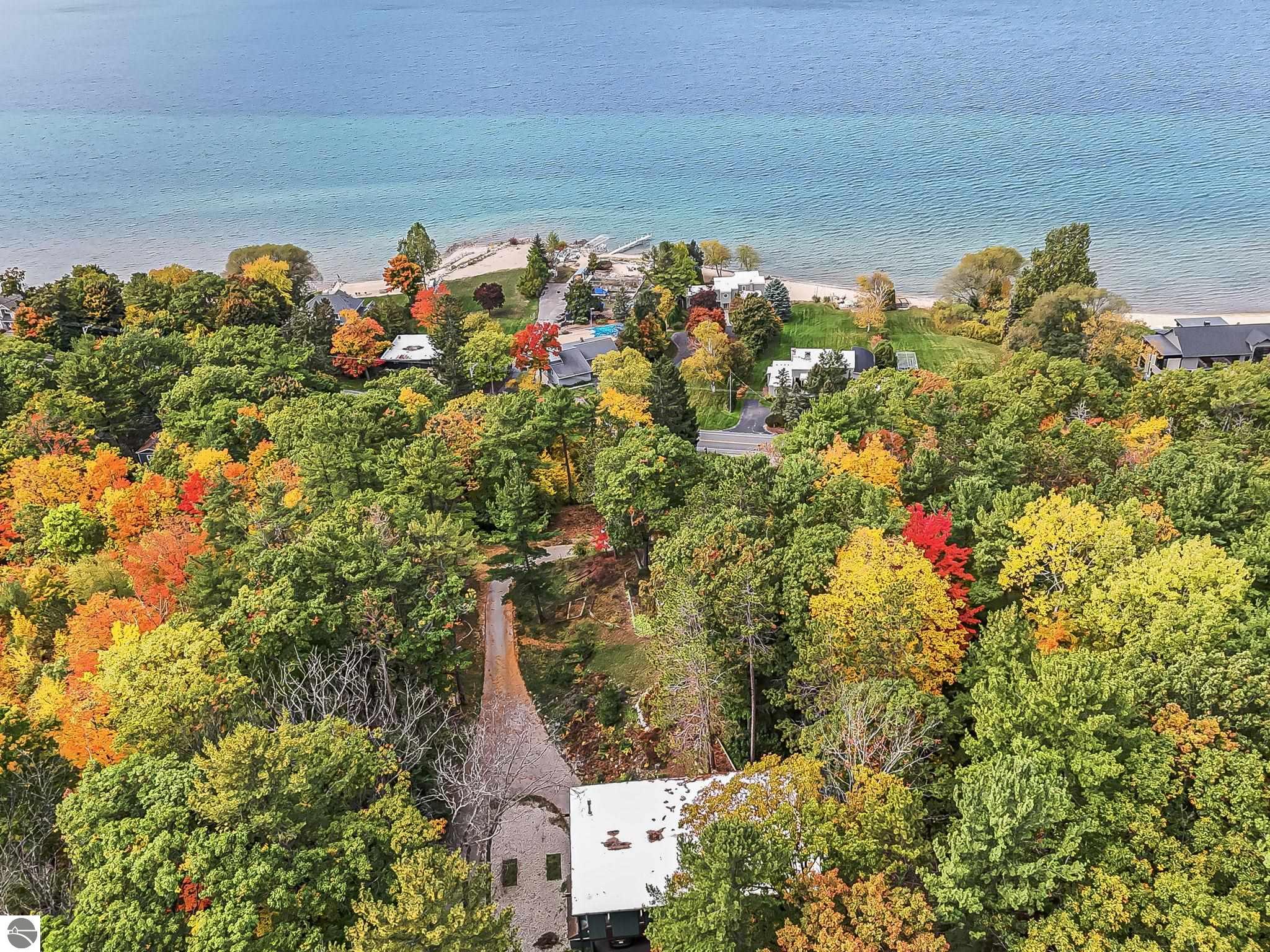 Set near the coveted base of Old Mission Peninsula, this exceptional property offers a rare combination of scale, privacy, and proximity--features seldom found in a single offering. The beautiful and unique architecture of this home is like no other on Old Mission. With just over six acres, the estate presents an extraordinary opportunity in one of Traverse City's most sought-after locations, where acreage of this magnitude is virtually unheard of. The 3,500-square-foot residence is thoughtfully positioned to capture sweeping sunset views over West Bay, with a front-row seat to summer airshows, holiday fireworks, and the ever-changing rhythm of boat traffic along the shoreline. The home offers several separate family areas for entertaining, celebrating family or simply downtime in the cozy and warm interior. Expansive windows and well-proportioned living spaces bring the outdoors in, creating a seamless connection to the surrounding landscape. With three bedrooms and three baths, the home is both substantial and comfortable, offering flexibility for year-round living or a refined seasonal retreat. Just minutes from downtown Traverse City, yet removed enough to feel private and serene, this is a truly rare holding on Old Mission Peninsula--where location, land, and view converge in a way that is increasingly difficult to find. A lower level workshop with tons of storage and a really nice sized garden shed are another bonus with this property. The Views are incredible and the wooded and rolling acreage offers so many opportunities you wont find with other homes.
