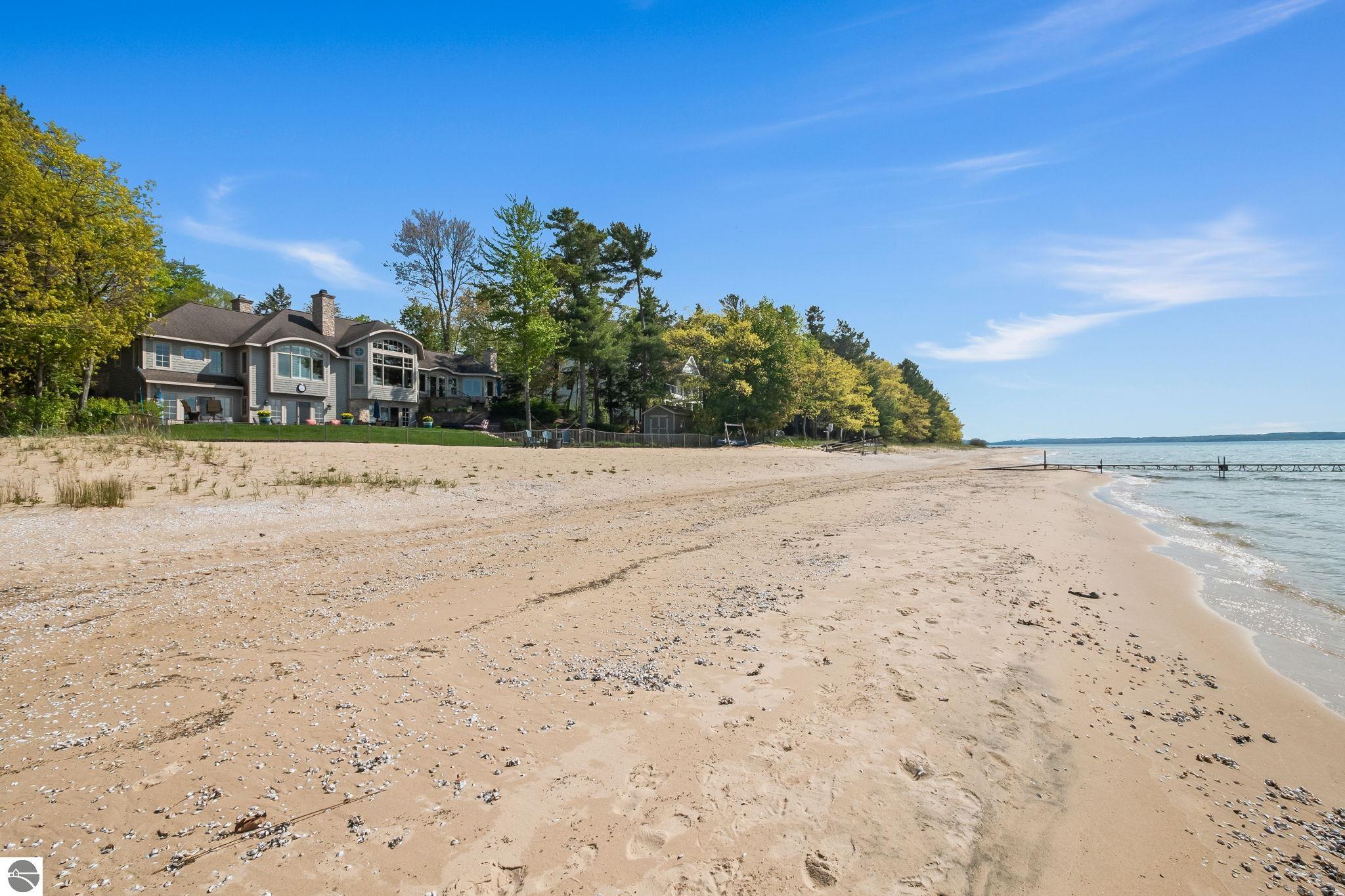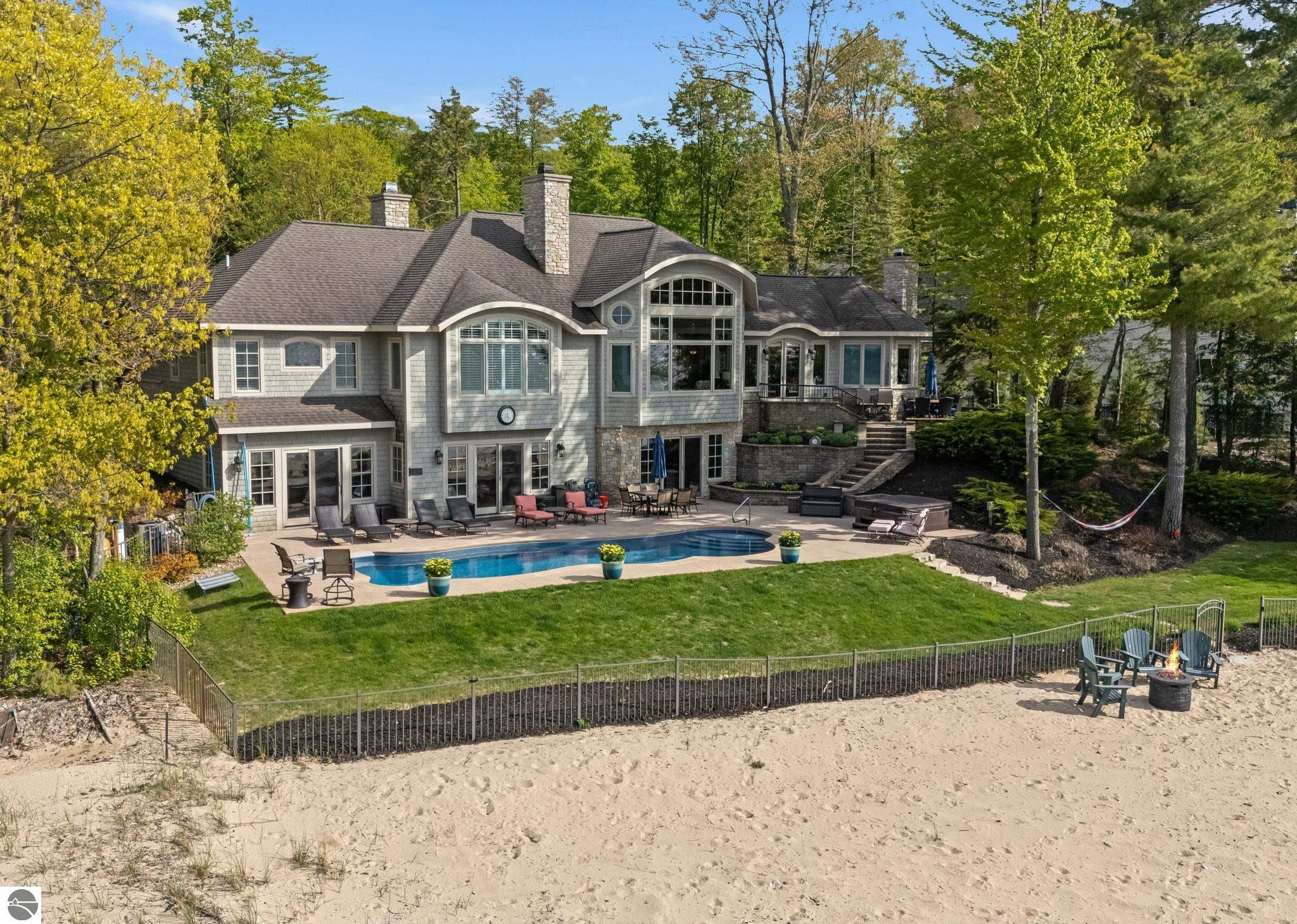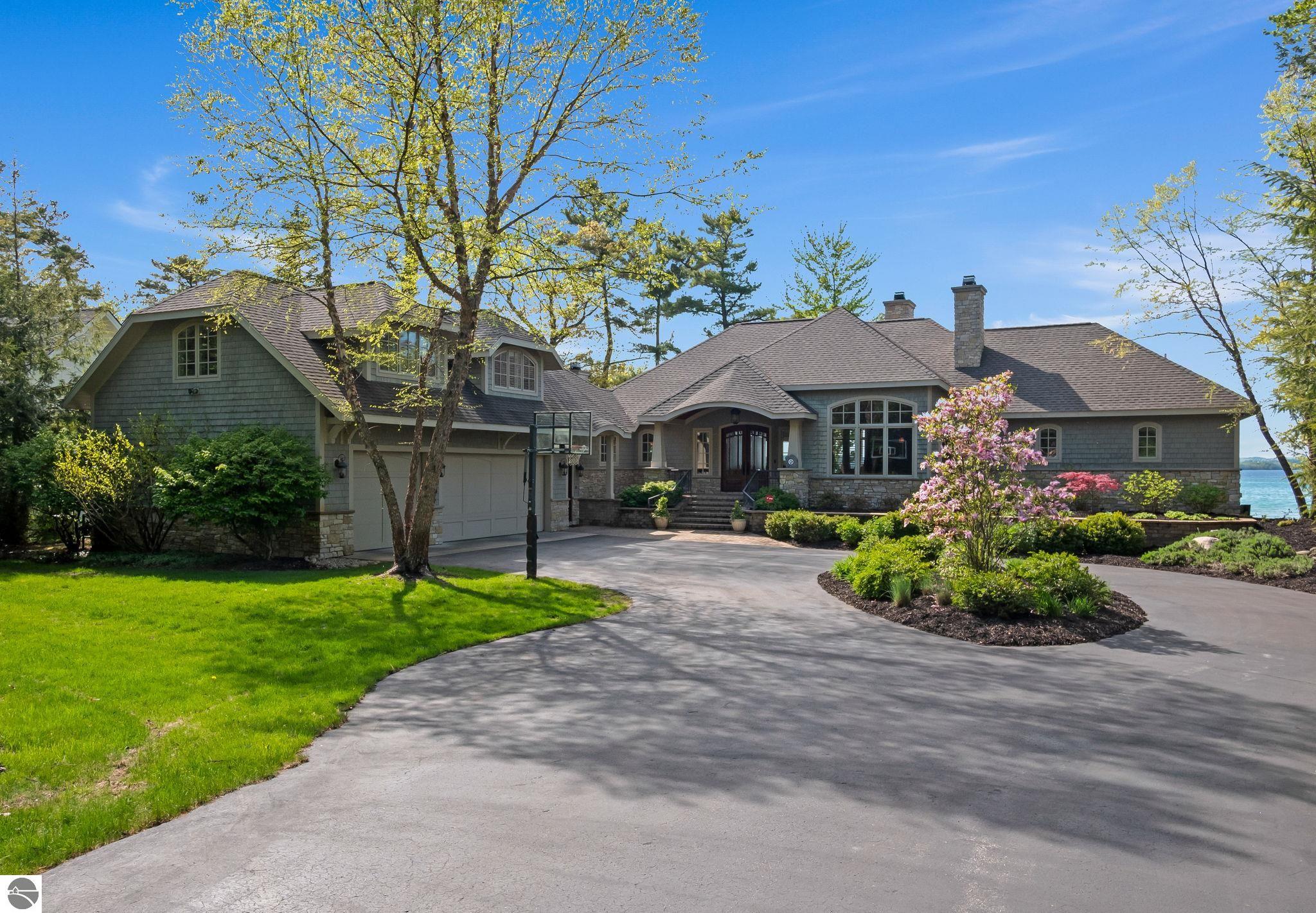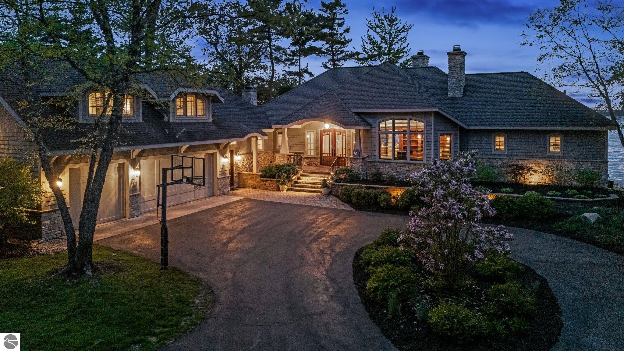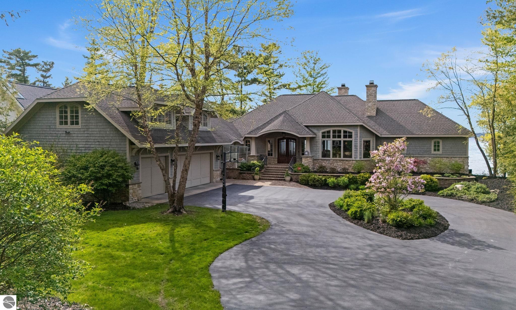 The name says it all-Beautiful Shores. This extraordinary property offers 150' of private West Grand Traverse Bay frontage with a beautiful sandy beach and sweeping west-facing views of Power Island and unforgettable sunsets. A true reflection of everything Traverse City has to offer. Set on an acre with incredible privacy, this 6300-square-foot Craftsman-style home was built by one of the areas top builders and exudes warmth, quality and character throughout. With four very sizable bedrooms, ensuites in the lower level and a jaw dropping master bath on the main floor the layout is functional and inviting. The closet space in this home is exceptional with solid built-ins in each of them. The heart of the home is a gourmet kitchen quipped with high-end appliances and top of the line timeless cabinetry. Just off the kitchen prepare to be in love with this thoughtfully designed multi-purpose mudroom, laundry room and a dedicated homework zone-perfect for the busy family. The lower level has a second laundry room, workout room and wet bar along with a comfortable and inviting family living space. Enjioy the ease of the elevator that goes to all three floors for convenience and generational assistance. "Above the garage, a private guest apartment-perfect for visiting family or in-laws, offers a full kitchenette, a spa like bath, and elevator access. A quiet space to make coffee, unwind and recharge after along day on the beach." Walls of windows flood the home with natural light and frame captivating views of the blue water. Outdoors, enjoy the lush, mature landscaping and a quiet, private drive with stone pillars-ready for a gate if added privacy is desired. A rare and coveted amenity: the added in-ground pool that overlooks West Bay, allowing you to swim and soak in the views. This once in a generation offering on one of Traverse City's most desirable shorelines. And those Sunsets!!!!