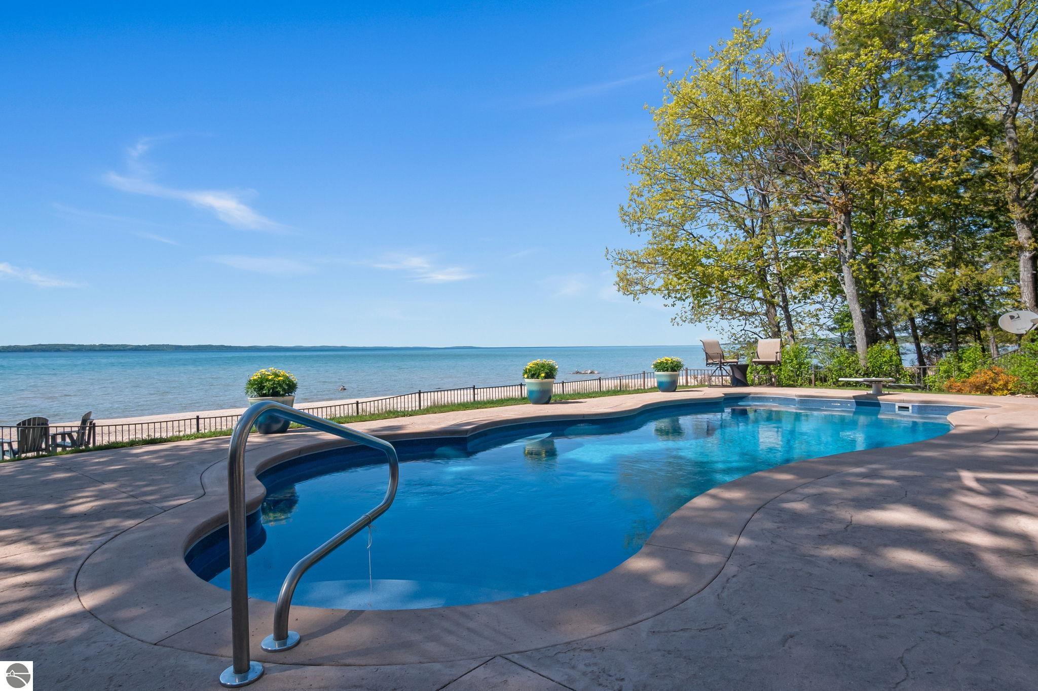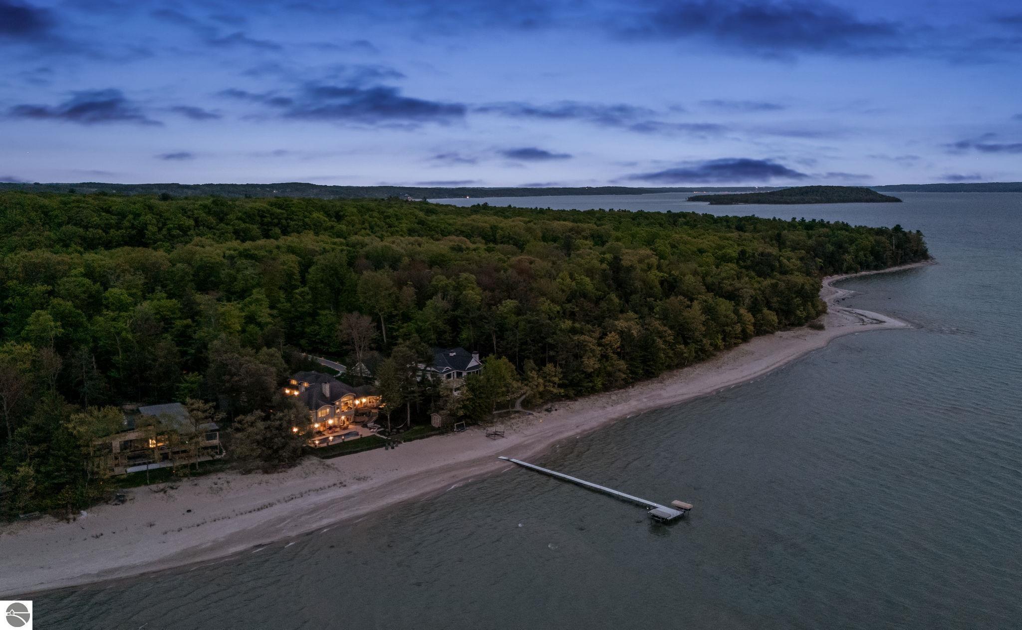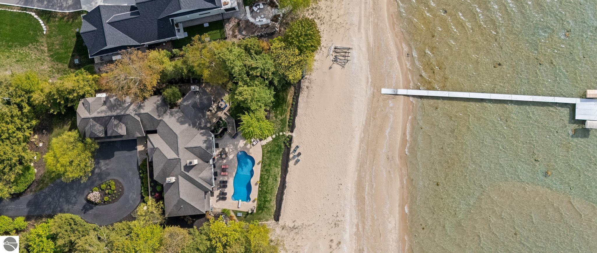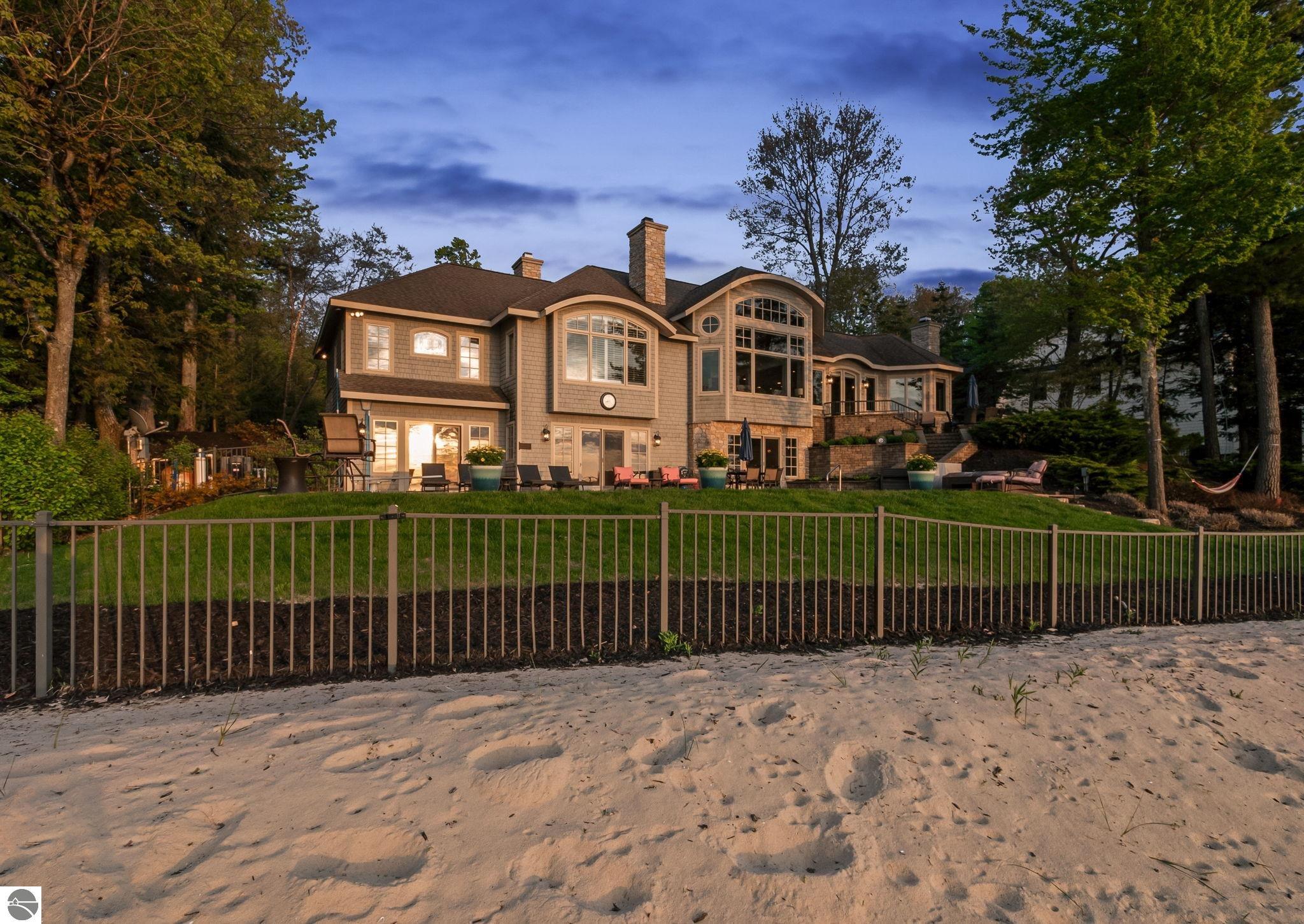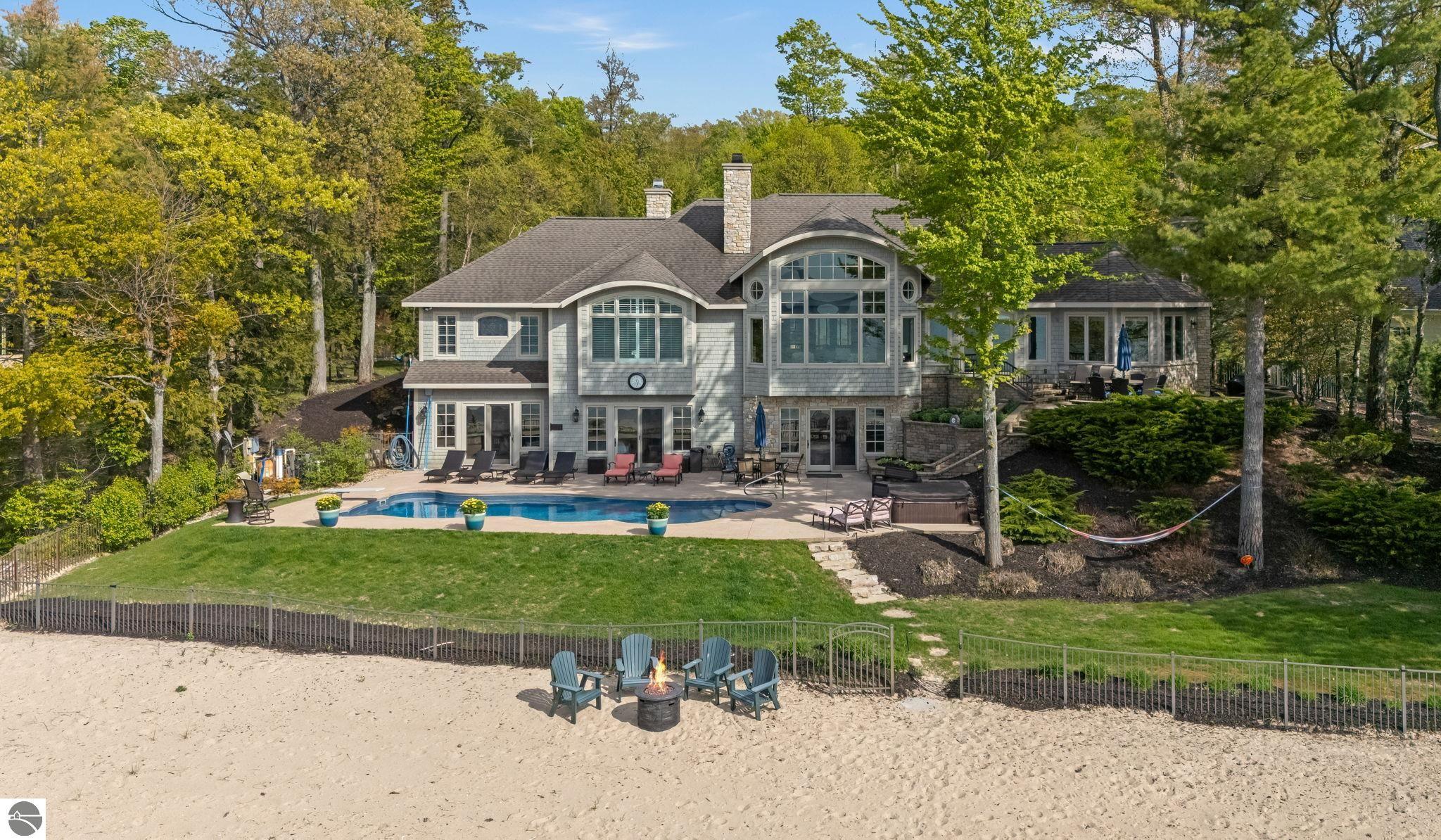 The name says it all-Beautiful Shores. This extraordinary property offers 150' of private West Grand Traverse Bay frontage with a beautiful sandy beach and sweeping west-facing views of Power Island and unforgettable sunsets. A true reflection of everything Traverse City has to offer. Set on an acre with incredible privacy, this 6300-square-foot Craftsman-style home was built by one of the areas top builders and exudes warmth, quality and character throughout. With four very sizable bedrooms, ensuites in the lower level and a jaw dropping master bath on the main floor the layout is functional and inviting. The closet space in this home is exceptional with solid built-ins in each of them. The heart of the home is a gourmet kitchen quipped with high-end appliances and top of the line timeless cabinetry. Just off the kitchen prepare to be in love with this thoughtfully designed multi-purpose mudroom, laundry room and a dedicated homework zone-perfect for the busy family. The lower level has a second laundry room, workout room and wet bar along with a comfortable and inviting family living space. Enjioy the ease of the elevator that goes to all three floors for convenience and generational assistance. "Above the garage, a private guest apartment-perfect for visiting family or in-laws, offers a full kitchenette, a spa like bath, and elevator access. A quiet space to make coffee, unwind and recharge after along day on the beach." Walls of windows flood the home with natural light and frame captivating views of the blue water. Outdoors, enjoy the lush, mature landscaping and a quiet, private drive with stone pillars-ready for a gate if added privacy is desired. A rare and coveted amenity: the added in-ground pool that overlooks West Bay, allowing you to swim and soak in the views. This once in a generation offering on one of Traverse City's most desirable shorelines. And those Sunsets!!!!