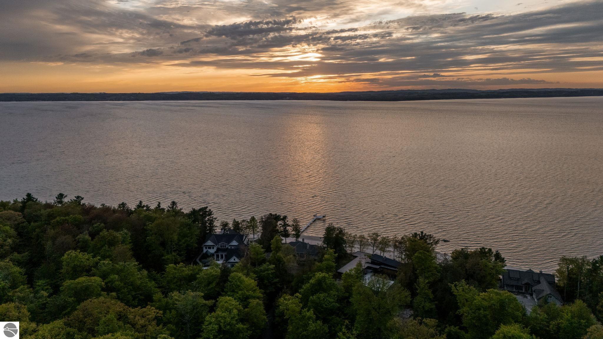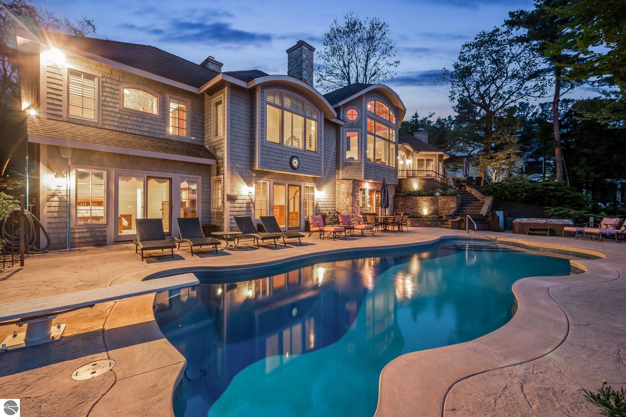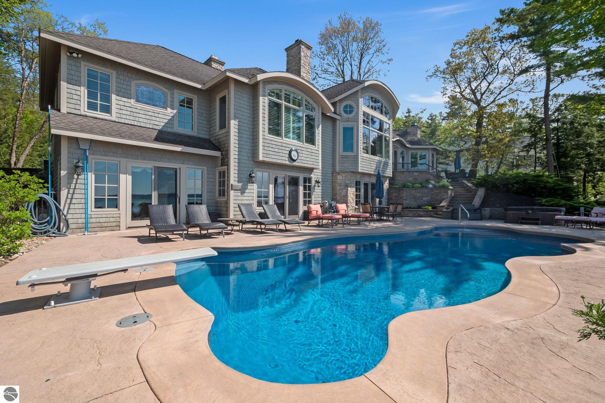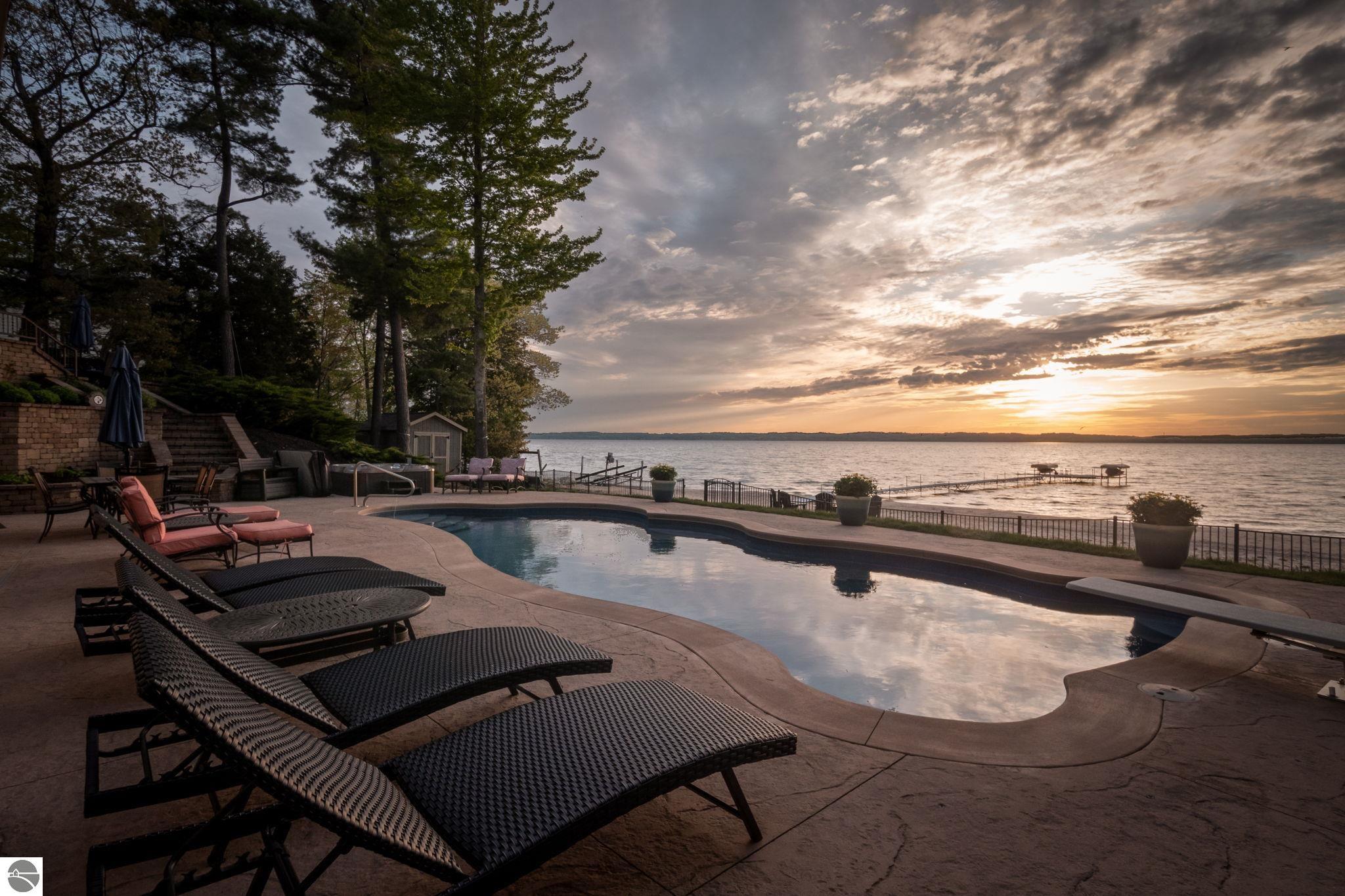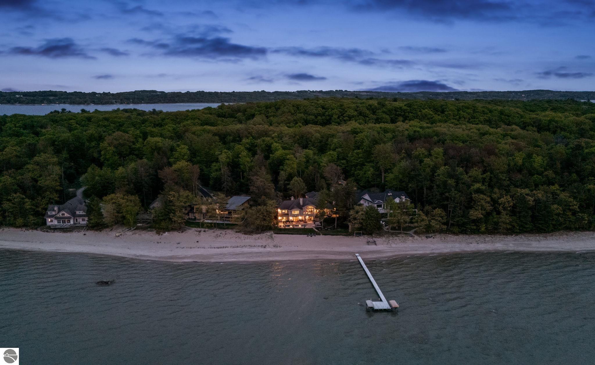 The name says it all-Beautiful Shores. This extraordinary property offers 150' of private West Grand Traverse Bay frontage with a beautiful sandy beach and sweeping west-facing views of Power Island and unforgettable sunsets. A true reflection of everything Traverse City has to offer. Set on an acre with incredible privacy, this 6300-square-foot Craftsman-style home was built by one of the areas top builders and exudes warmth, quality and character throughout. With four very sizable bedrooms, ensuites in the lower level and a jaw dropping master bath on the main floor the layout is functional and inviting. The closet space in this home is exceptional with solid built-ins in each of them. The heart of the home is a gourmet kitchen quipped with high-end appliances and top of the line timeless cabinetry. Just off the kitchen prepare to be in love with this thoughtfully designed multi-purpose mudroom, laundry room and a dedicated homework zone-perfect for the busy family. The lower level has a second laundry room, workout room and wet bar along with a comfortable and inviting family living space. Enjioy the ease of the elevator that goes to all three floors for convenience and generational assistance. "Above the garage, a private guest apartment-perfect for visiting family or in-laws, offers a full kitchenette, a spa like bath, and elevator access. A quiet space to make coffee, unwind and recharge after along day on the beach." Walls of windows flood the home with natural light and frame captivating views of the blue water. Outdoors, enjoy the lush, mature landscaping and a quiet, private drive with stone pillars-ready for a gate if added privacy is desired. A rare and coveted amenity: the added in-ground pool that overlooks West Bay, allowing you to swim and soak in the views. This once in a generation offering on one of Traverse City's most desirable shorelines. And those Sunsets!!!!