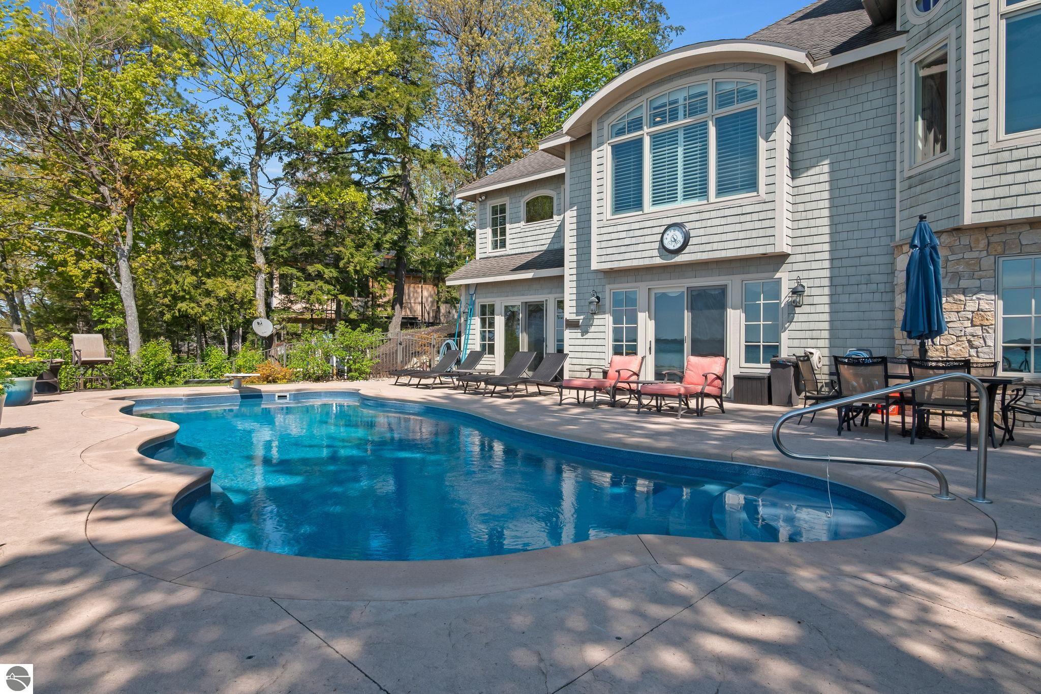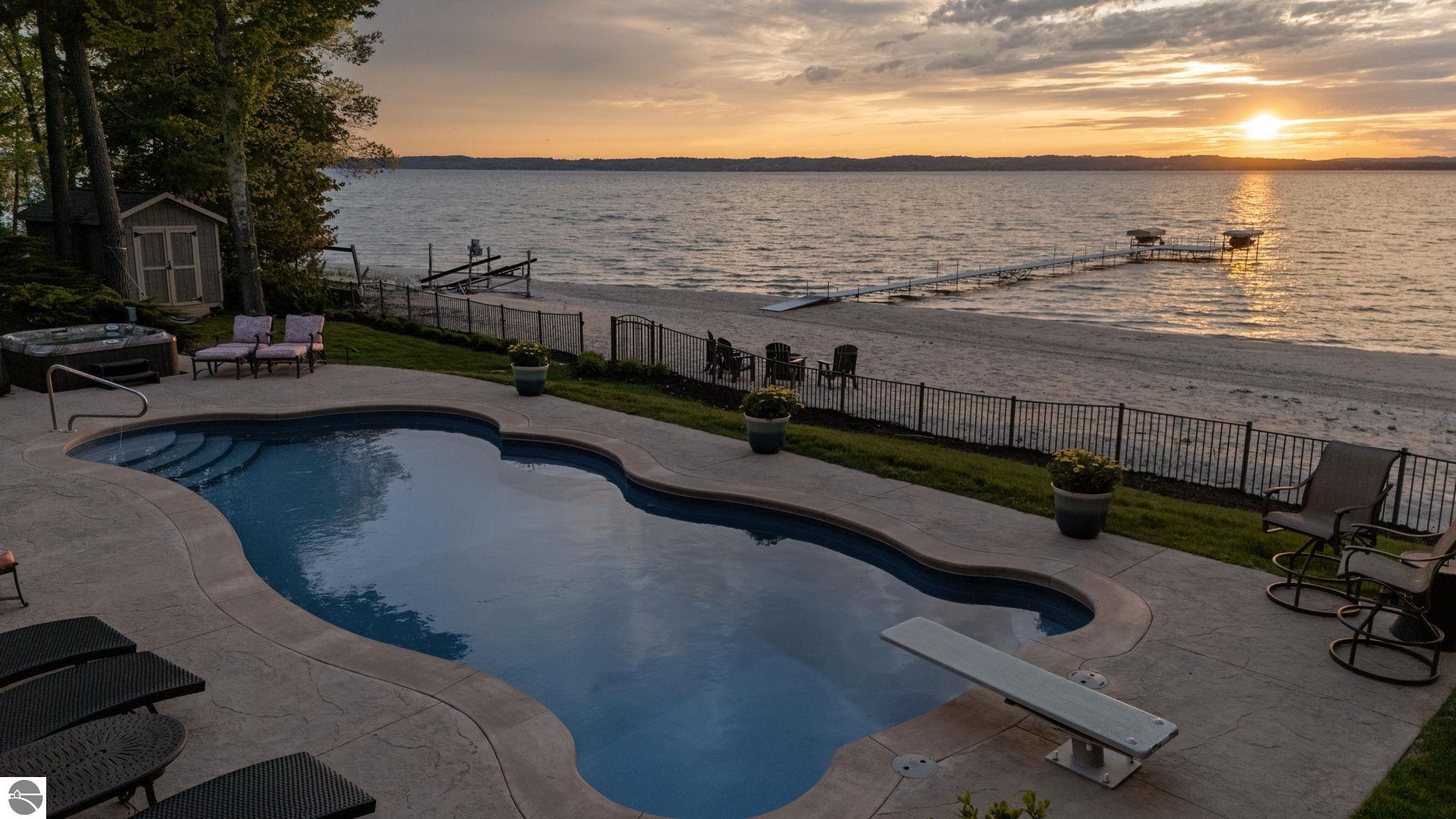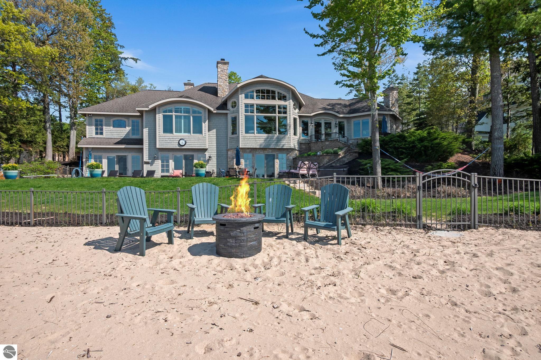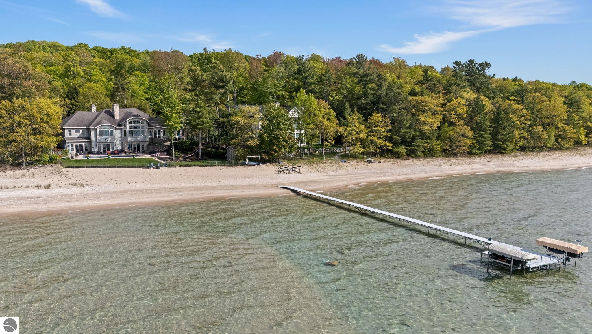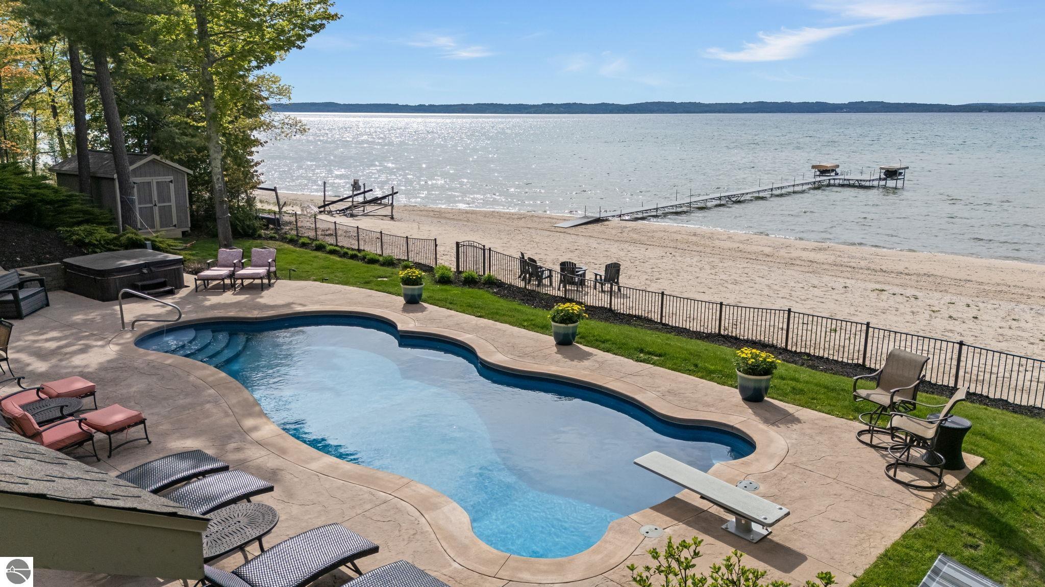 The name says it all-Beautiful Shores. This extraordinary property offers 150' of private West Grand Traverse Bay frontage with a beautiful sandy beach and sweeping west-facing views of Power Island and unforgettable sunsets. A true reflection of everything Traverse City has to offer. Set on an acre with incredible privacy, this 6300-square-foot Craftsman-style home was built by one of the areas top builders and exudes warmth, quality and character throughout. With four very sizable bedrooms, ensuites in the lower level and a jaw dropping master bath on the main floor the layout is functional and inviting. The closet space in this home is exceptional with solid built-ins in each of them. The heart of the home is a gourmet kitchen quipped with high-end appliances and top of the line timeless cabinetry. Just off the kitchen prepare to be in love with this thoughtfully designed multi-purpose mudroom, laundry room and a dedicated homework zone-perfect for the busy family. The lower level has a second laundry room, workout room and wet bar along with a comfortable and inviting family living space. Enjioy the ease of the elevator that goes to all three floors for convenience and generational assistance. "Above the garage, a private guest apartment-perfect for visiting family or in-laws, offers a full kitchenette, a spa like bath, and elevator access. A quiet space to make coffee, unwind and recharge after along day on the beach." Walls of windows flood the home with natural light and frame captivating views of the blue water. Outdoors, enjoy the lush, mature landscaping and a quiet, private drive with stone pillars-ready for a gate if added privacy is desired. A rare and coveted amenity: the added in-ground pool that overlooks West Bay, allowing you to swim and soak in the views. This once in a generation offering on one of Traverse City's most desirable shorelines. And those Sunsets!!!!