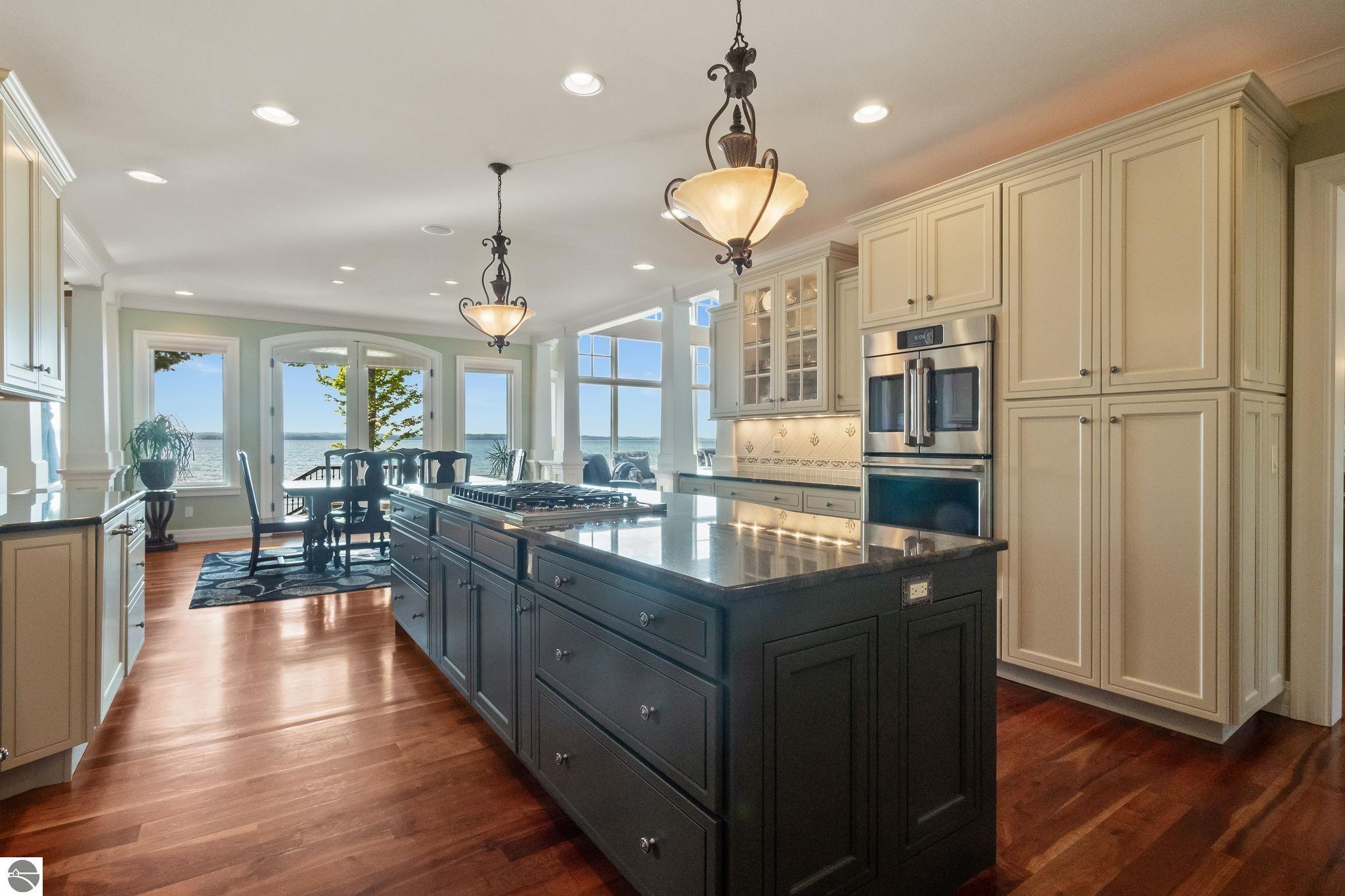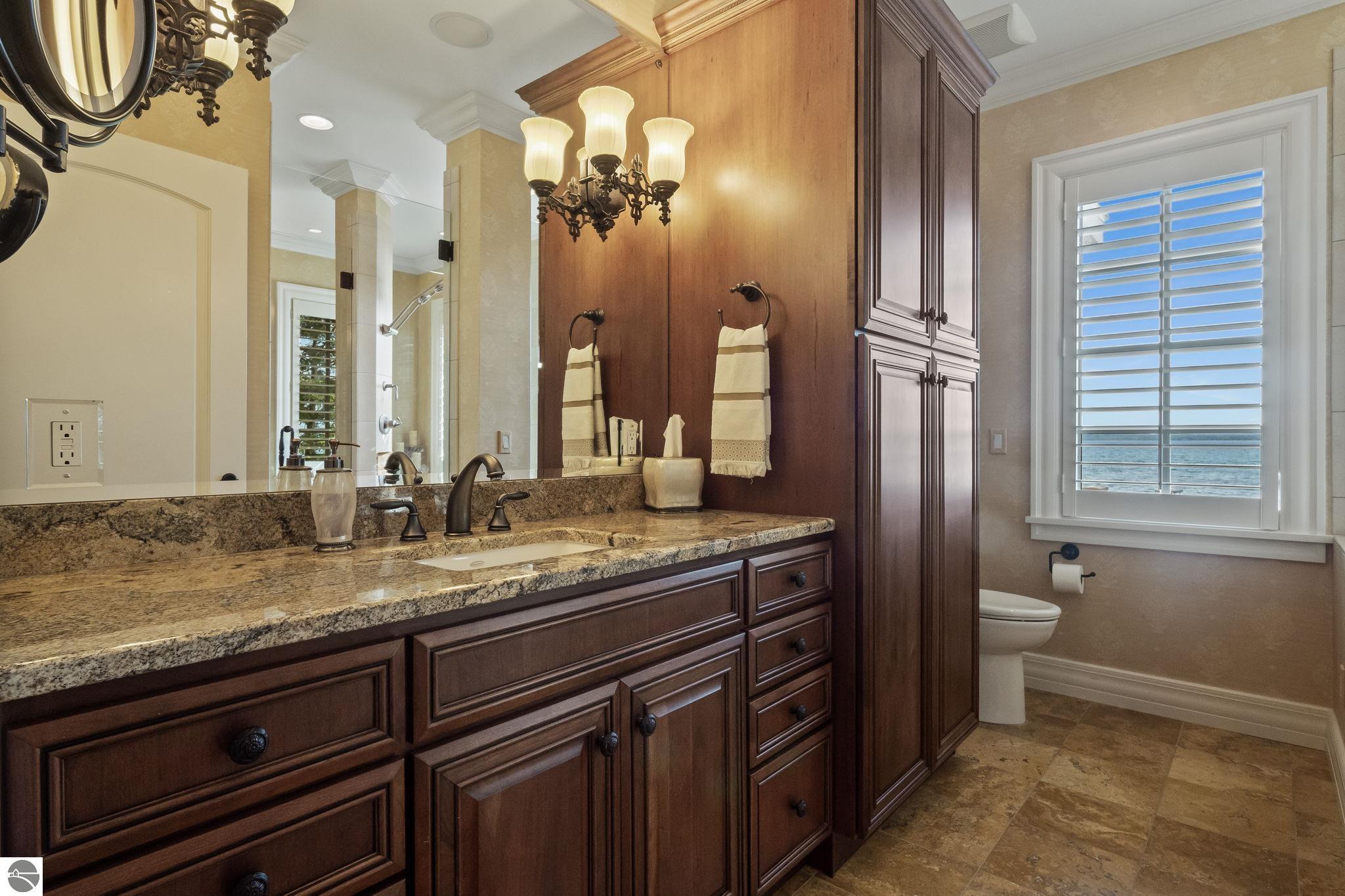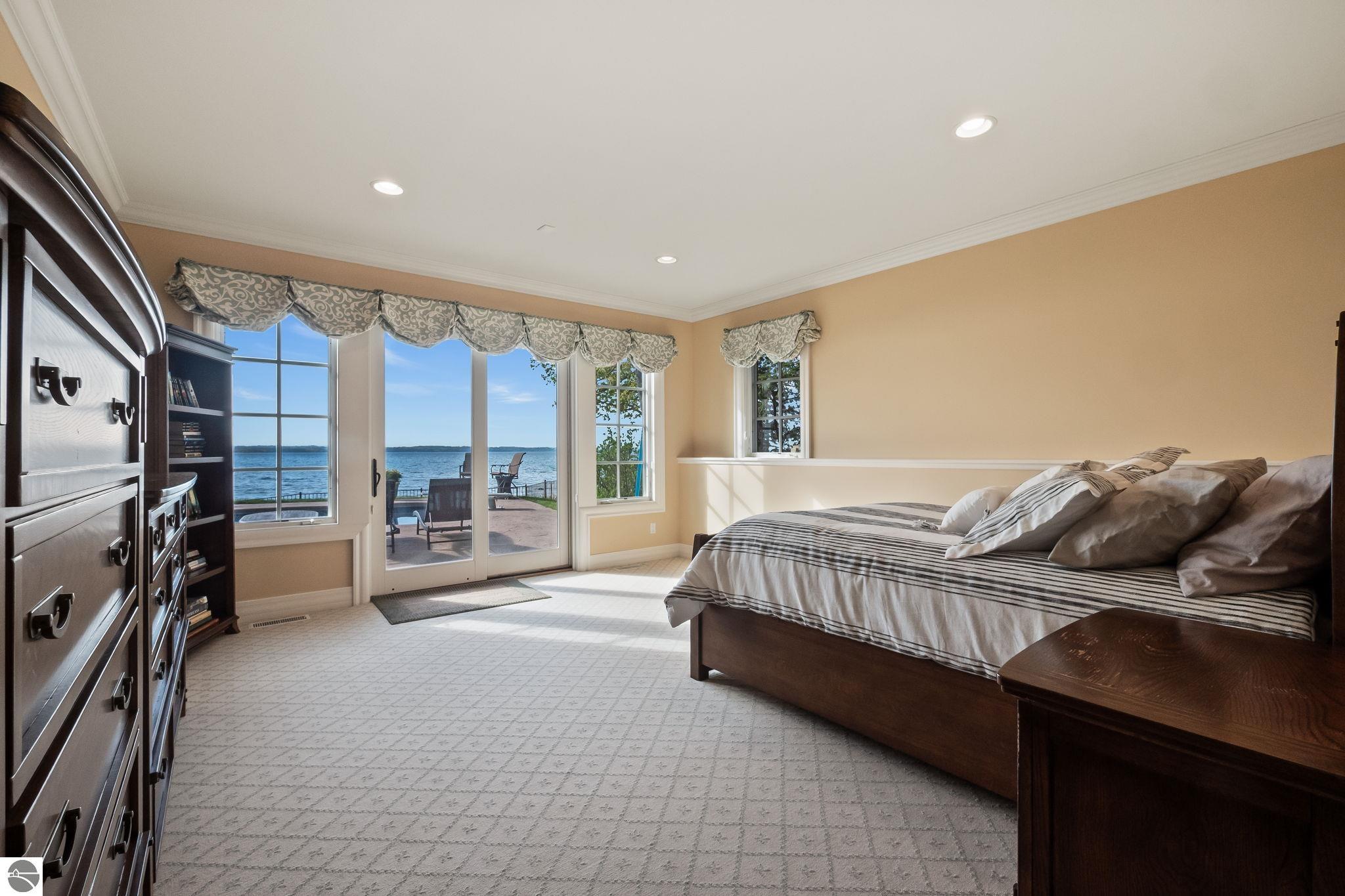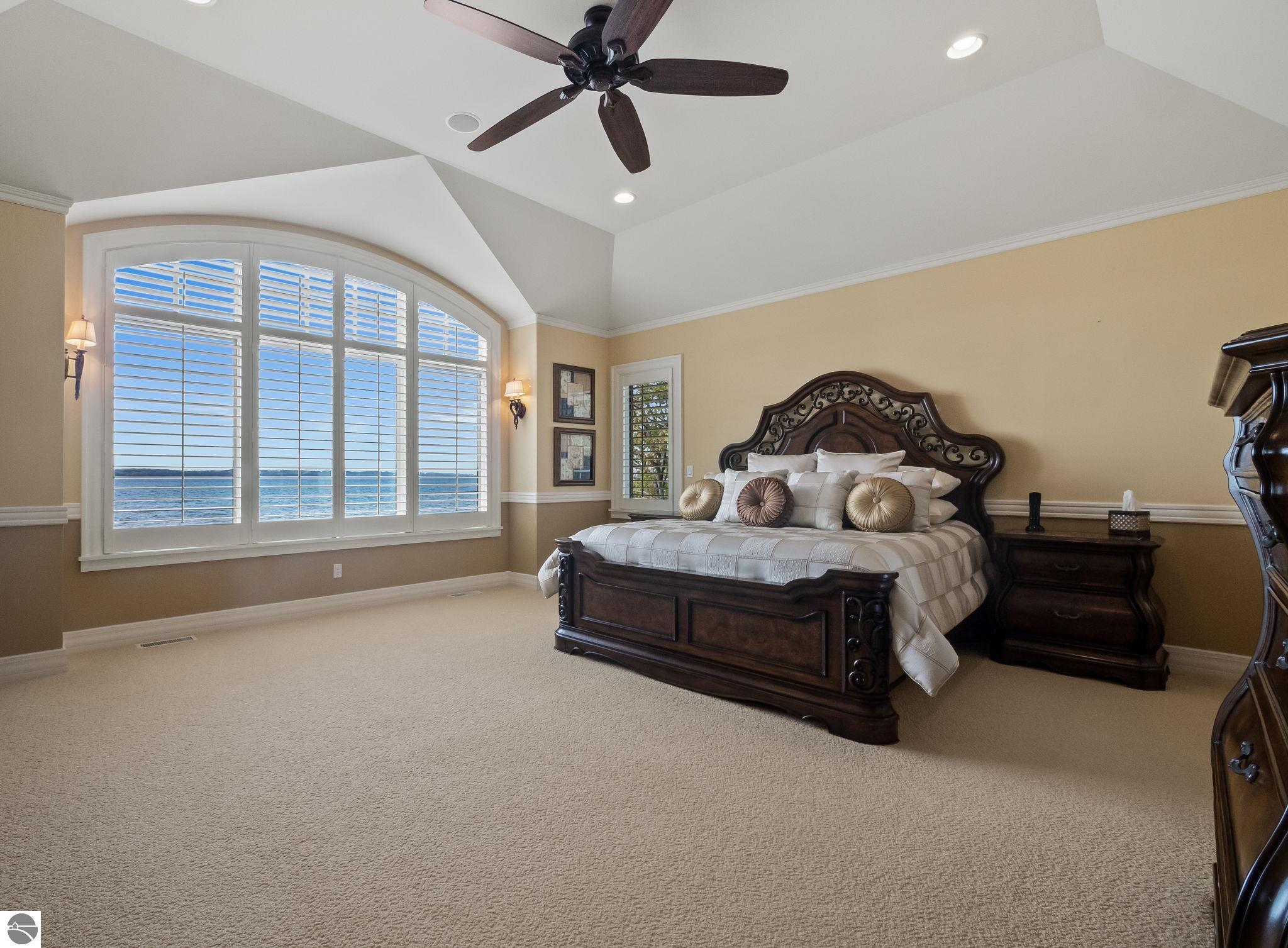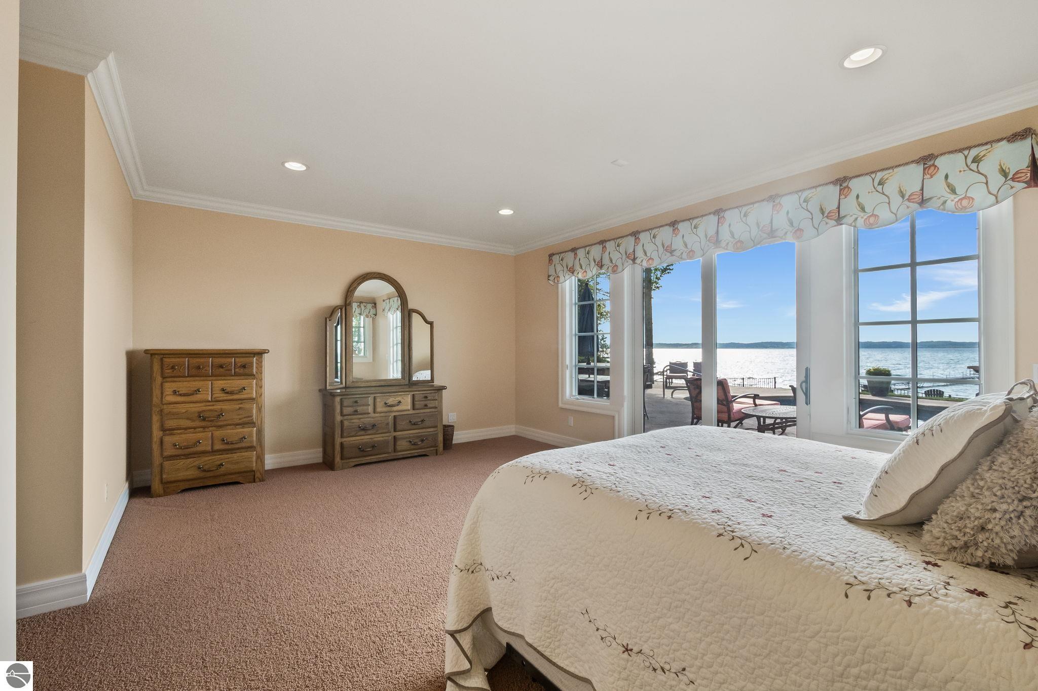 The name says it all-Beautiful Shores. This extraordinary property offers 150' of private West Grand Traverse Bay frontage with a beautiful sandy beach and sweeping west-facing views of Power Island and unforgettable sunsets. A true reflection of everything Traverse City has to offer. Set on an acre with incredible privacy, this 6300-square-foot Craftsman-style home was built by one of the areas top builders and exudes warmth, quality and character throughout. With four very sizable bedrooms, ensuites in the lower level and a jaw dropping master bath on the main floor the layout is functional and inviting. The closet space in this home is exceptional with solid built-ins in each of them. The heart of the home is a gourmet kitchen quipped with high-end appliances and top of the line timeless cabinetry. Just off the kitchen prepare to be in love with this thoughtfully designed multi-purpose mudroom, laundry room and a dedicated homework zone-perfect for the busy family. The lower level has a second laundry room, workout room and wet bar along with a comfortable and inviting family living space. Enjioy the ease of the elevator that goes to all three floors for convenience and generational assistance. "Above the garage, a private guest apartment-perfect for visiting family or in-laws, offers a full kitchenette, a spa like bath, and elevator access. A quiet space to make coffee, unwind and recharge after along day on the beach." Walls of windows flood the home with natural light and frame captivating views of the blue water. Outdoors, enjoy the lush, mature landscaping and a quiet, private drive with stone pillars-ready for a gate if added privacy is desired. A rare and coveted amenity: the added in-ground pool that overlooks West Bay, allowing you to swim and soak in the views. This once in a generation offering on one of Traverse City's most desirable shorelines. And those Sunsets!!!!