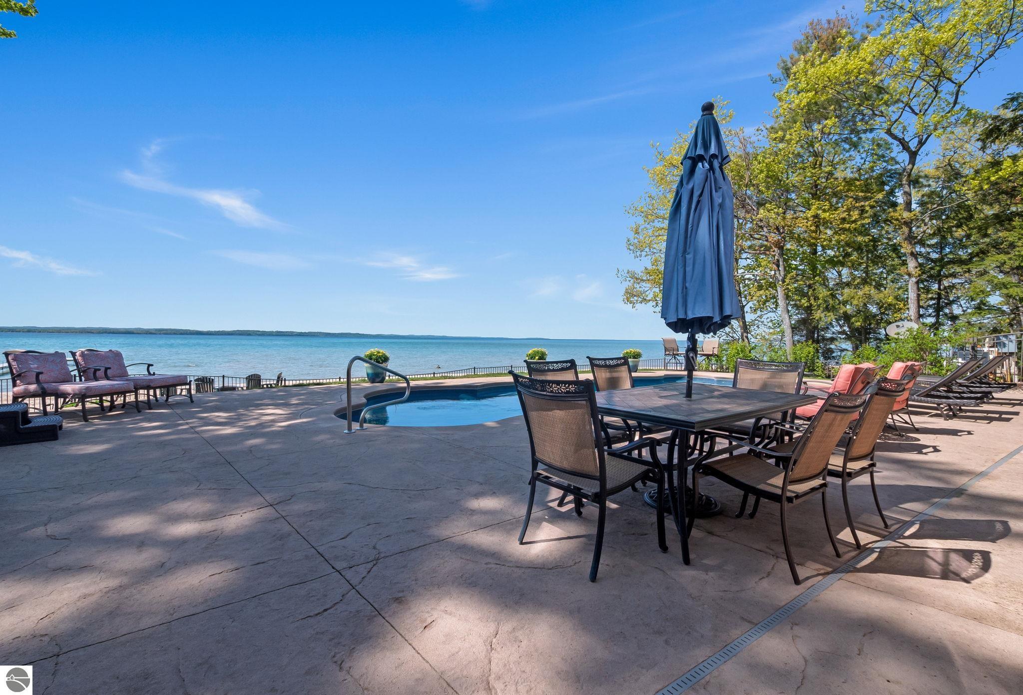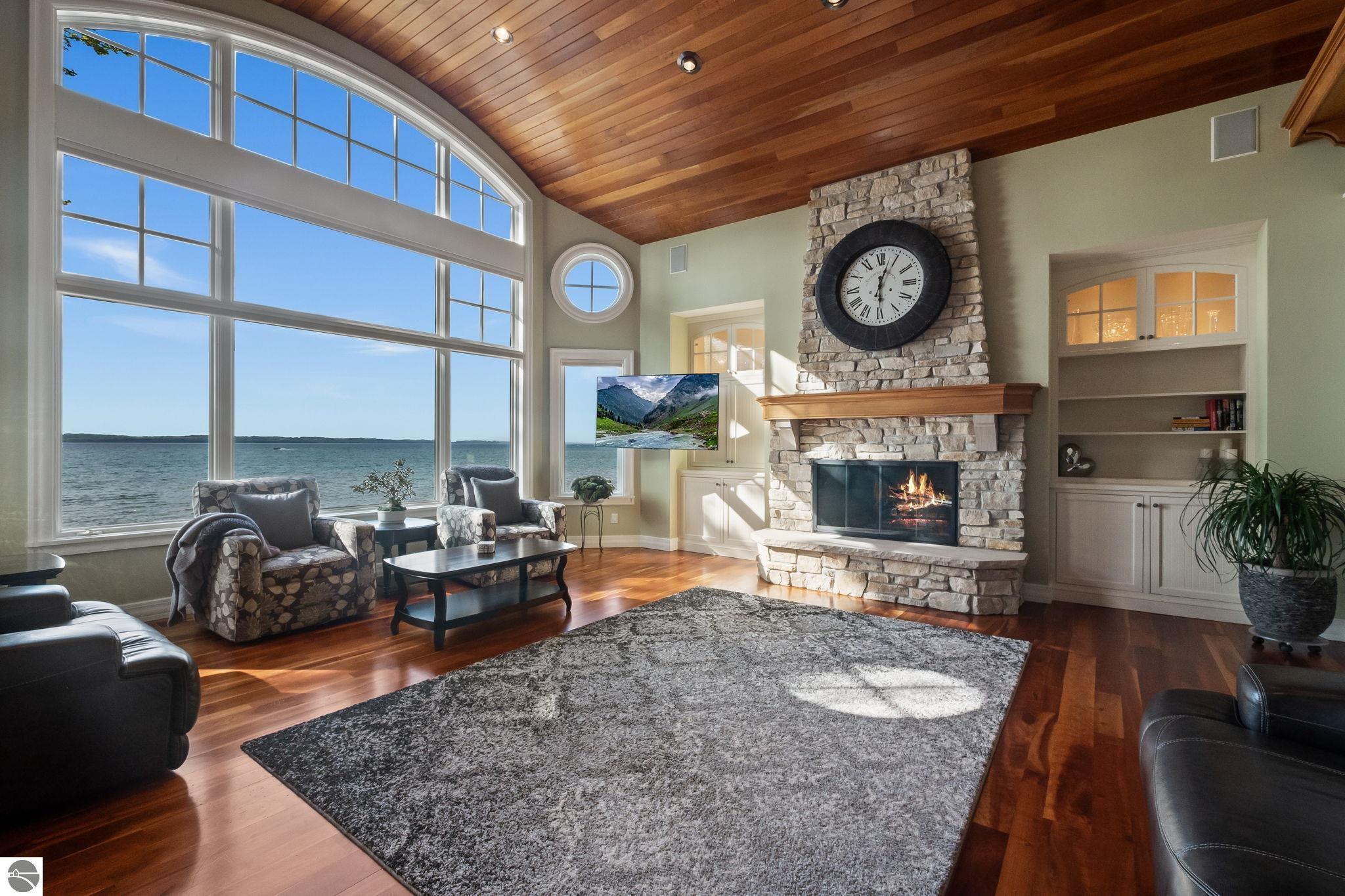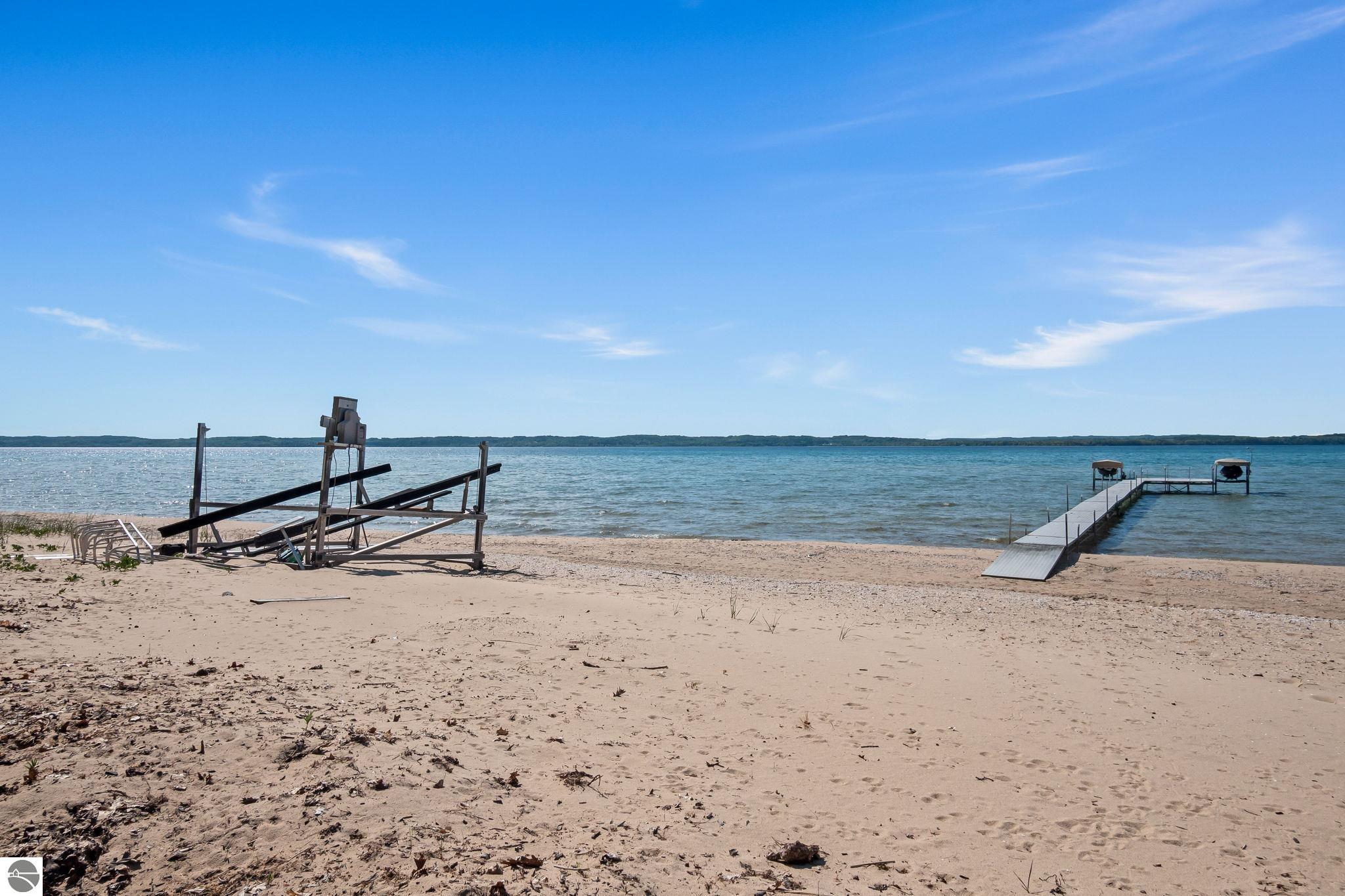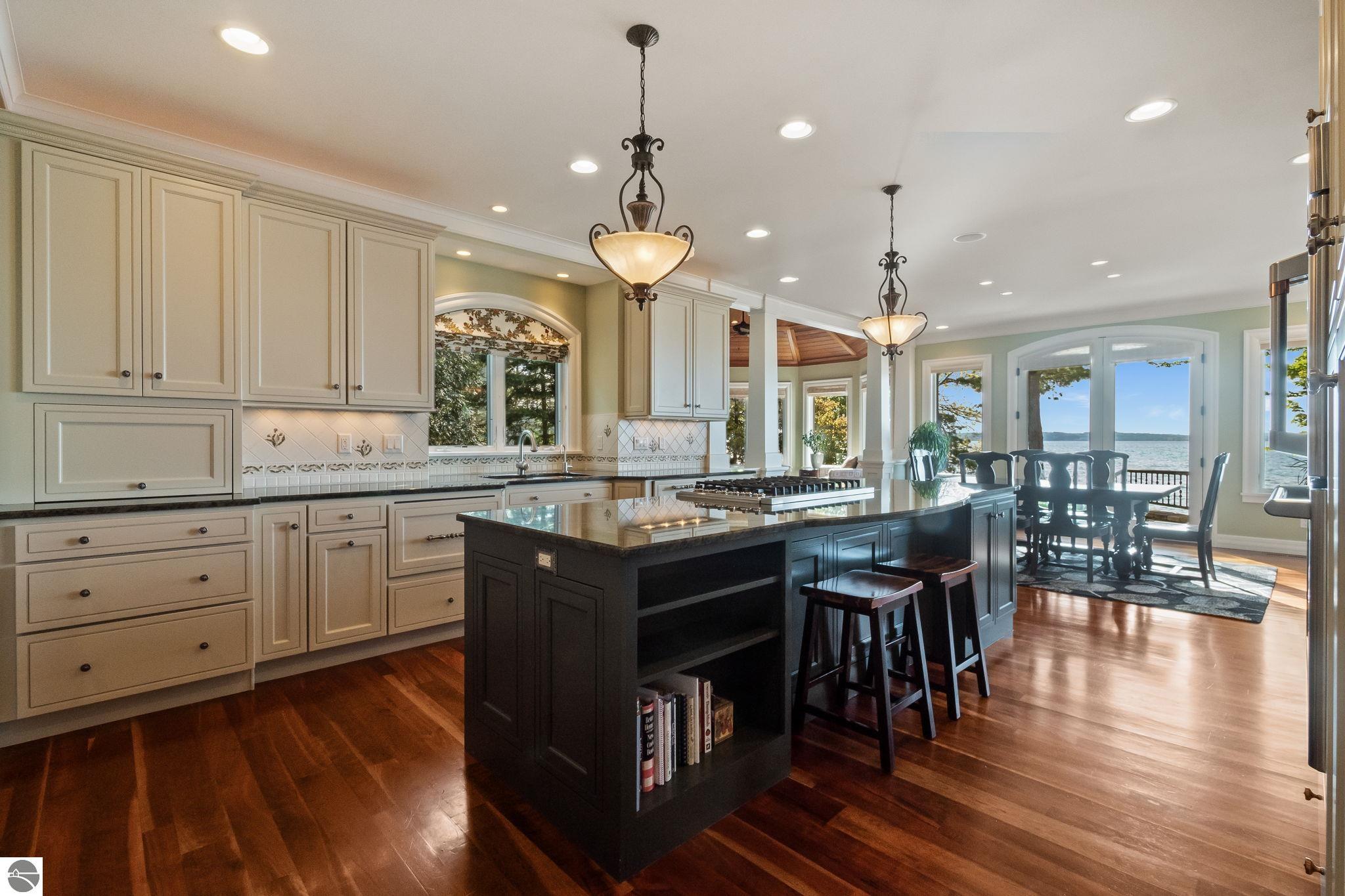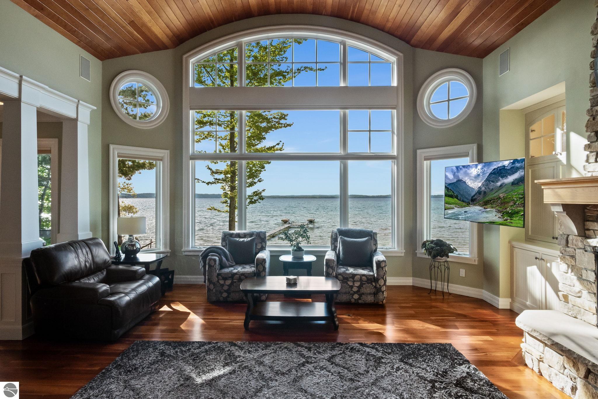 The name says it all-Beautiful Shores. This extraordinary property offers 150' of private West Grand Traverse Bay frontage with a beautiful sandy beach and sweeping west-facing views of Power Island and unforgettable sunsets. A true reflection of everything Traverse City has to offer. Set on an acre with incredible privacy, this 6300-square-foot Craftsman-style home was built by one of the areas top builders and exudes warmth, quality and character throughout. With four very sizable bedrooms, ensuites in the lower level and a jaw dropping master bath on the main floor the layout is functional and inviting. The closet space in this home is exceptional with solid built-ins in each of them. The heart of the home is a gourmet kitchen quipped with high-end appliances and top of the line timeless cabinetry. Just off the kitchen prepare to be in love with this thoughtfully designed multi-purpose mudroom, laundry room and a dedicated homework zone-perfect for the busy family. The lower level has a second laundry room, workout room and wet bar along with a comfortable and inviting family living space. Enjioy the ease of the elevator that goes to all three floors for convenience and generational assistance. "Above the garage, a private guest apartment-perfect for visiting family or in-laws, offers a full kitchenette, a spa like bath, and elevator access. A quiet space to make coffee, unwind and recharge after along day on the beach." Walls of windows flood the home with natural light and frame captivating views of the blue water. Outdoors, enjoy the lush, mature landscaping and a quiet, private drive with stone pillars-ready for a gate if added privacy is desired. A rare and coveted amenity: the added in-ground pool that overlooks West Bay, allowing you to swim and soak in the views. This once in a generation offering on one of Traverse City's most desirable shorelines. And those Sunsets!!!!