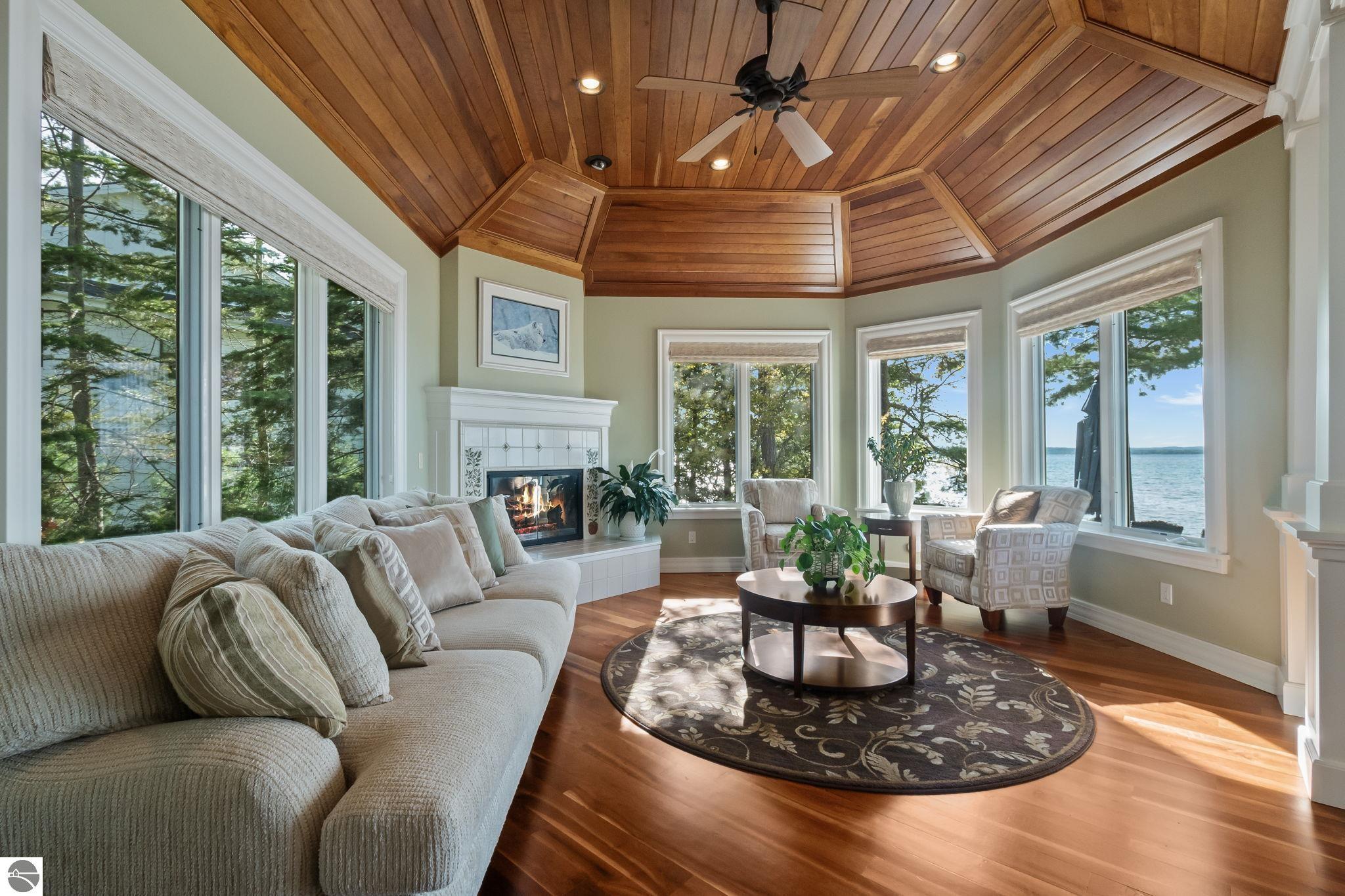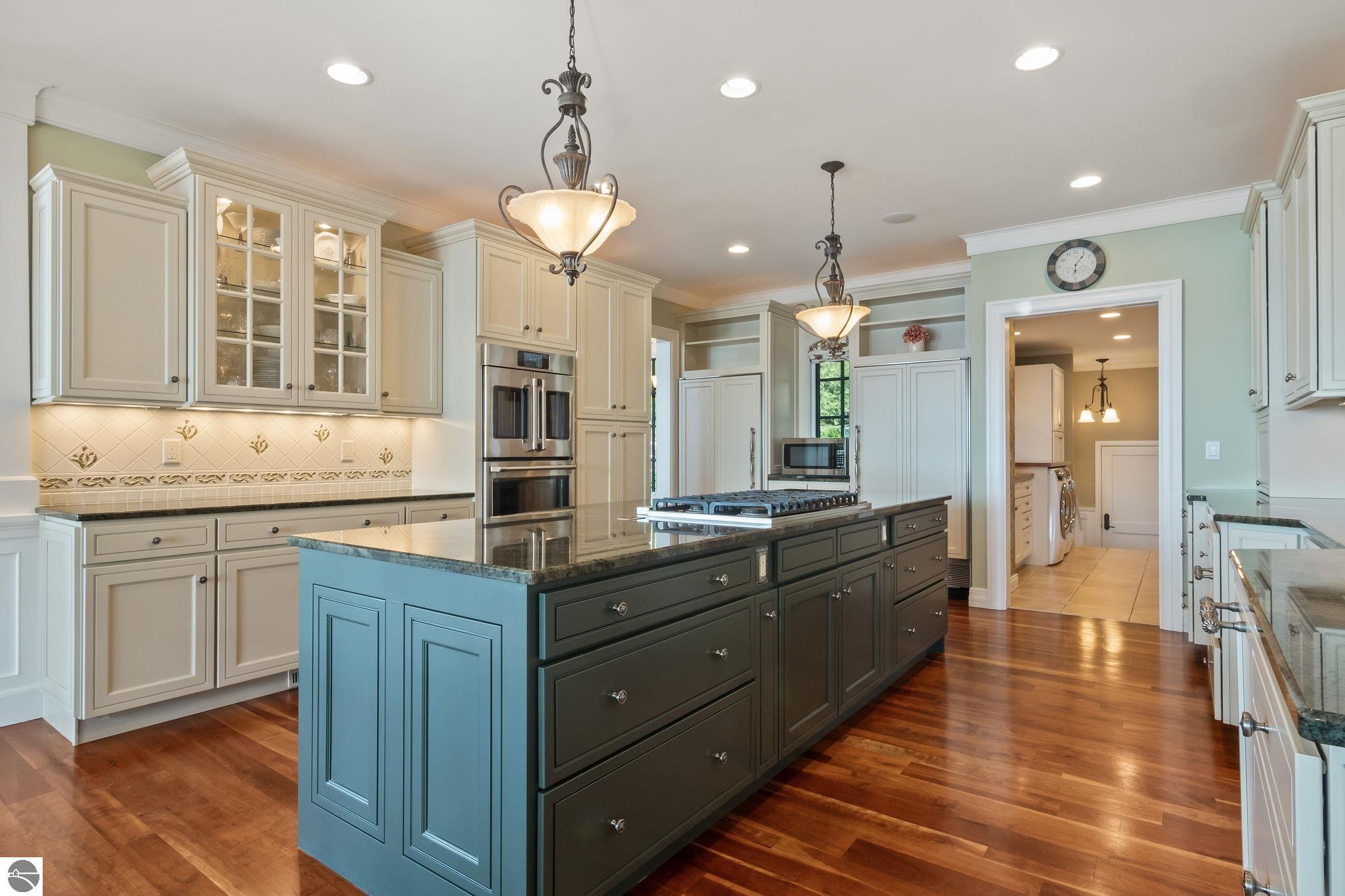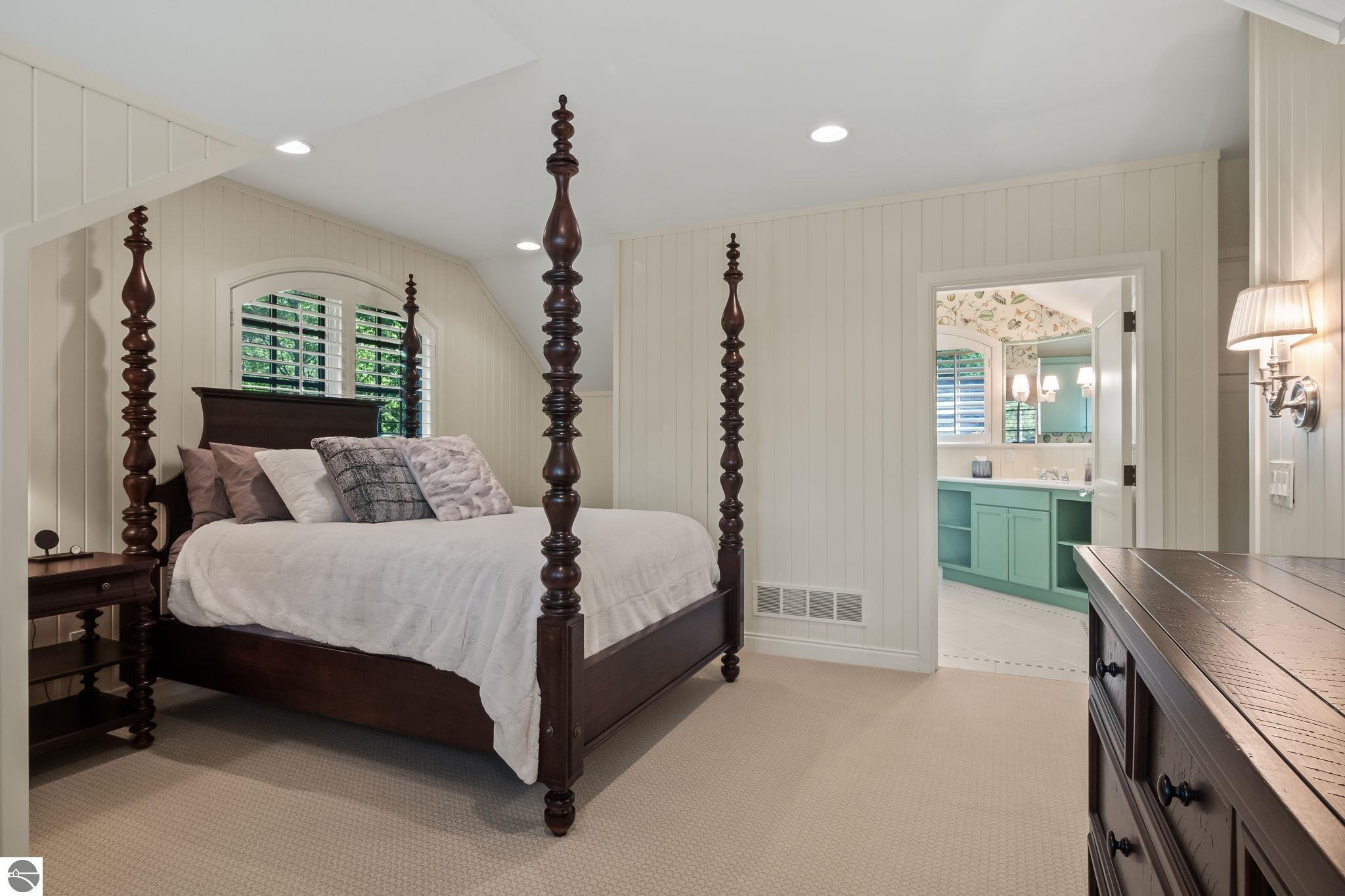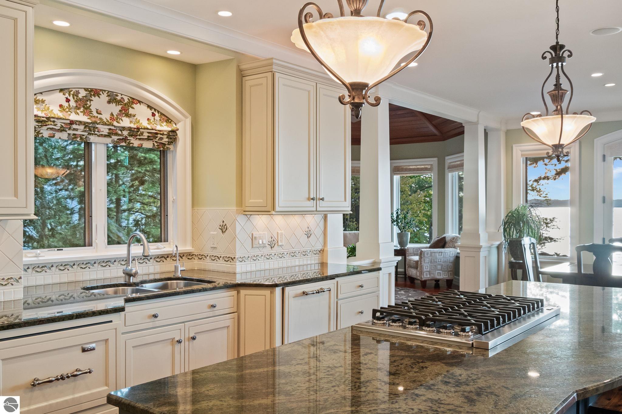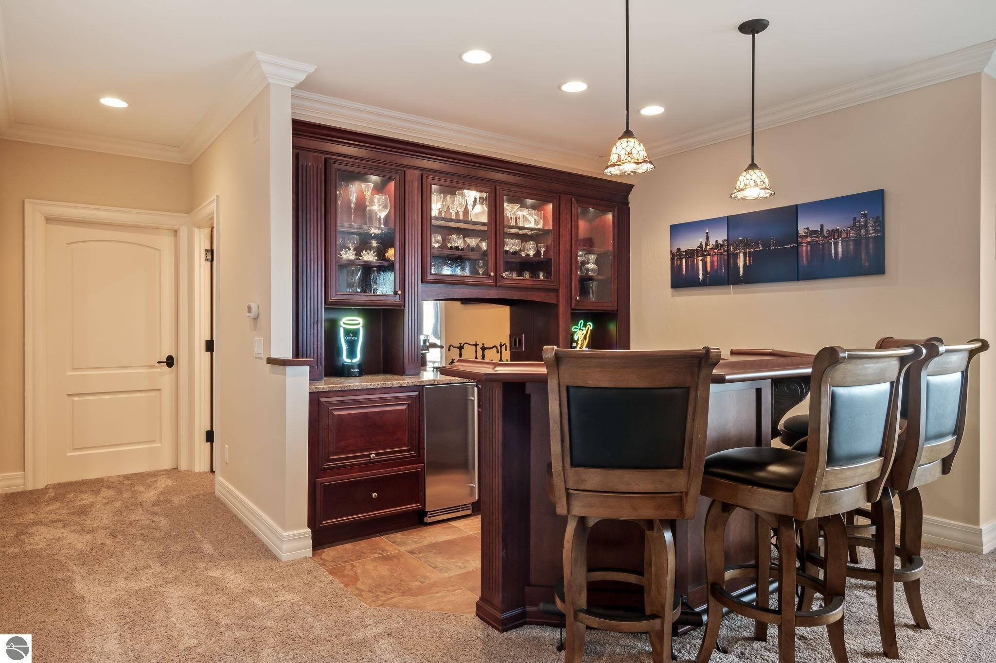 The name says it all-Beautiful Shores. This extraordinary property offers 150' of private West Grand Traverse Bay frontage with a beautiful sandy beach and sweeping west-facing views of Power Island and unforgettable sunsets. A true reflection of everything Traverse City has to offer. Set on an acre with incredible privacy, this 6300-square-foot Craftsman-style home was built by one of the areas top builders and exudes warmth, quality and character throughout. With four very sizable bedrooms, ensuites in the lower level and a jaw dropping master bath on the main floor the layout is functional and inviting. The closet space in this home is exceptional with solid built-ins in each of them. The heart of the home is a gourmet kitchen quipped with high-end appliances and top of the line timeless cabinetry. Just off the kitchen prepare to be in love with this thoughtfully designed multi-purpose mudroom, laundry room and a dedicated homework zone-perfect for the busy family. The lower level has a second laundry room, workout room and wet bar along with a comfortable and inviting family living space. Enjioy the ease of the elevator that goes to all three floors for convenience and generational assistance. "Above the garage, a private guest apartment-perfect for visiting family or in-laws, offers a full kitchenette, a spa like bath, and elevator access. A quiet space to make coffee, unwind and recharge after along day on the beach." Walls of windows flood the home with natural light and frame captivating views of the blue water. Outdoors, enjoy the lush, mature landscaping and a quiet, private drive with stone pillars-ready for a gate if added privacy is desired. A rare and coveted amenity: the added in-ground pool that overlooks West Bay, allowing you to swim and soak in the views. This once in a generation offering on one of Traverse City's most desirable shorelines. And those Sunsets!!!!