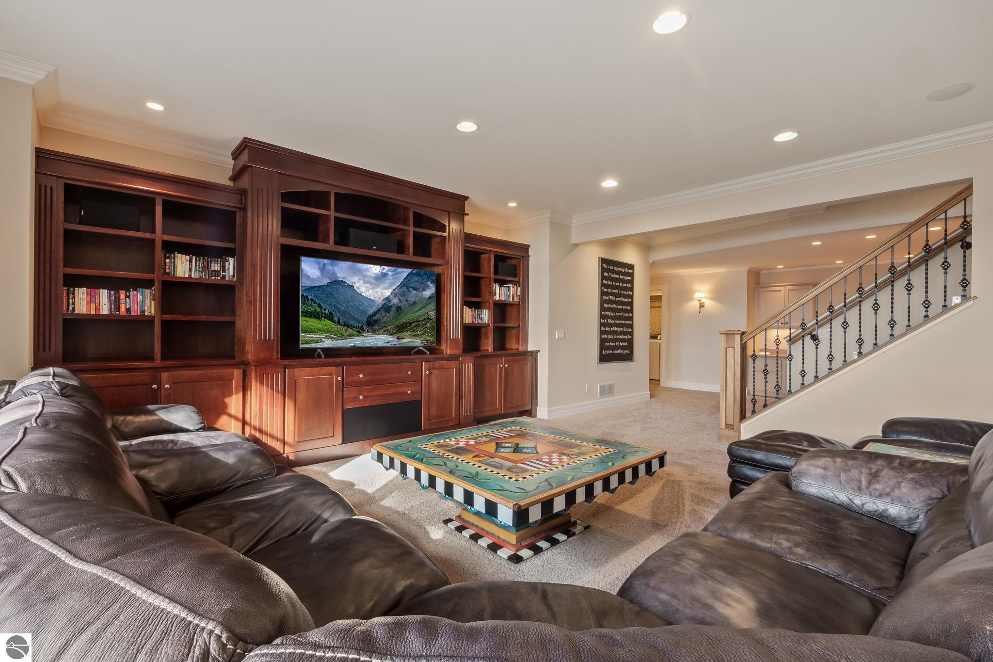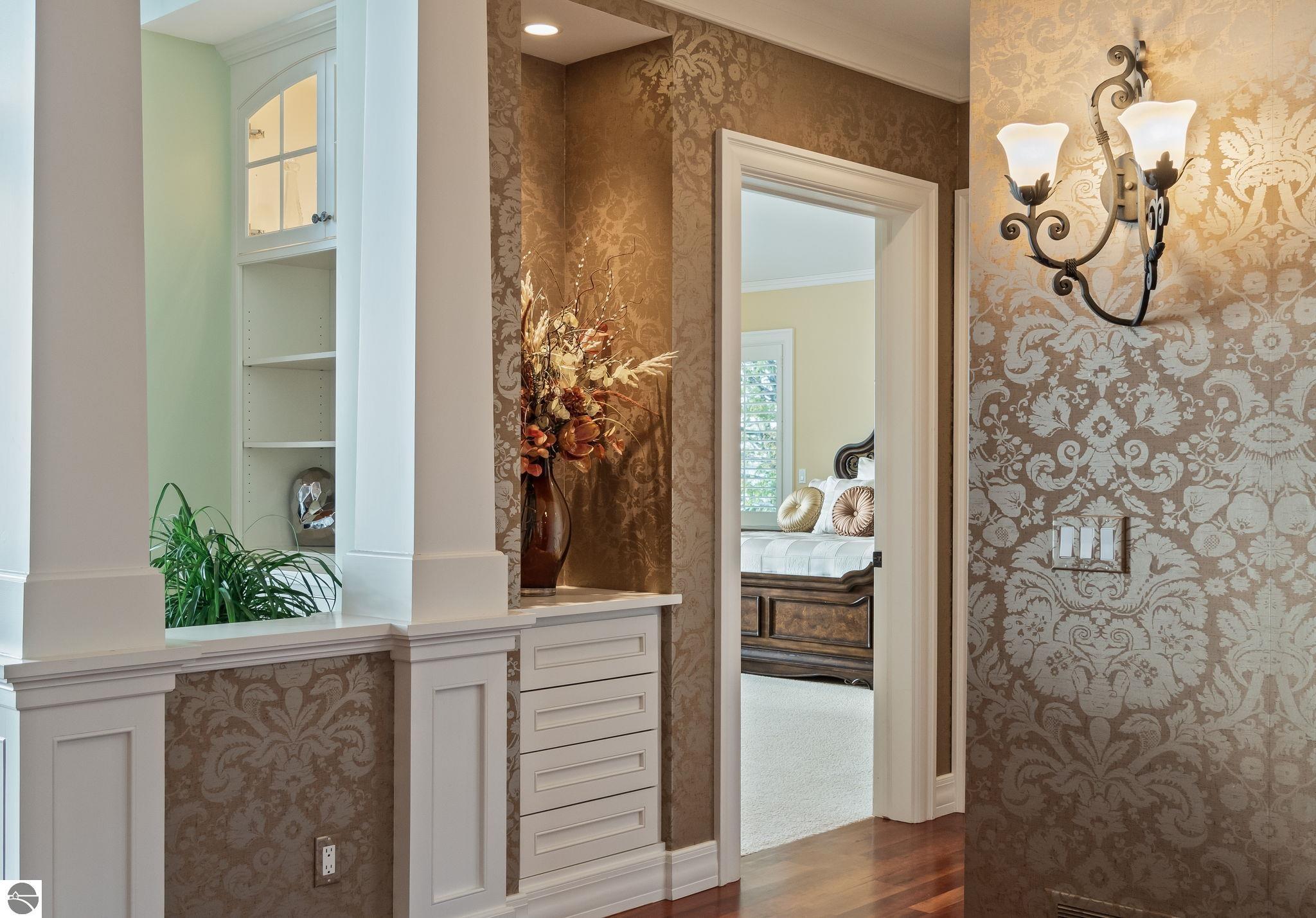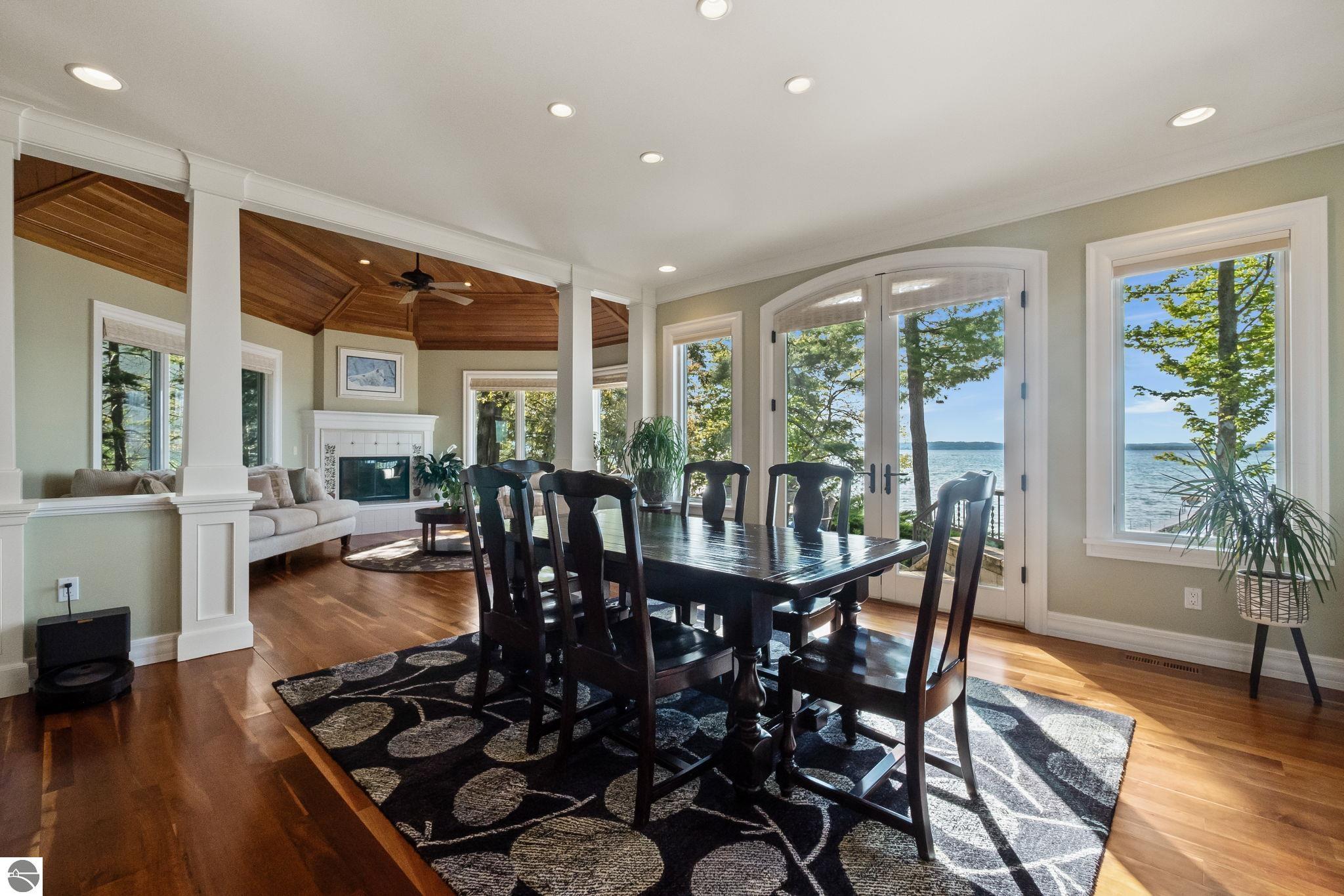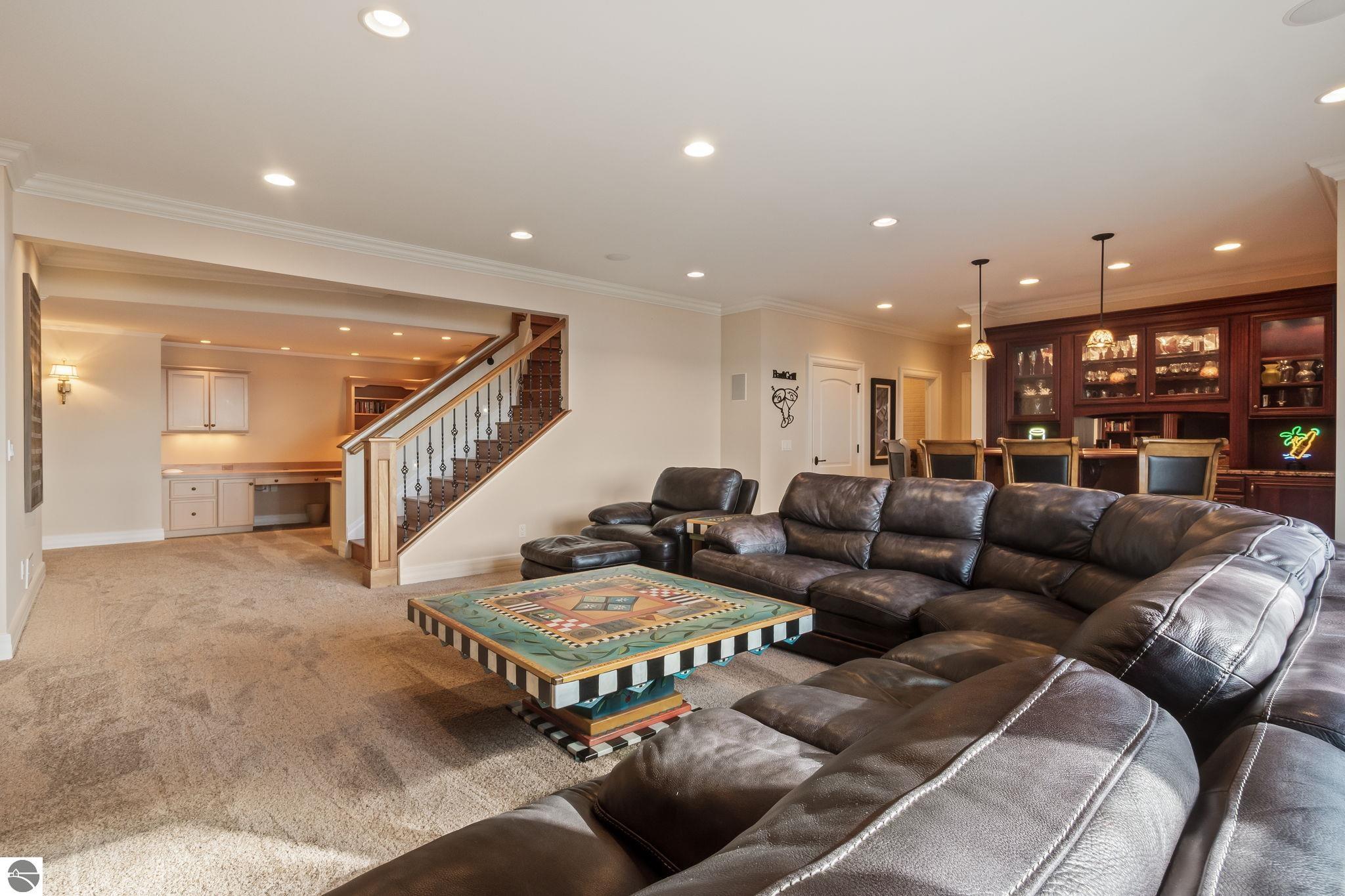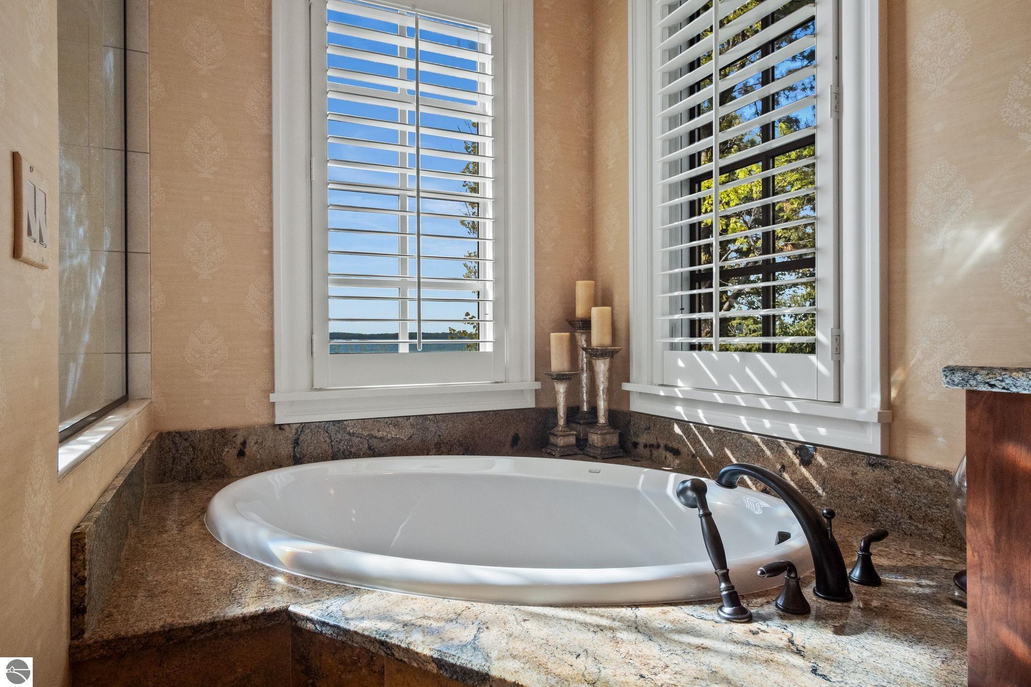 The name says it all-Beautiful Shores. This extraordinary property offers 150' of private West Grand Traverse Bay frontage with a beautiful sandy beach and sweeping west-facing views of Power Island and unforgettable sunsets. A true reflection of everything Traverse City has to offer. Set on an acre with incredible privacy, this 6300-square-foot Craftsman-style home was built by one of the areas top builders and exudes warmth, quality and character throughout. With four very sizable bedrooms, ensuites in the lower level and a jaw dropping master bath on the main floor the layout is functional and inviting. The closet space in this home is exceptional with solid built-ins in each of them. The heart of the home is a gourmet kitchen quipped with high-end appliances and top of the line timeless cabinetry. Just off the kitchen prepare to be in love with this thoughtfully designed multi-purpose mudroom, laundry room and a dedicated homework zone-perfect for the busy family. The lower level has a second laundry room, workout room and wet bar along with a comfortable and inviting family living space. Enjioy the ease of the elevator that goes to all three floors for convenience and generational assistance. "Above the garage, a private guest apartment-perfect for visiting family or in-laws, offers a full kitchenette, a spa like bath, and elevator access. A quiet space to make coffee, unwind and recharge after along day on the beach." Walls of windows flood the home with natural light and frame captivating views of the blue water. Outdoors, enjoy the lush, mature landscaping and a quiet, private drive with stone pillars-ready for a gate if added privacy is desired. A rare and coveted amenity: the added in-ground pool that overlooks West Bay, allowing you to swim and soak in the views. This once in a generation offering on one of Traverse City's most desirable shorelines. And those Sunsets!!!!