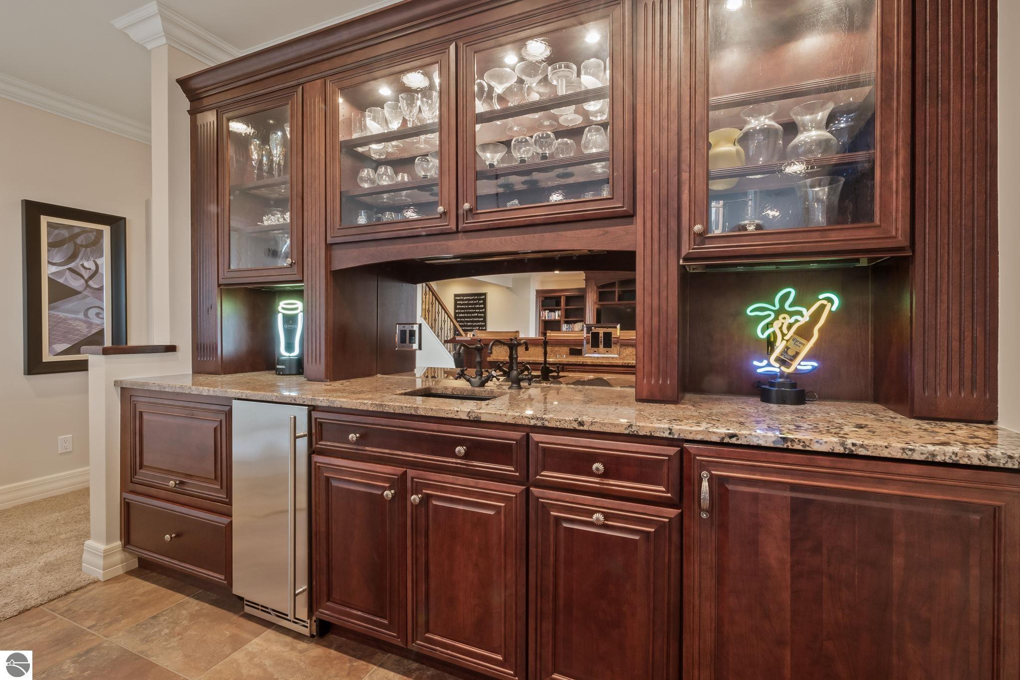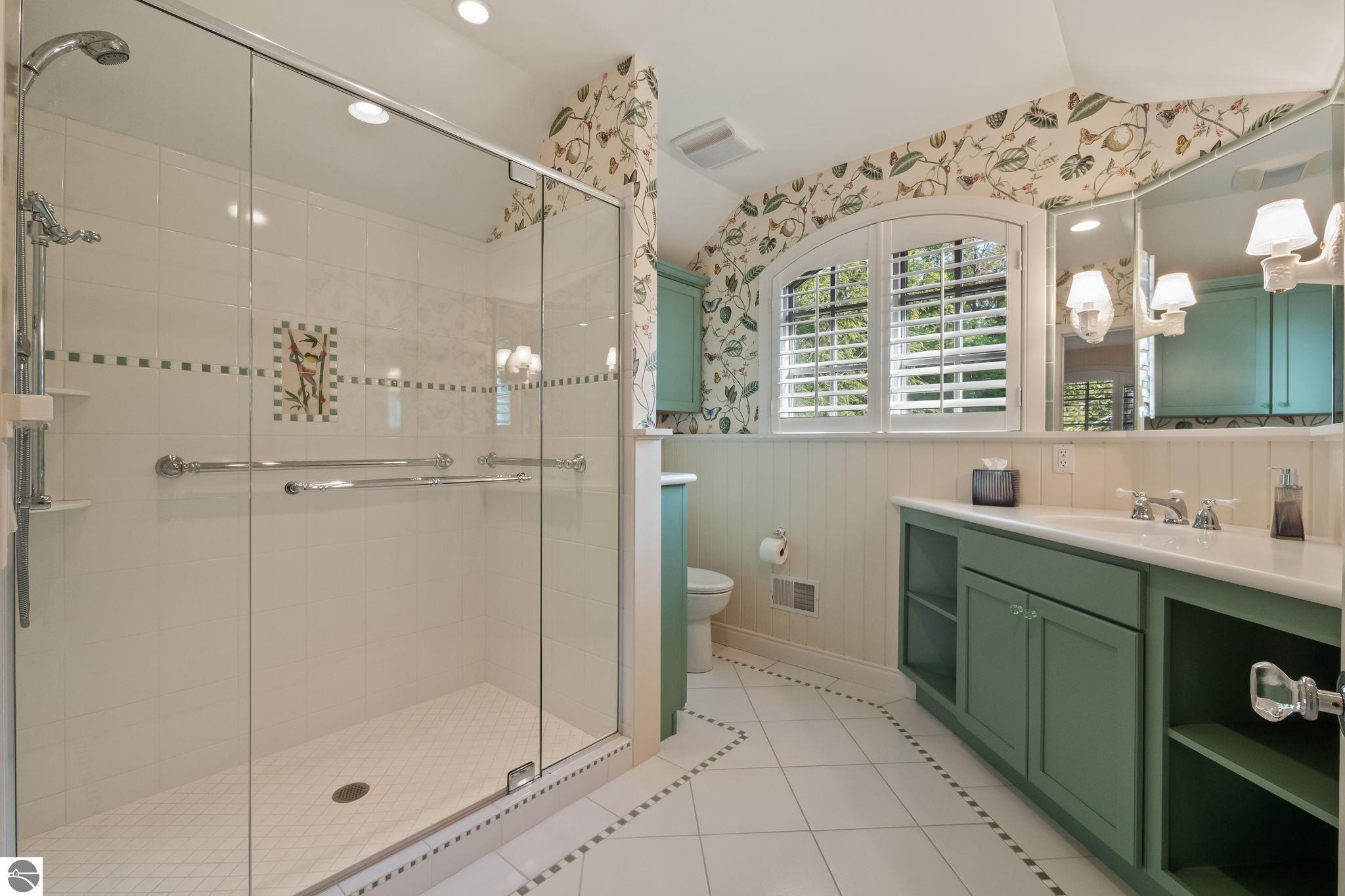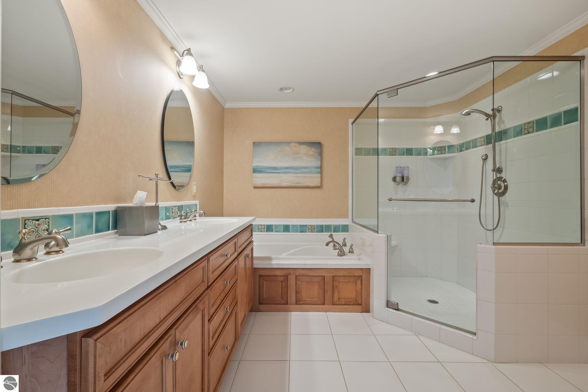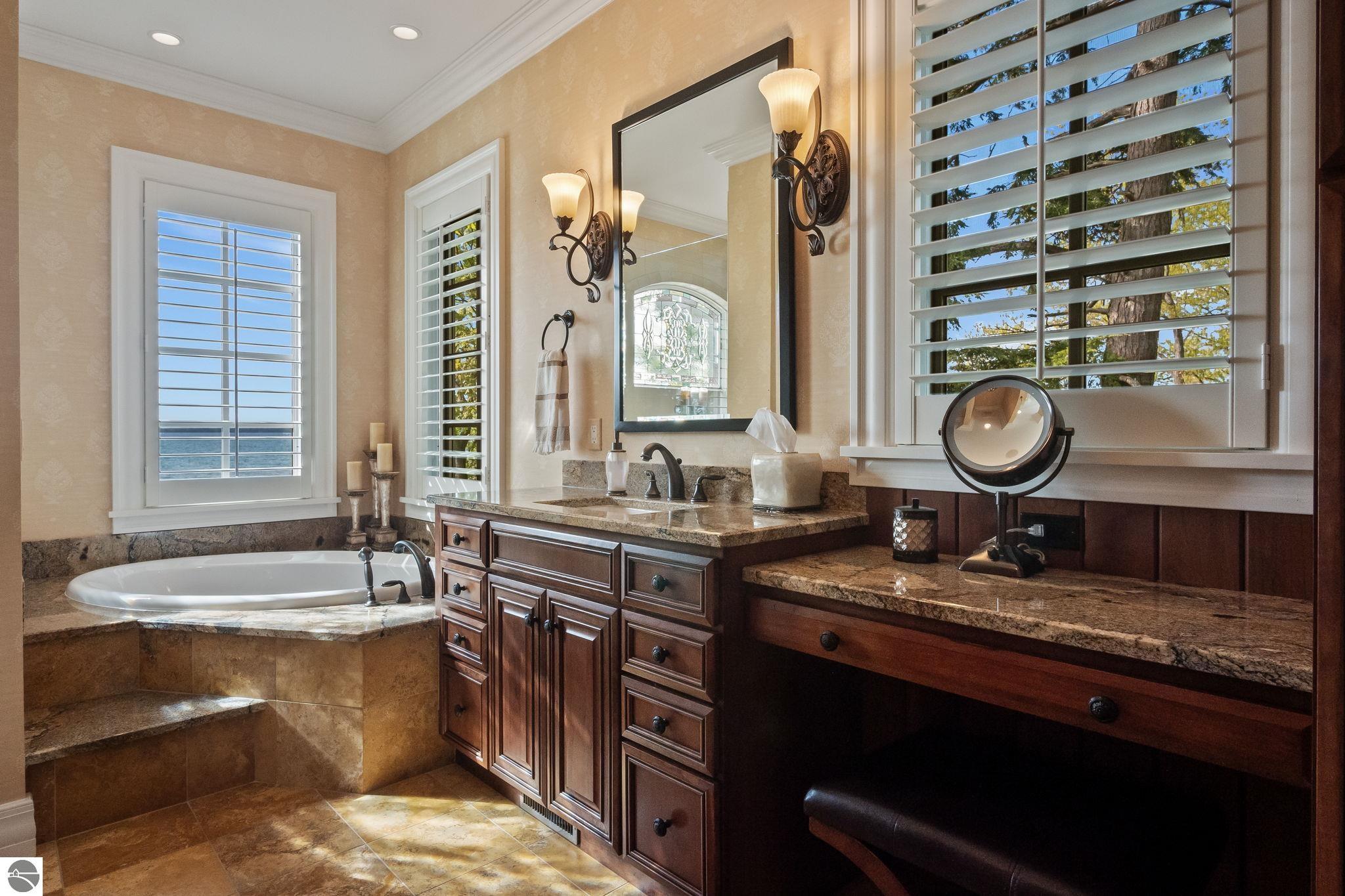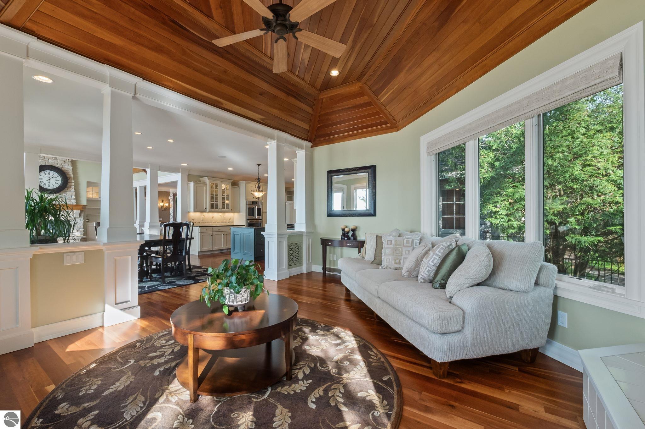 The name says it all-Beautiful Shores. This extraordinary property offers 150' of private West Grand Traverse Bay frontage with a beautiful sandy beach and sweeping west-facing views of Power Island and unforgettable sunsets. A true reflection of everything Traverse City has to offer. Set on an acre with incredible privacy, this 6300-square-foot Craftsman-style home was built by one of the areas top builders and exudes warmth, quality and character throughout. With four very sizable bedrooms, ensuites in the lower level and a jaw dropping master bath on the main floor the layout is functional and inviting. The closet space in this home is exceptional with solid built-ins in each of them. The heart of the home is a gourmet kitchen quipped with high-end appliances and top of the line timeless cabinetry. Just off the kitchen prepare to be in love with this thoughtfully designed multi-purpose mudroom, laundry room and a dedicated homework zone-perfect for the busy family. The lower level has a second laundry room, workout room and wet bar along with a comfortable and inviting family living space. Enjioy the ease of the elevator that goes to all three floors for convenience and generational assistance. "Above the garage, a private guest apartment-perfect for visiting family or in-laws, offers a full kitchenette, a spa like bath, and elevator access. A quiet space to make coffee, unwind and recharge after along day on the beach." Walls of windows flood the home with natural light and frame captivating views of the blue water. Outdoors, enjoy the lush, mature landscaping and a quiet, private drive with stone pillars-ready for a gate if added privacy is desired. A rare and coveted amenity: the added in-ground pool that overlooks West Bay, allowing you to swim and soak in the views. This once in a generation offering on one of Traverse City's most desirable shorelines. And those Sunsets!!!!